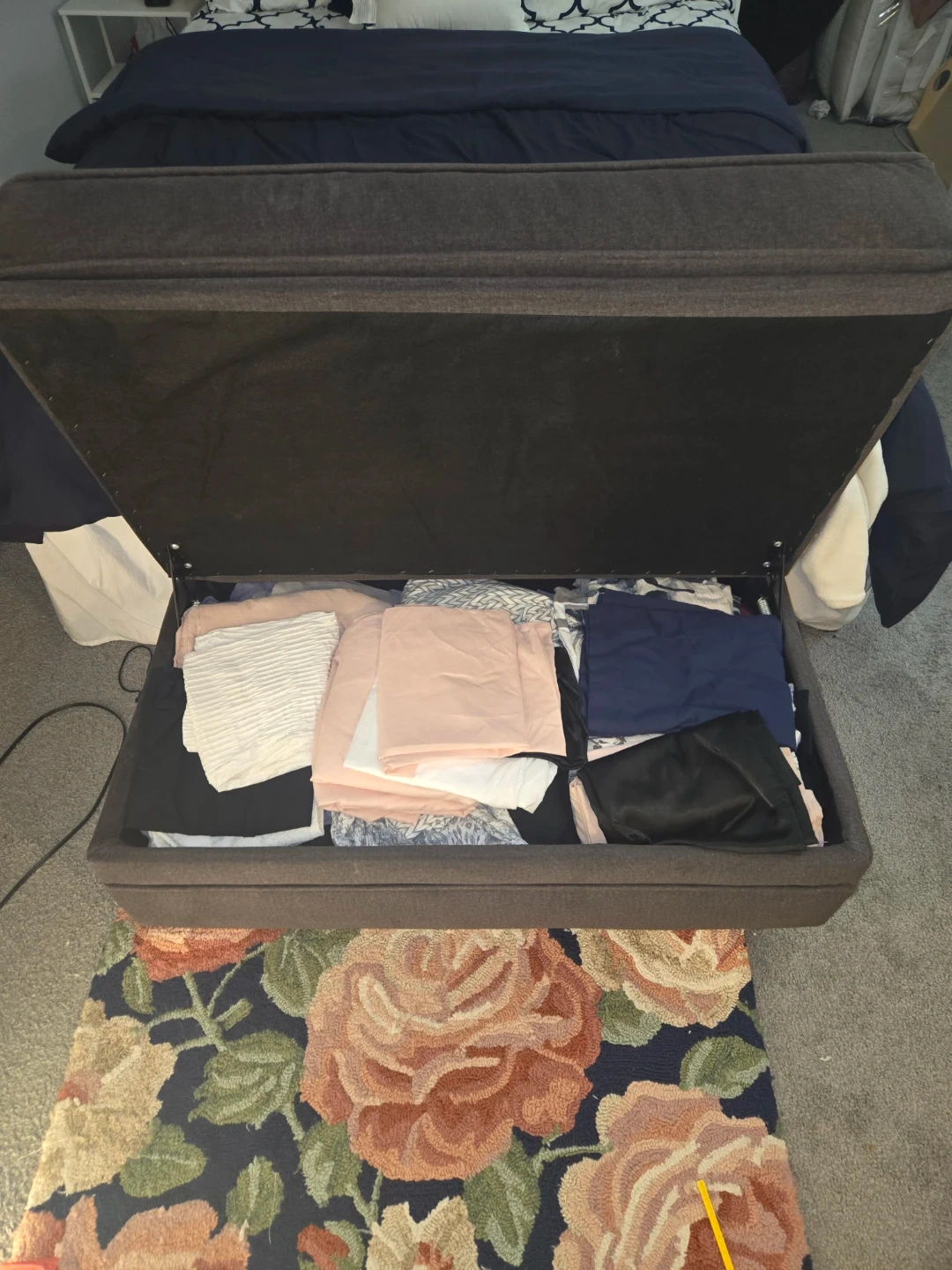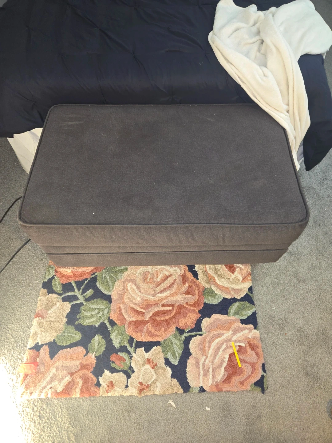 Selling a storage ottoman in good condition. It's great for storing blankets, clothes, or anything else you need to keep out of sight. The ottoman is a dark gray color and has a soft, cushioned top. It's perfect for adding extra seating or storage to any room.