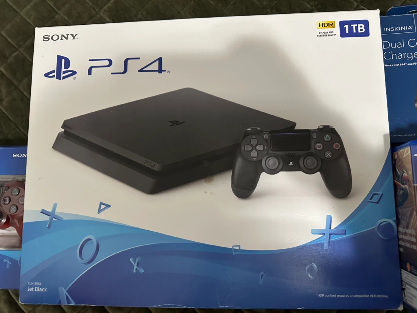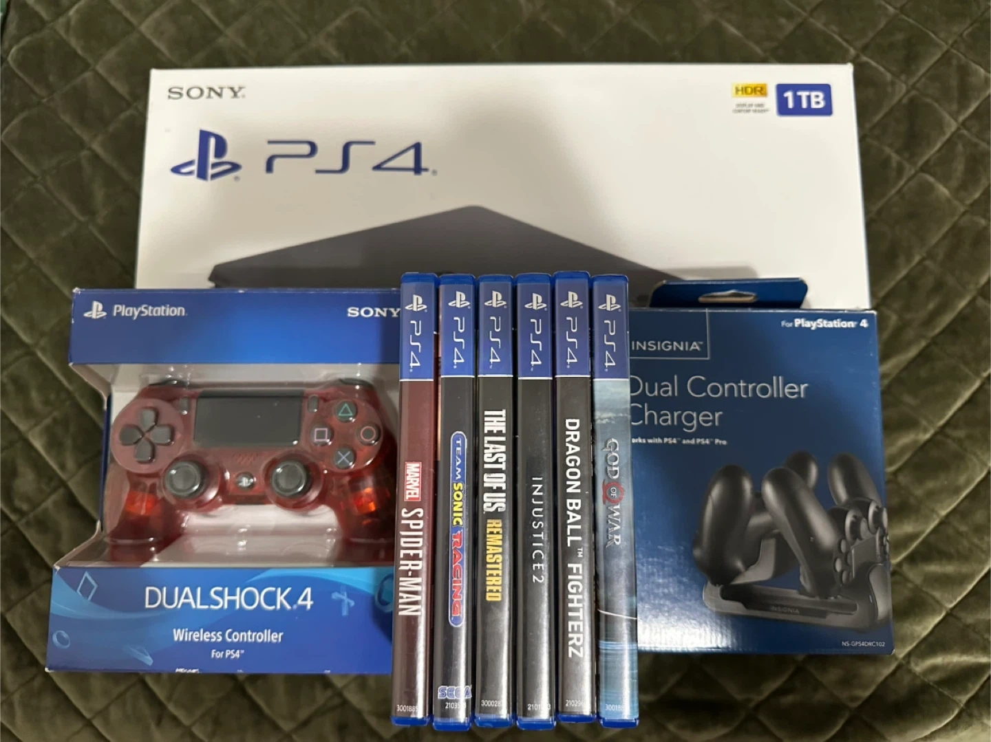 Selling a Sony PS4 1TB console with a Dualshock 4 wireless controller. Also included is an Insignia dual controller charger and several games: The Last of Us Remastered, Marvel Spider-Man, Team Sonic Racing, Injustice 2, Dragon Ball FighterZ, and God of War. Everything is in great condition and ready for a new player!