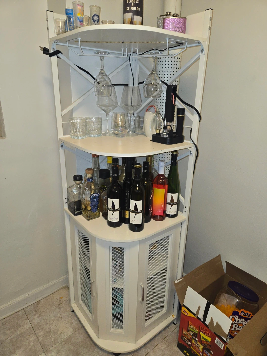 Selling a corner bar cart! It's perfect for storing your favorite drinks and glassware. Storage in bottom part as well. Plugs in for colorful light display. The cart has multiple shelves and a convenient design. It's in good condition and ready to add a touch of elegance to your space