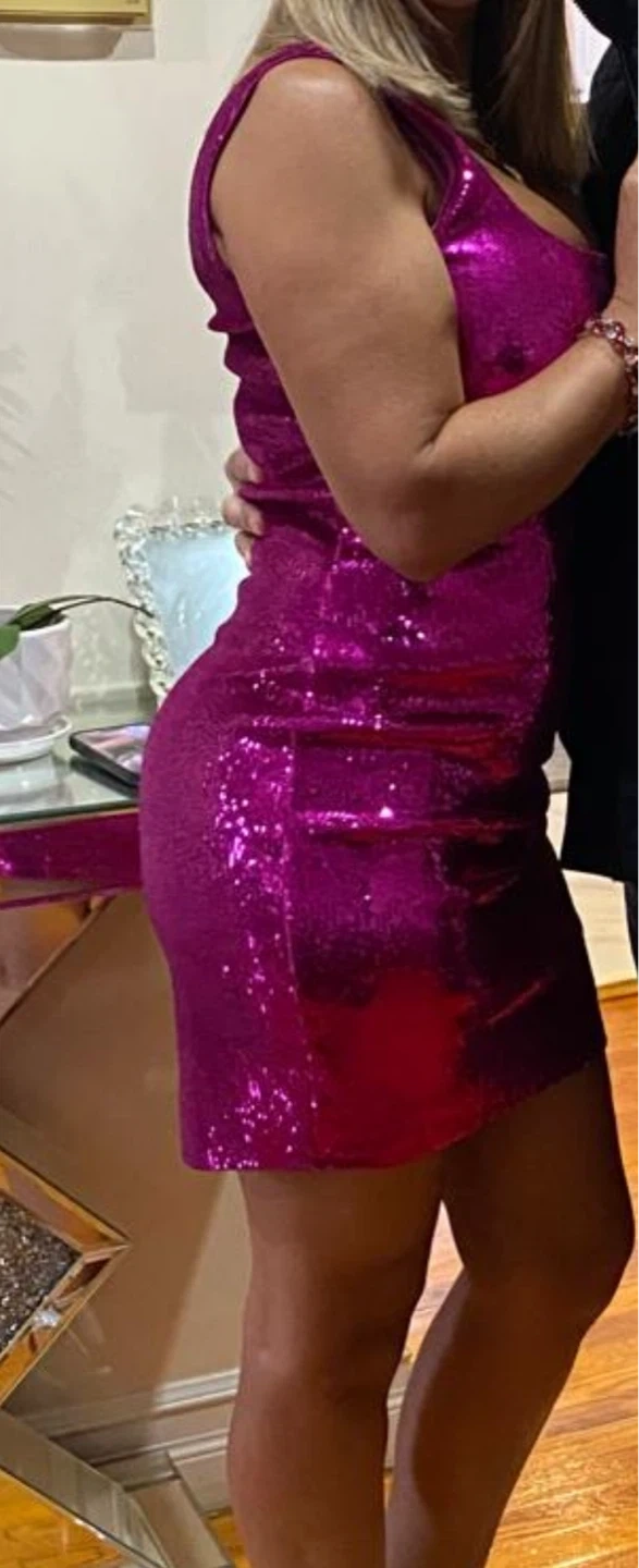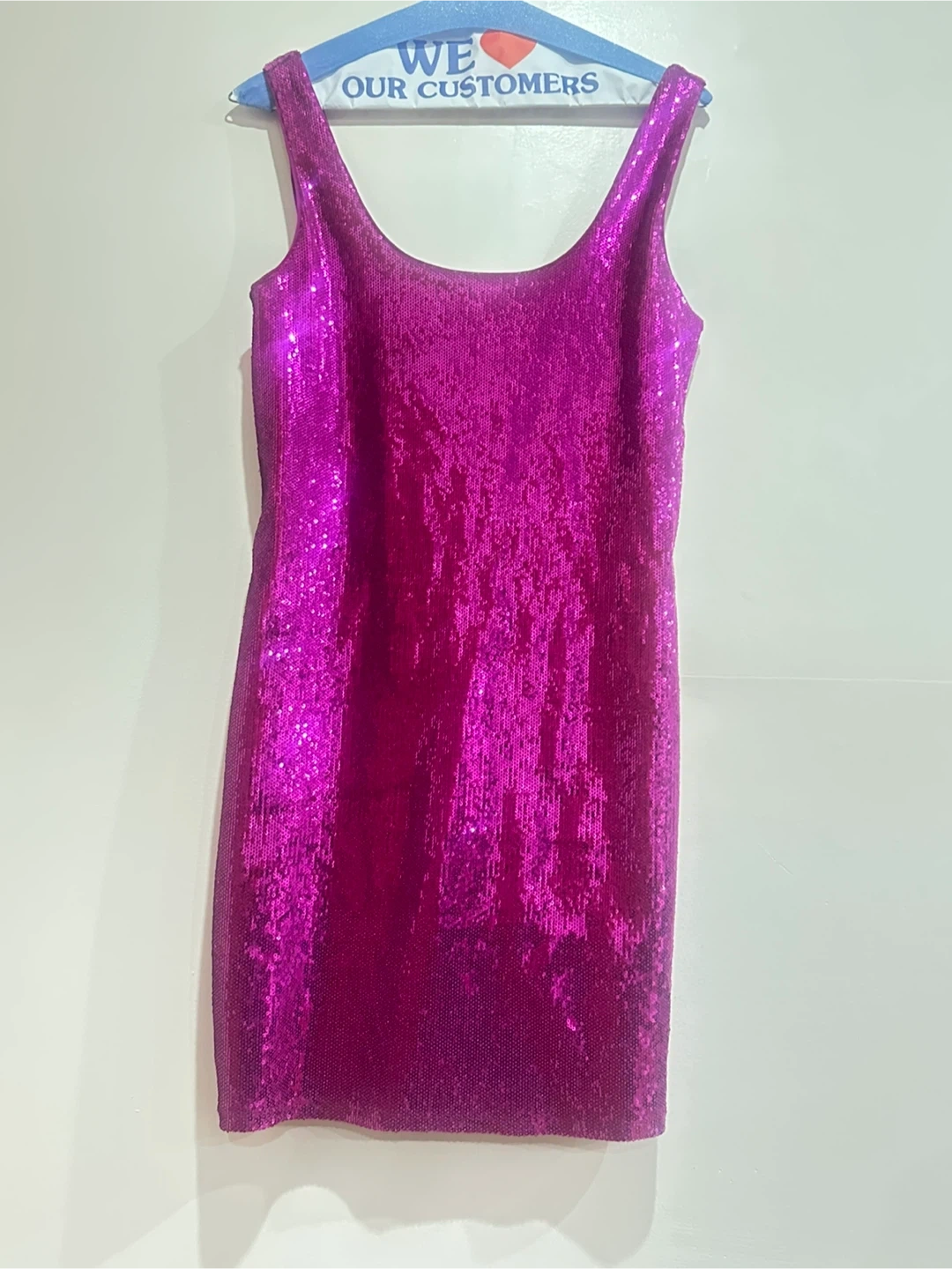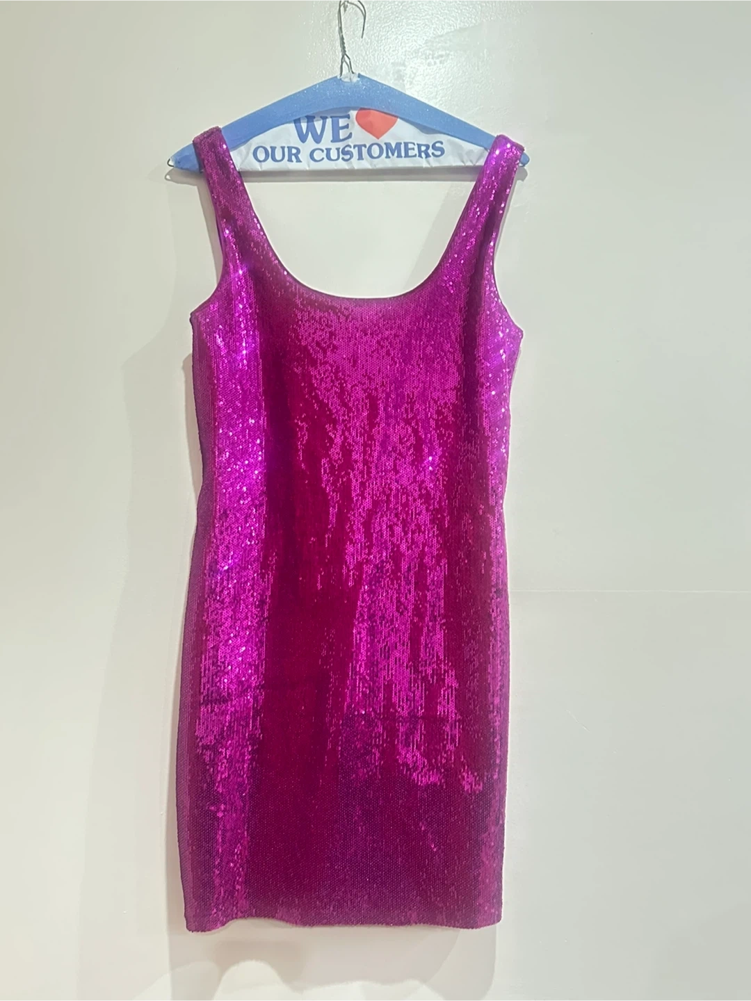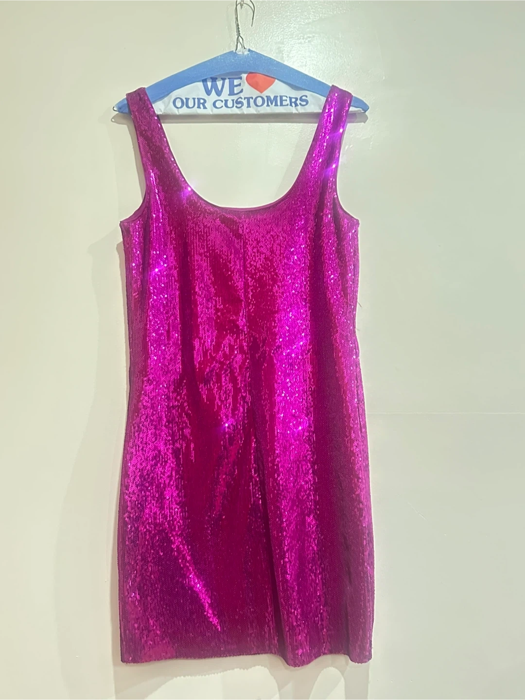 Selling a cute Express dress! It's a vibrant pink with sequins all over. The size is S and it's made in Indonesia