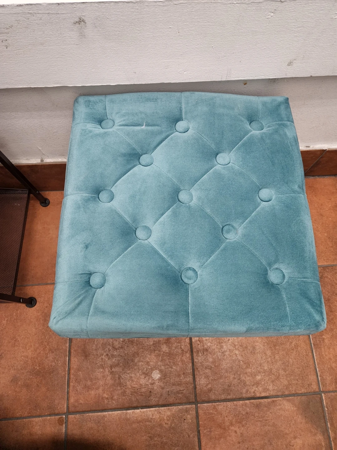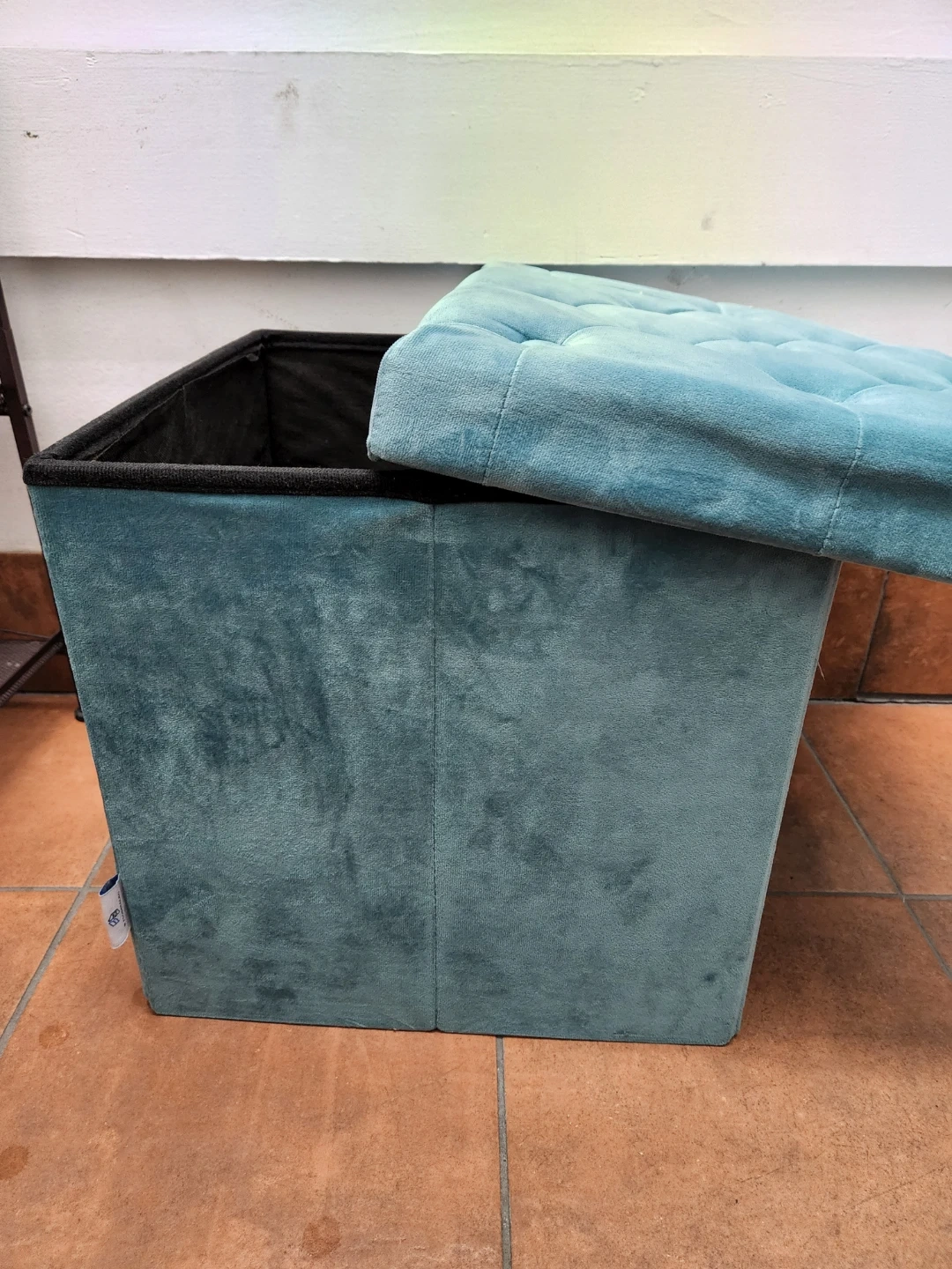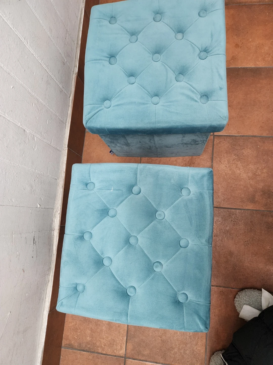 This is a lovely blue velvet storage ottoman. It's perfect for adding a touch of elegance and extra storage to any room. The ottoman has a soft, tufted top and a spacious interior for storing blankets, pillows, toys, or anything else you need to keep out of sight.non pets non smoke.each 20 .cash only