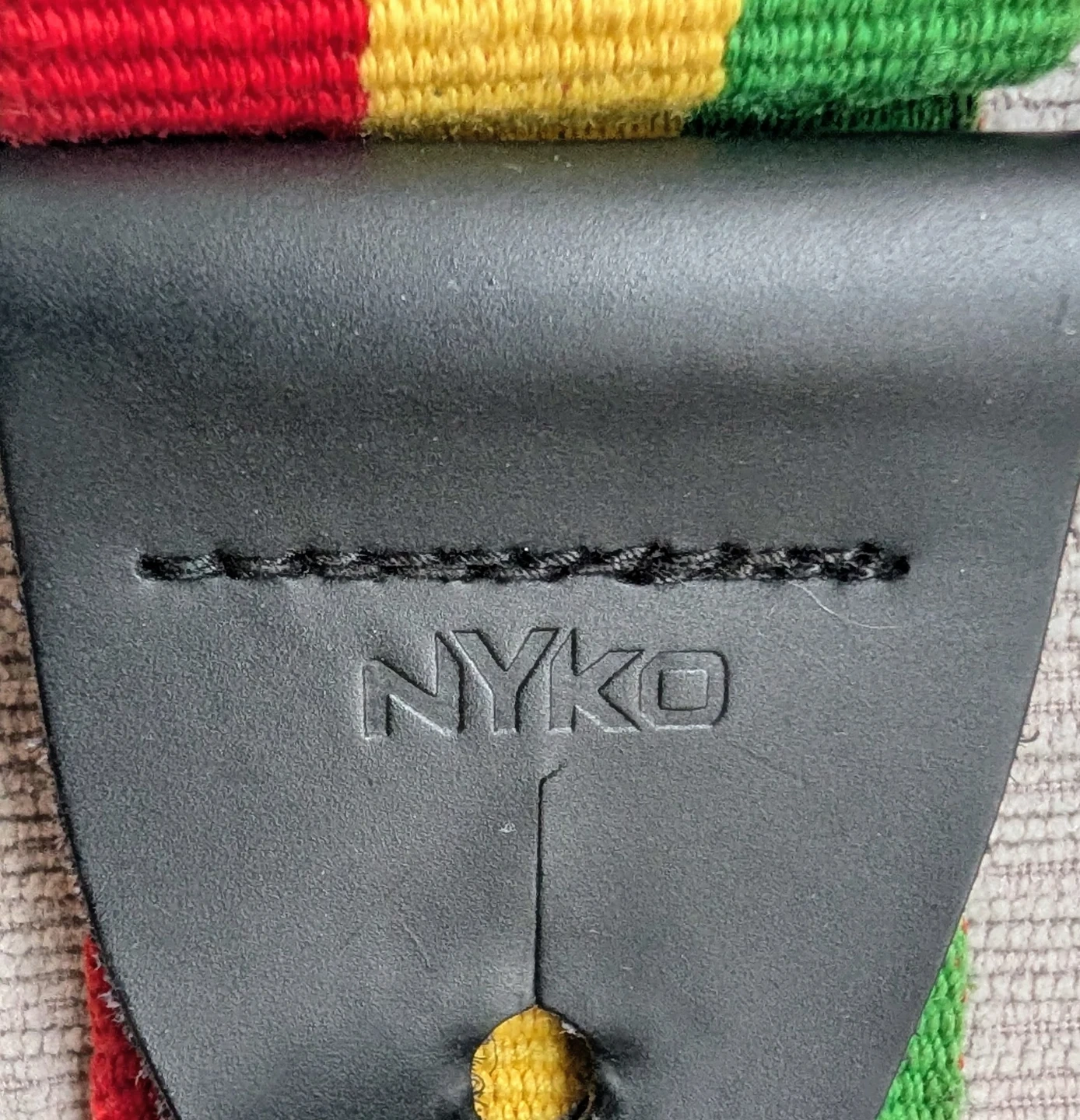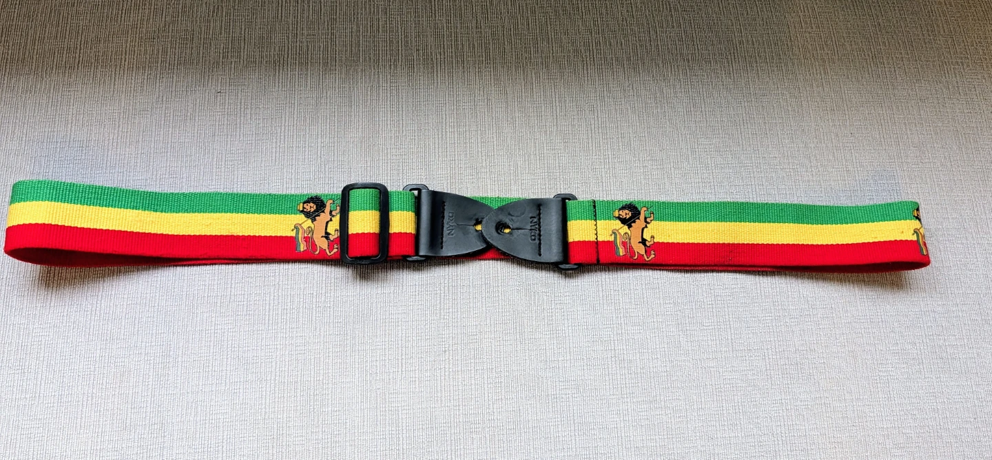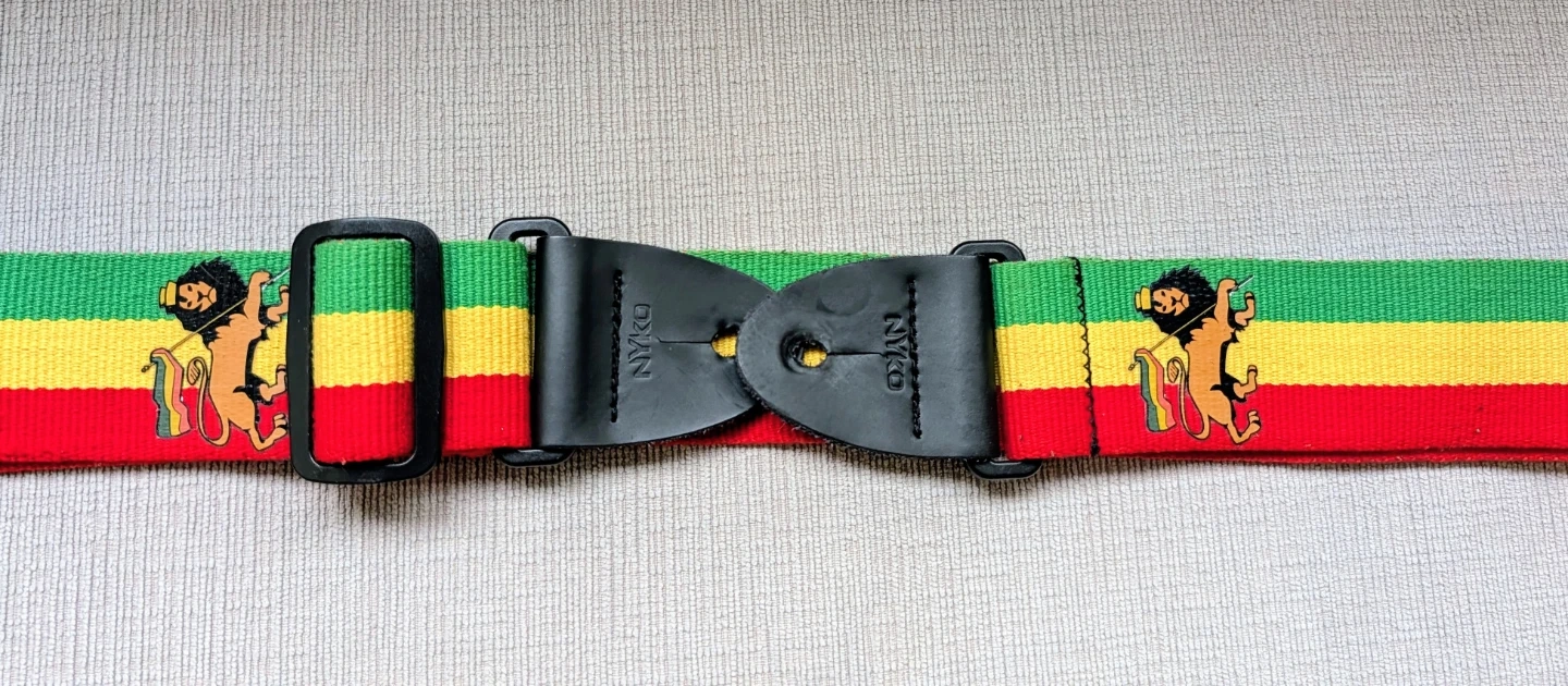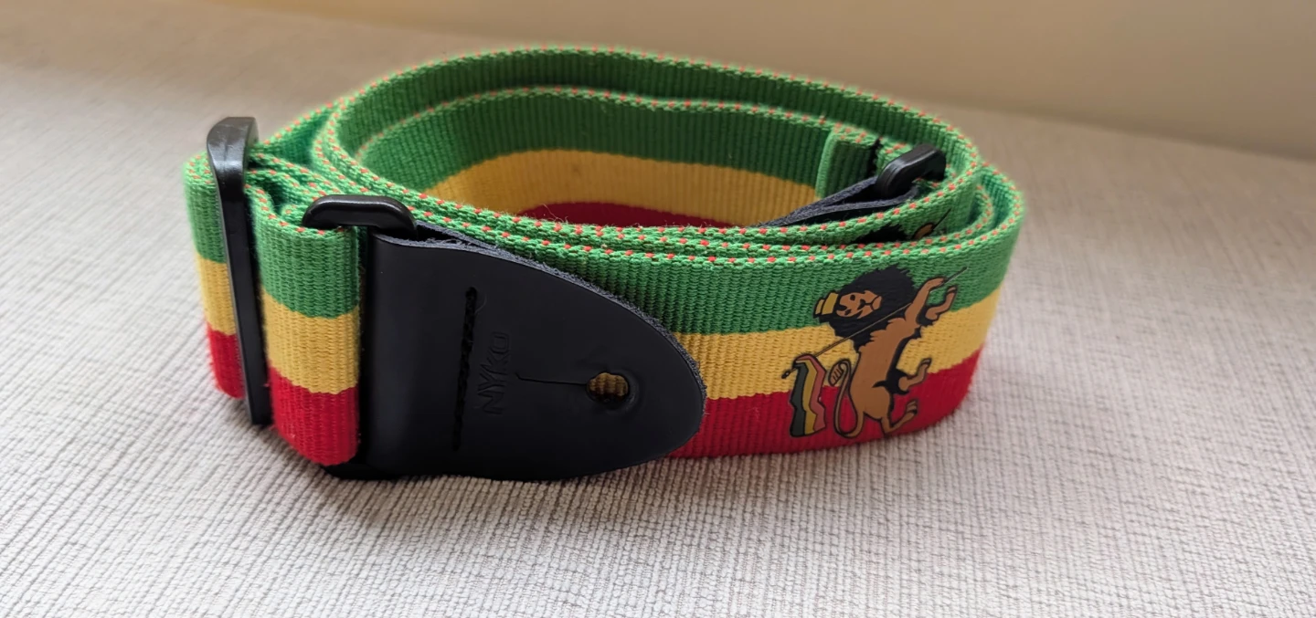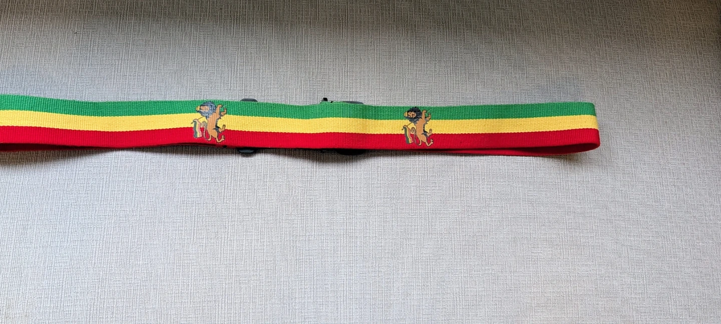Selling a NYKO guitar strap in great condition! It features a Rasta colour scheme (red, yellow, and green) and has a cool lion design. Perfect for adding some style to your guitar playing