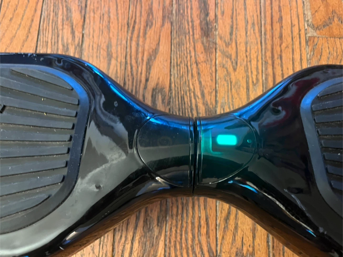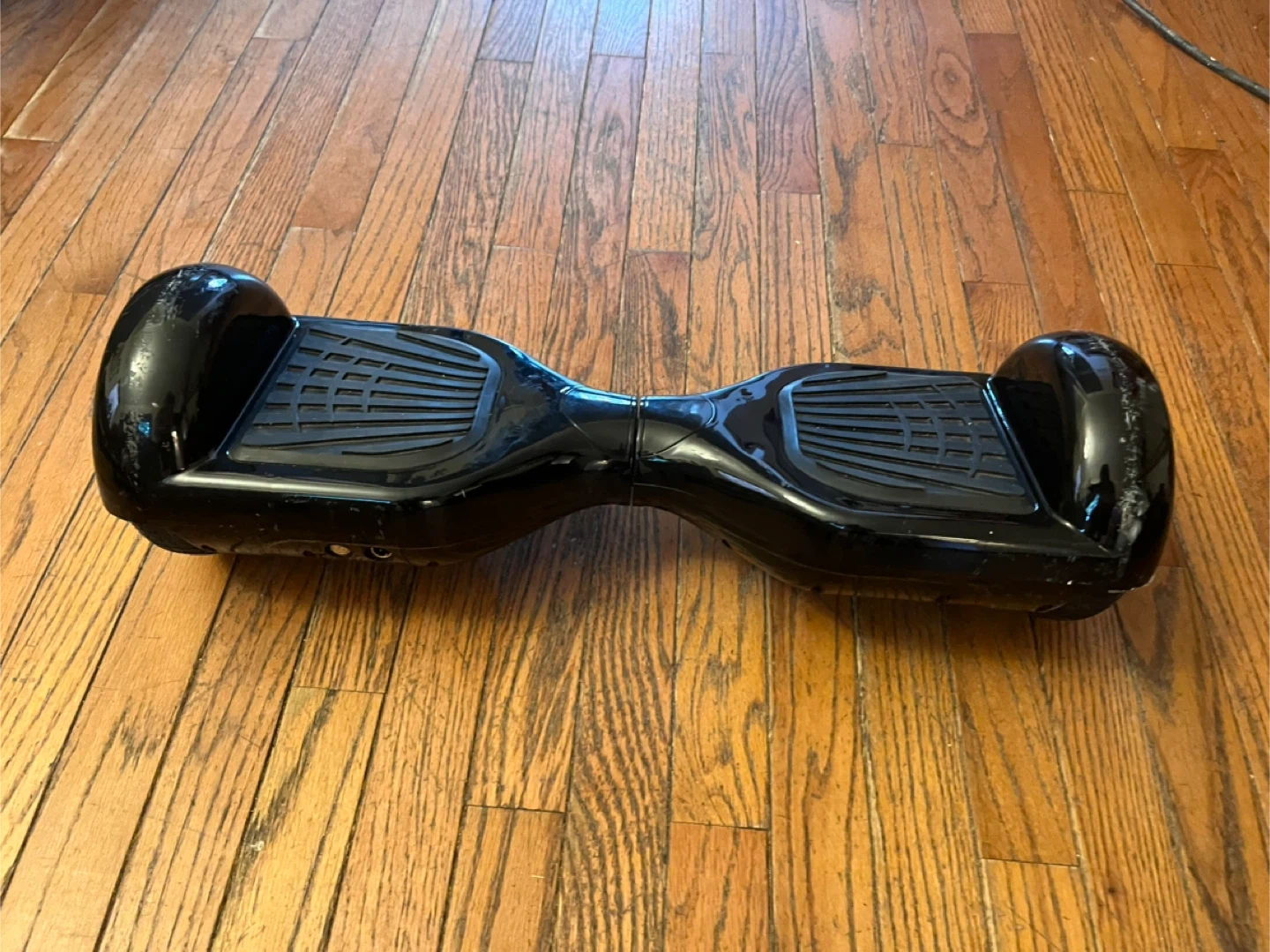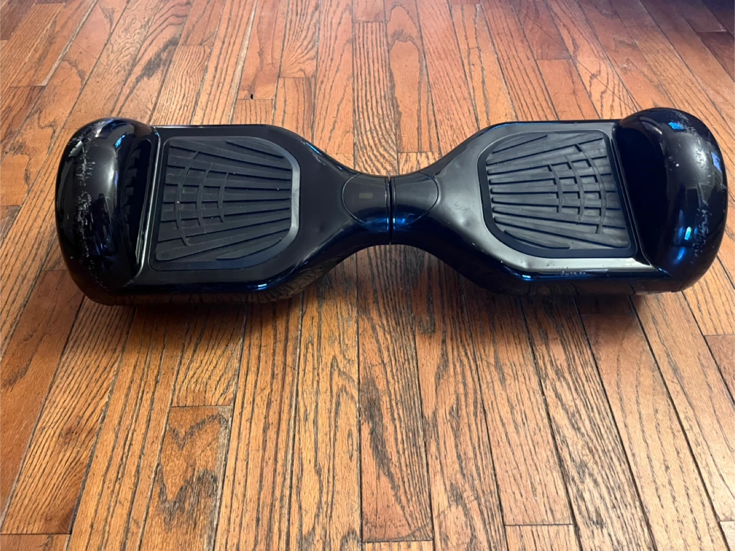 Selling a black hoverboard that comes with its power charger. It has some visible scratches, as shown in the photos. Still works great!