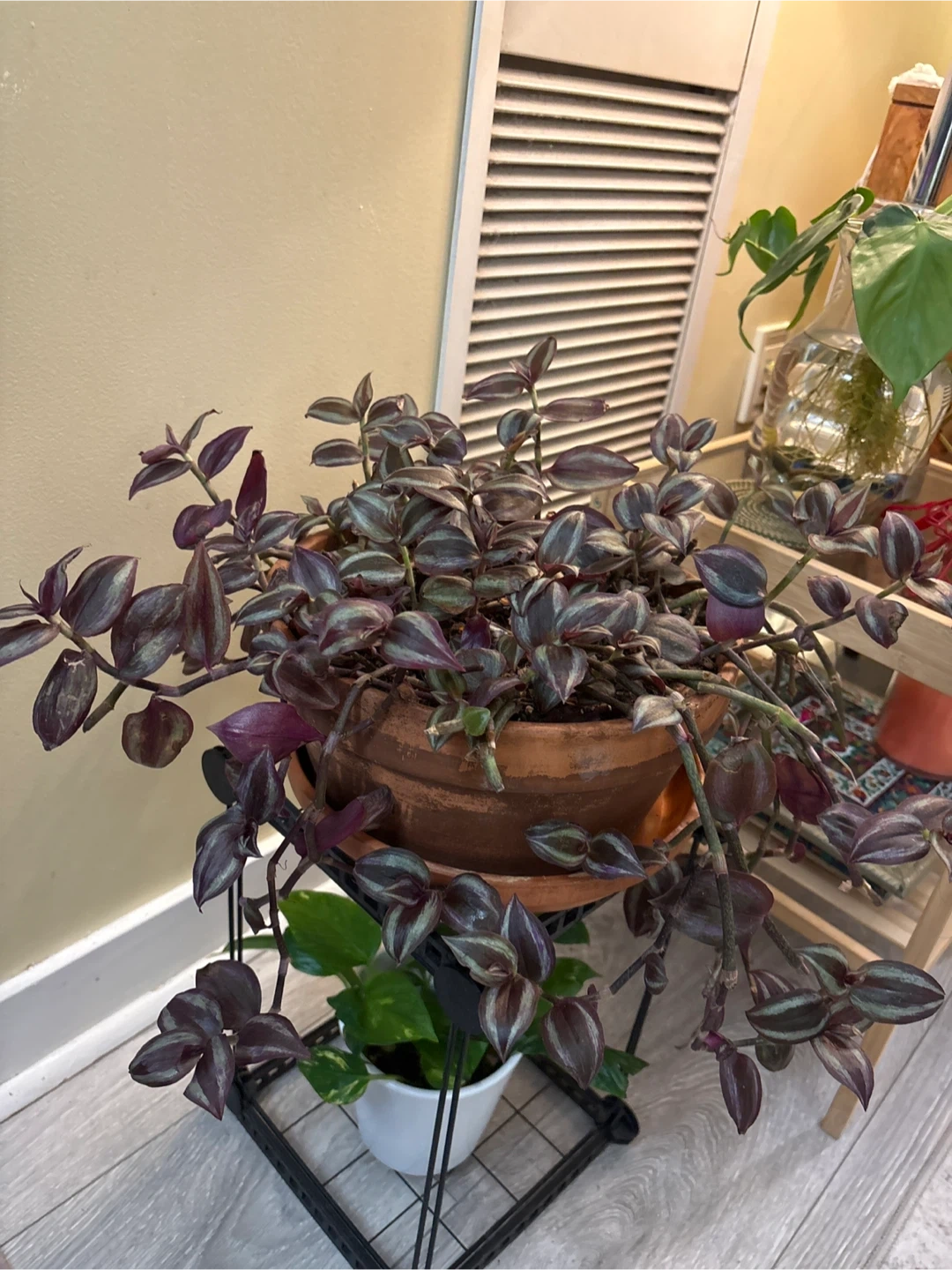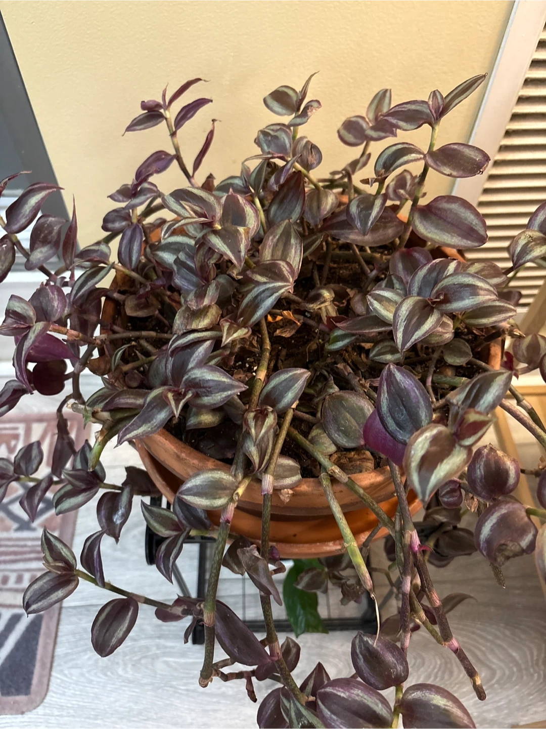 Selling a healthy Wandering Jew plant! It's got beautiful purple and silver-striped leaves that trail down nicely. It's currently potted in a terracotta pot and is ready to brighten up your space