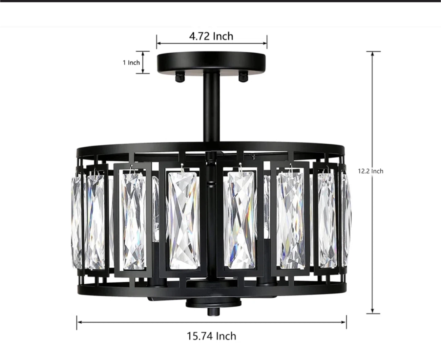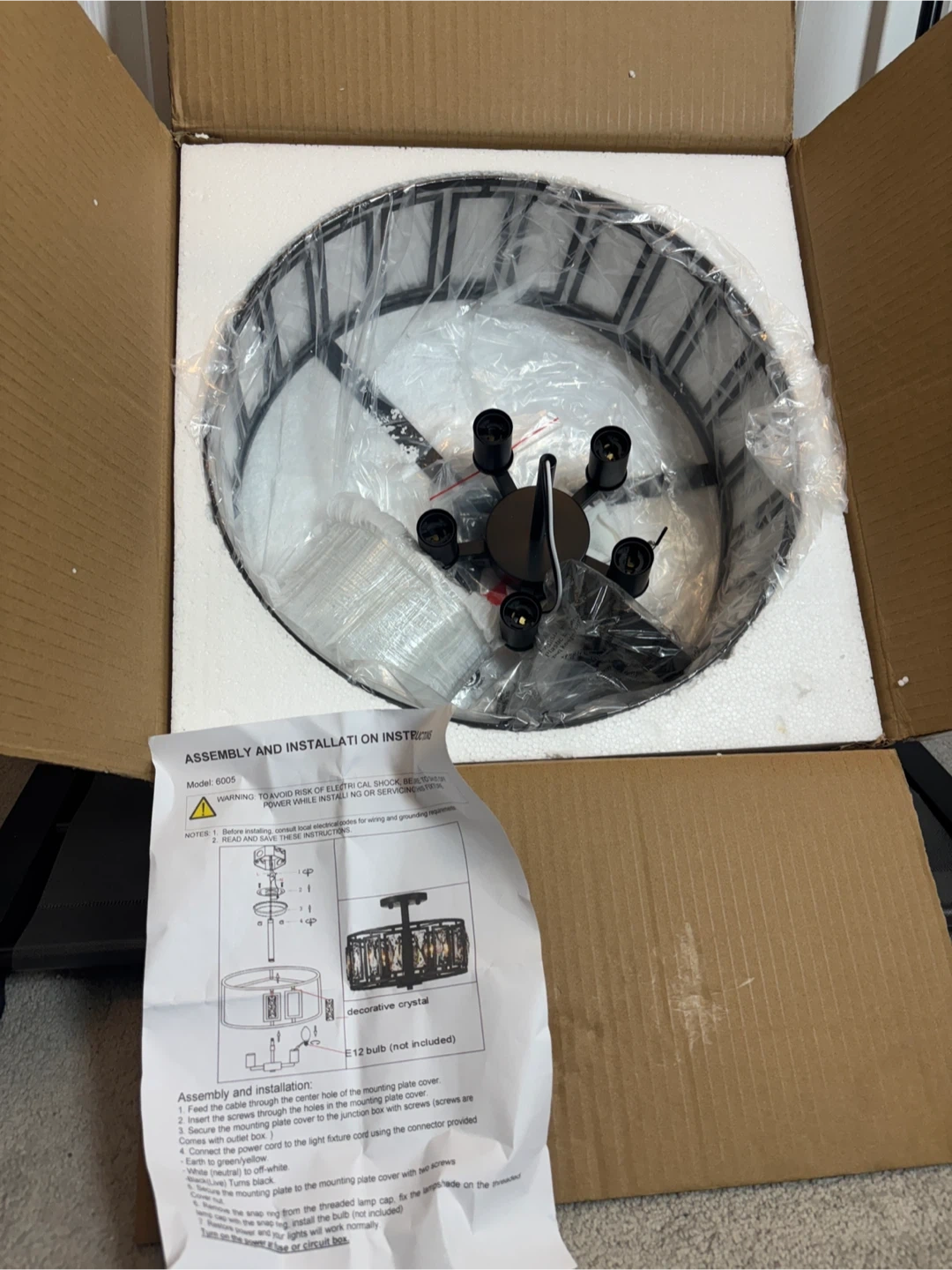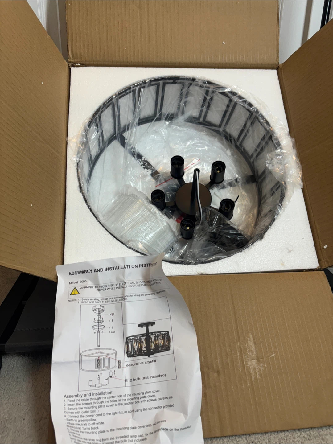 Selling a brand new crystal drum ceiling light, model 6005! It's still in its original box and comes with all the assembly and installation instructions. The light features decorative crystals and requires an E12 bulb (not included). It measures approximately 15.74 inches in diameter and 12.2 inches in height.