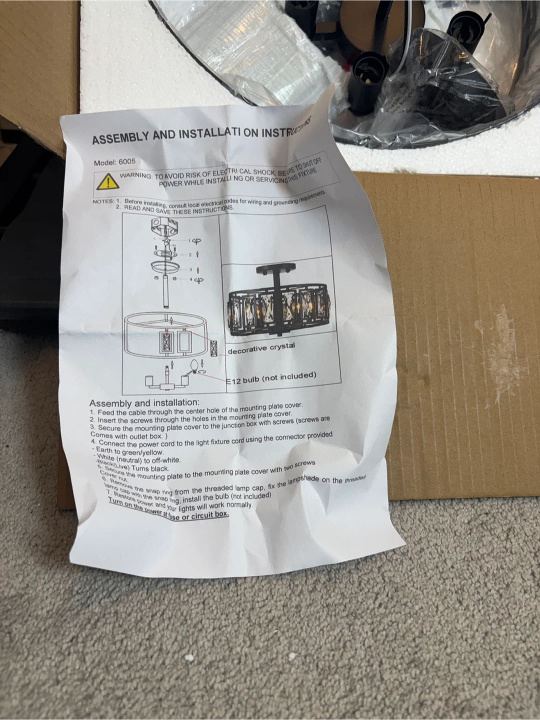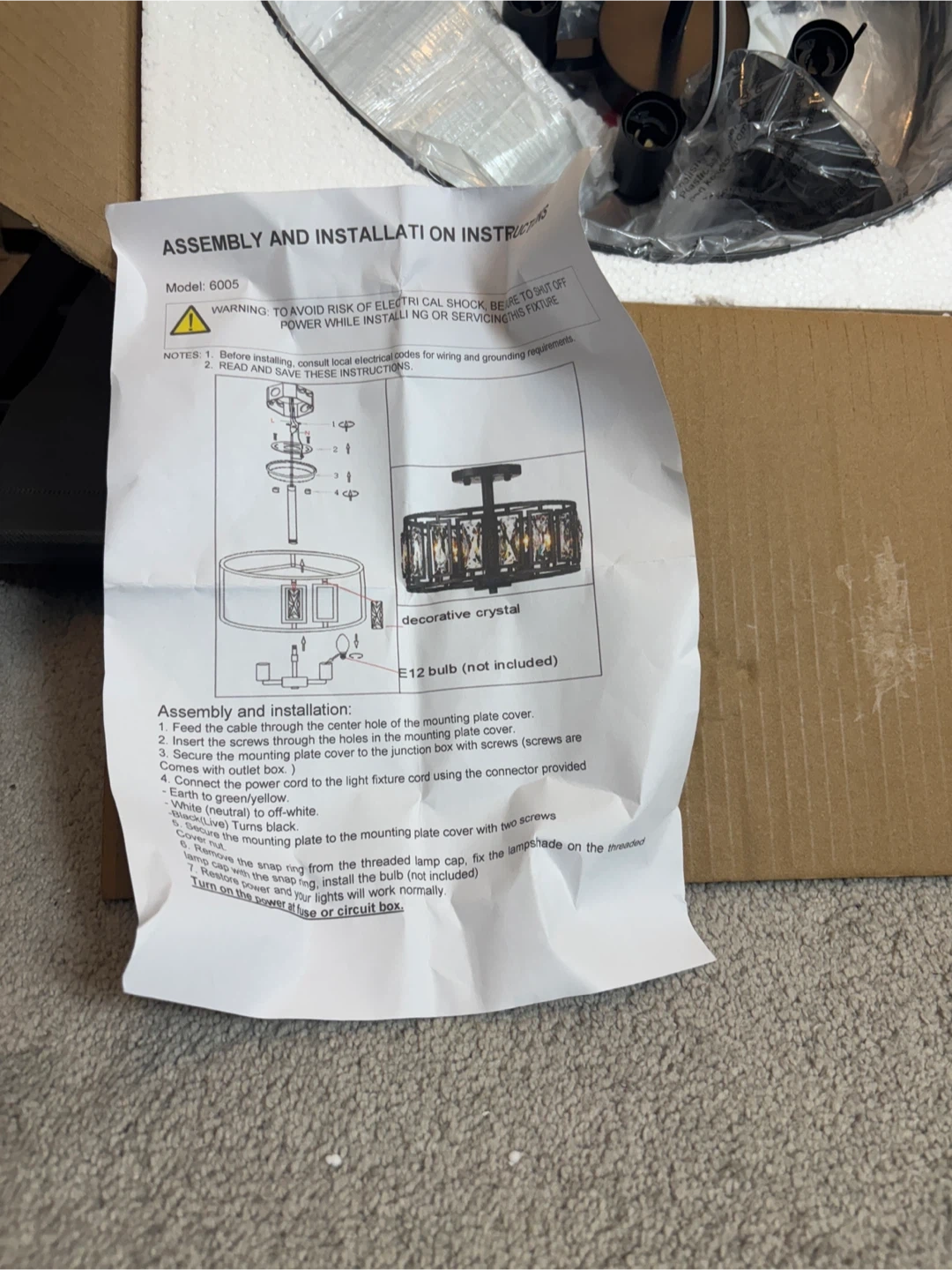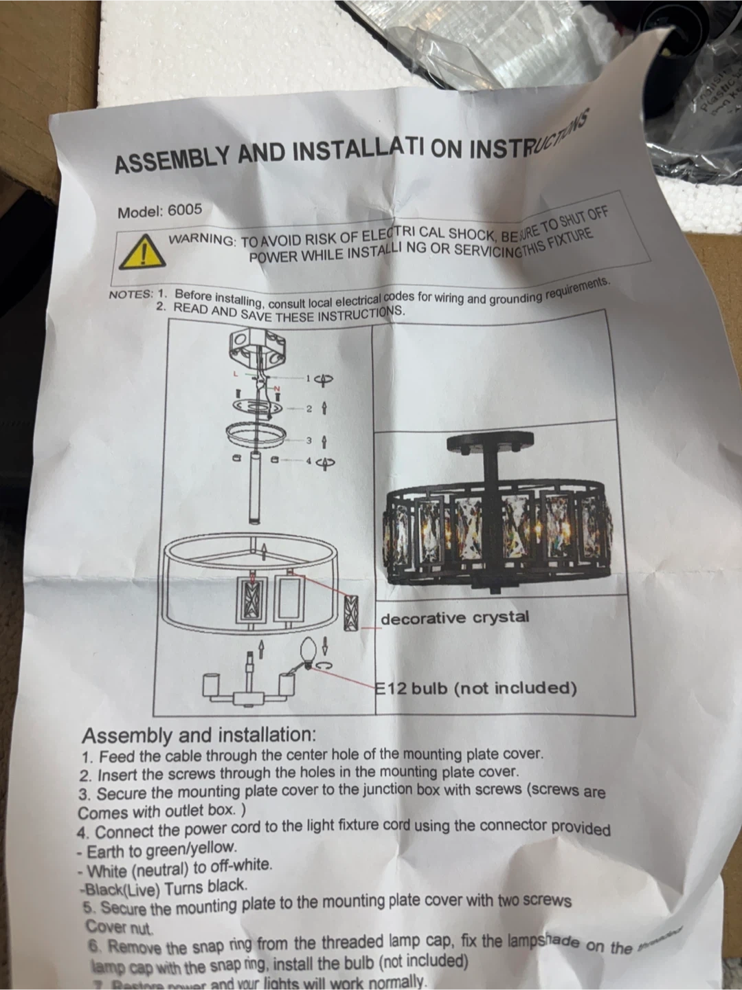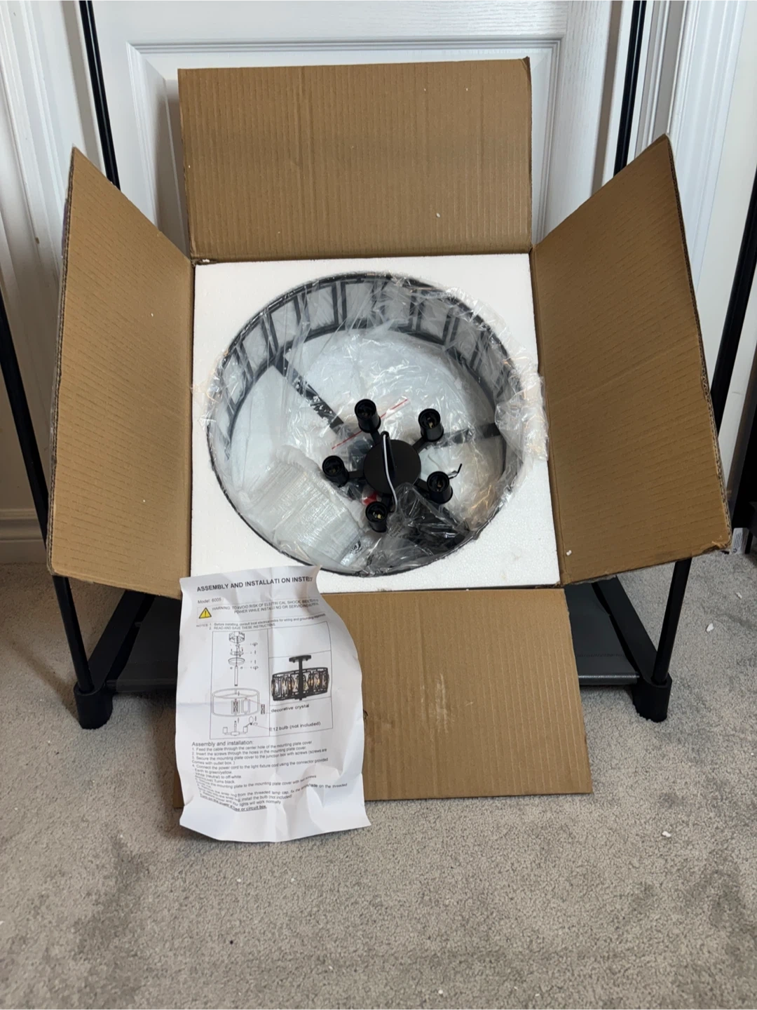 Selling a brand new crystal drum ceiling light, model 6005! It's still in its original box and comes with all the assembly and installation instructions. The light features decorative crystals and requires an E12 bulb (not included). It measures approximately 15.74 inches in diameter and 12.2 inches in height.