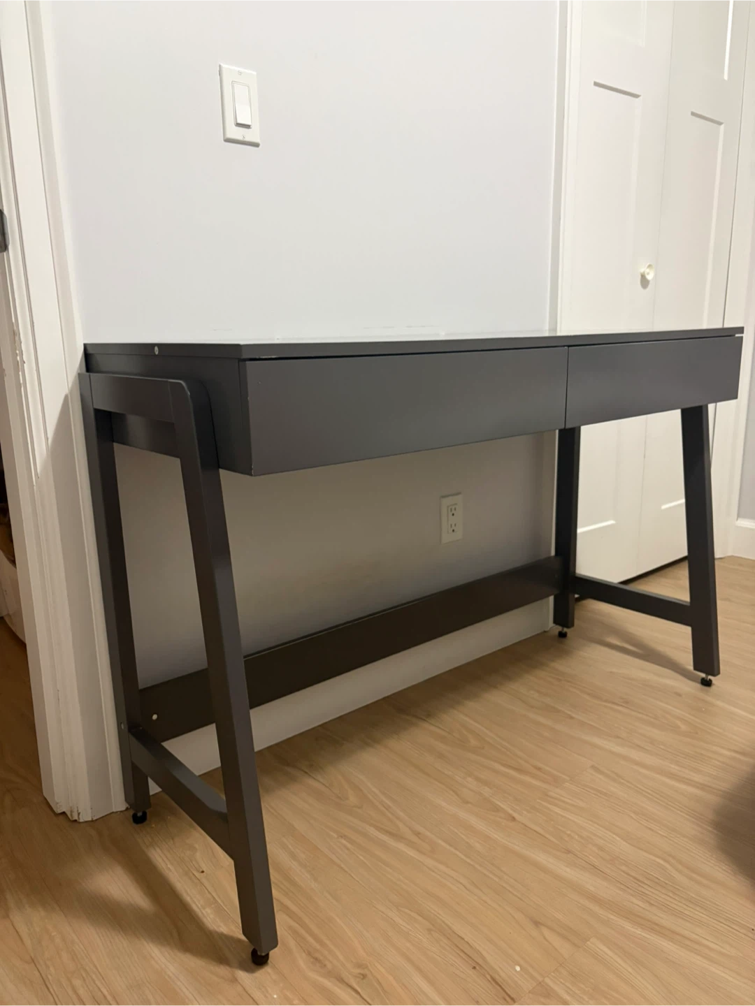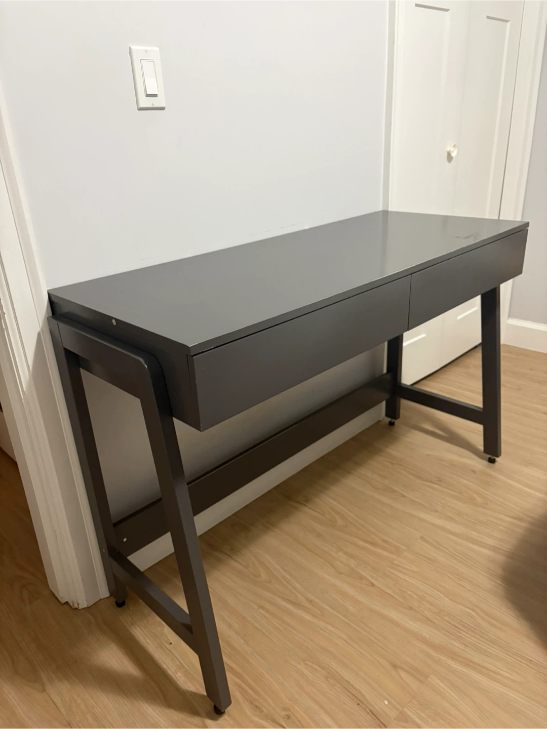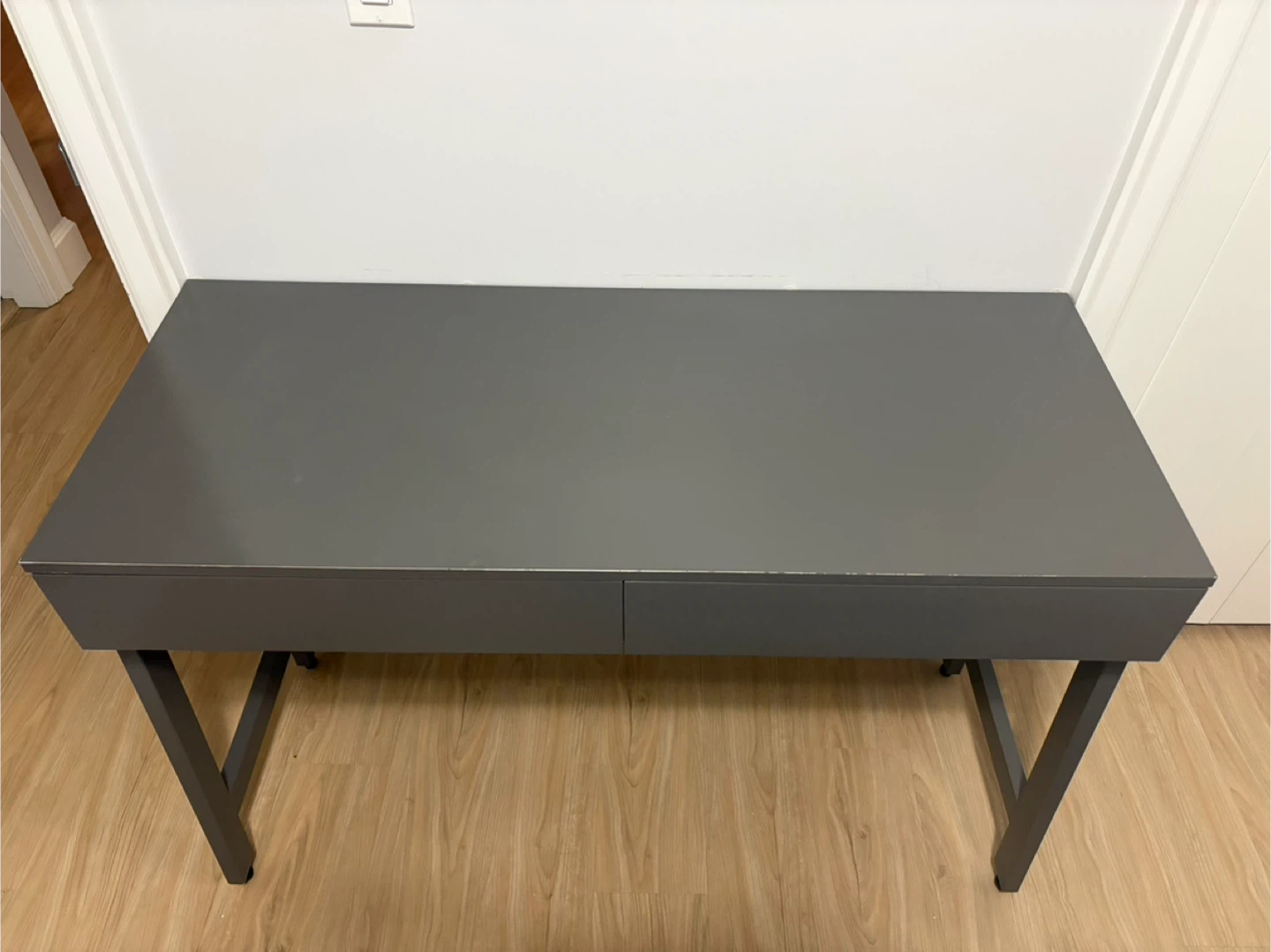 Selling a grey desk that has two drawers. It's in used condition with minimal wear on the top surface (scotch tape residue that does not come off), as shown in the photos. Was in use for about a year.