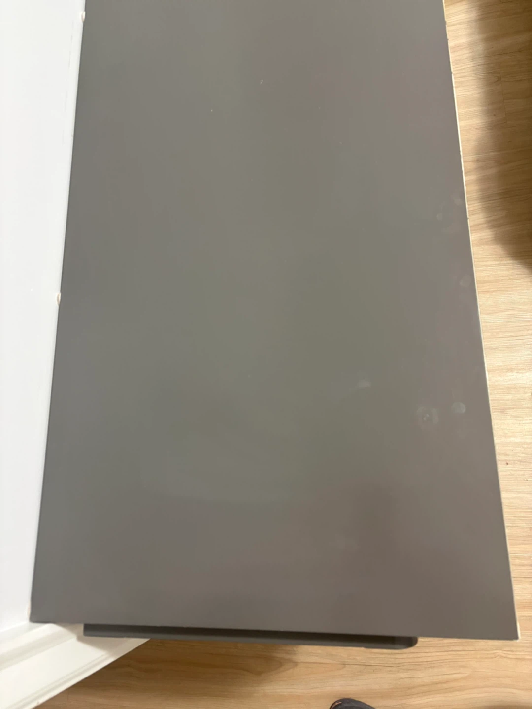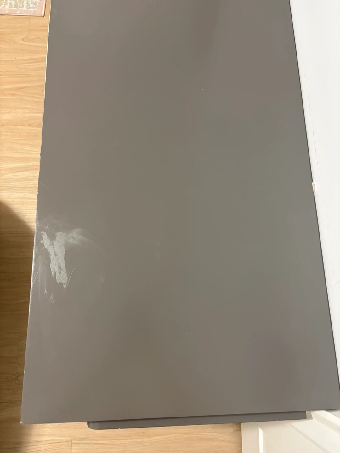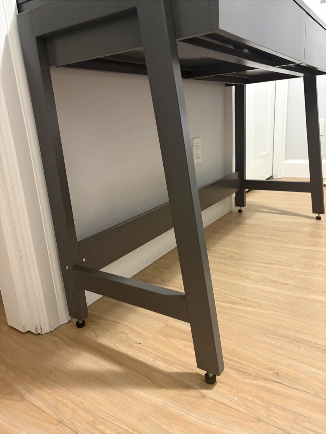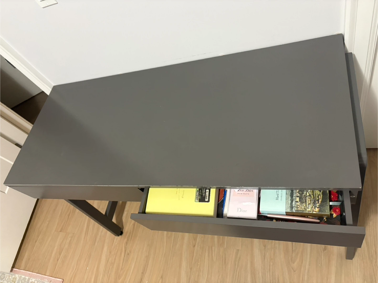 Selling a grey desk that has two drawers. It's in used condition with minimal wear on the top surface (scotch tape residue that does not come off), as shown in the photos. Was in use for about a year.