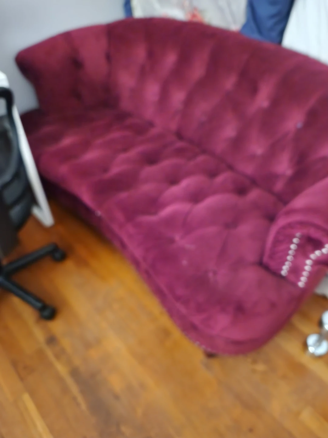 Here's a burgundy chaise lounge! It features a tufted design and nailhead trim. It would be a lovely addition to any room!