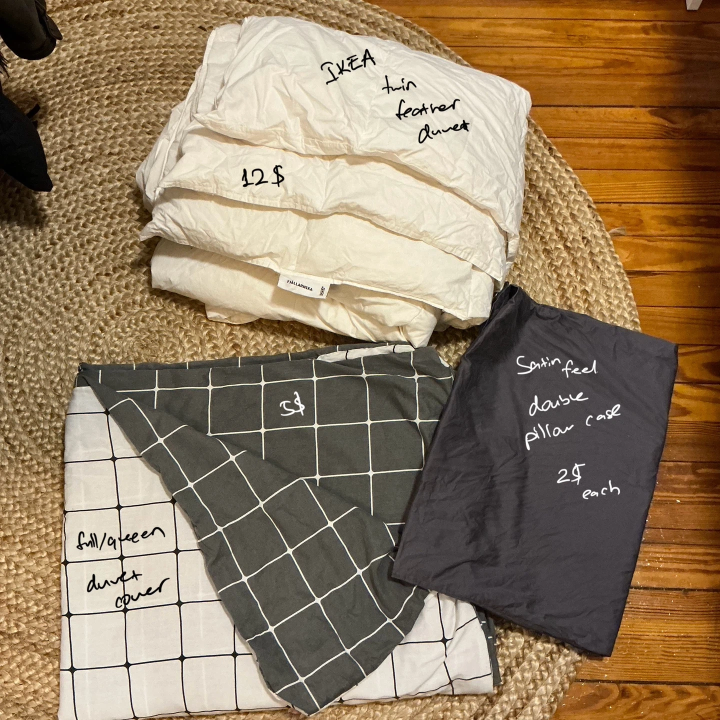 I'm selling an IKEA twin feather duvet, a full/queen duvet cover, and a satin feel double pillow case. The duvet is $12, and the pillow case is $2 each.