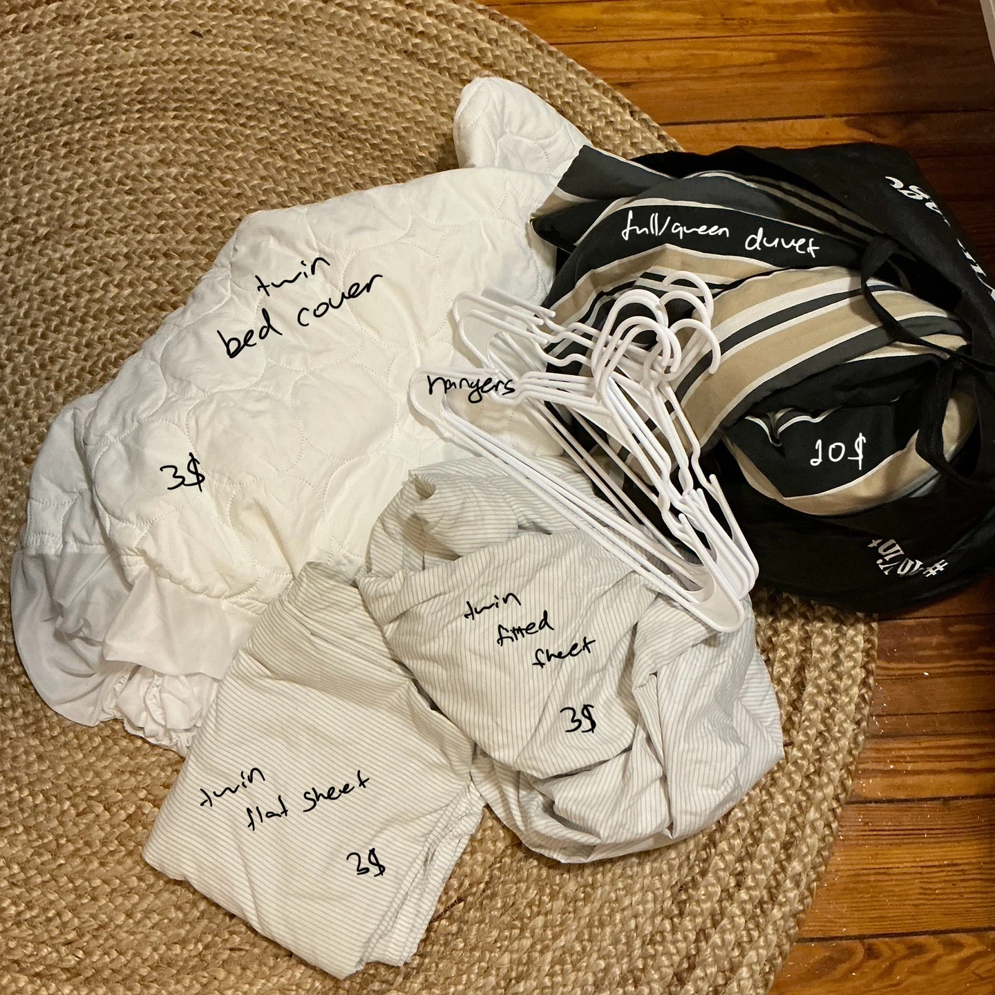 Selling a twin bed cover, twin fitted sheet, twin flat sheet, and a full/queen duvet. Also comes with some hangers!