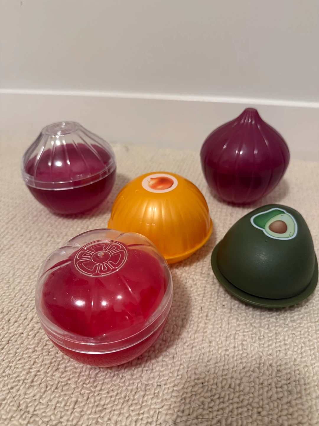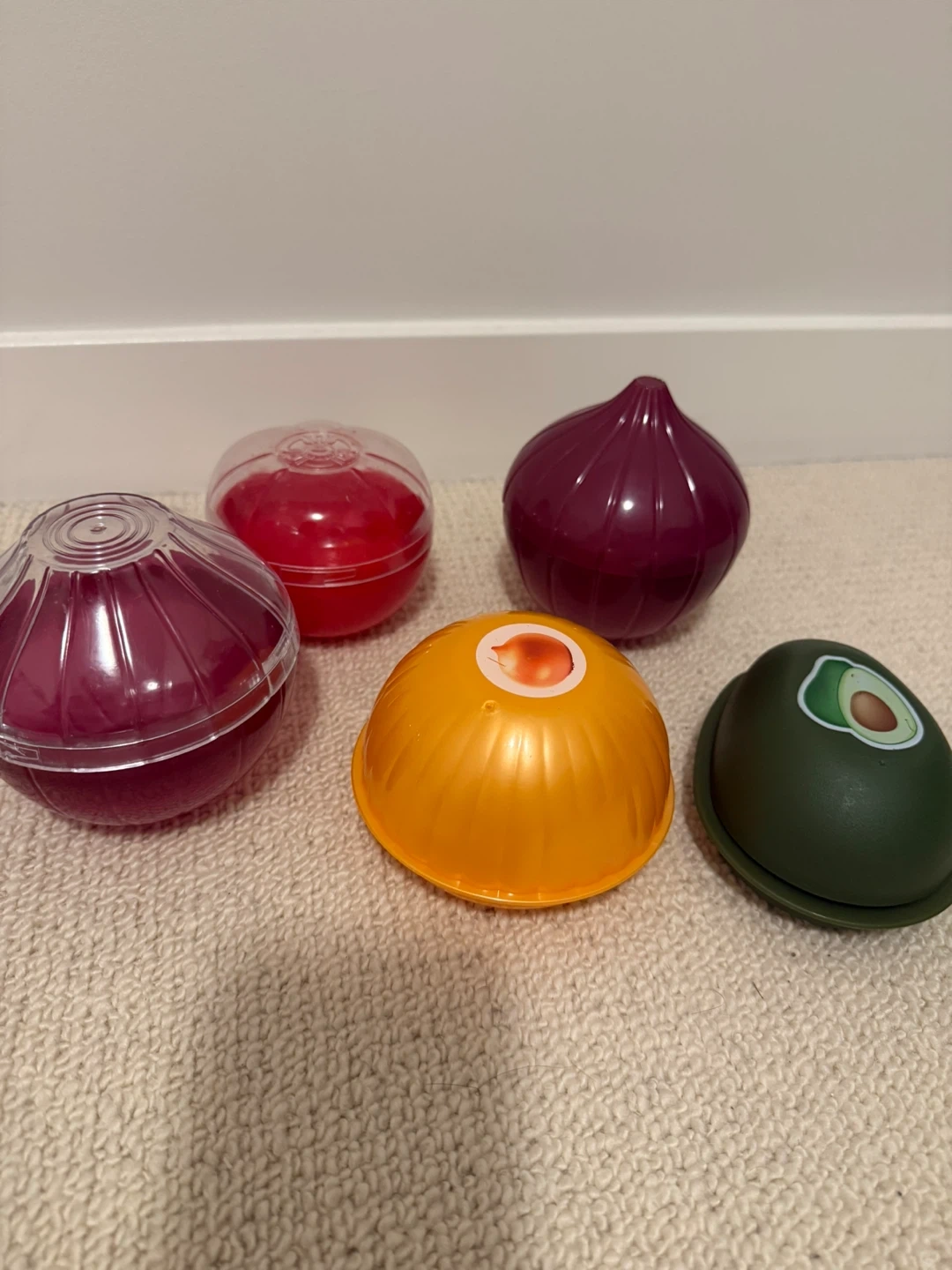 Here's a set of 5 vegetable-shaped food savers! They're in great condition and ready to keep your veggies fresh. This set includes an avocado, red onion, yellow onion, and tomato, food savers.