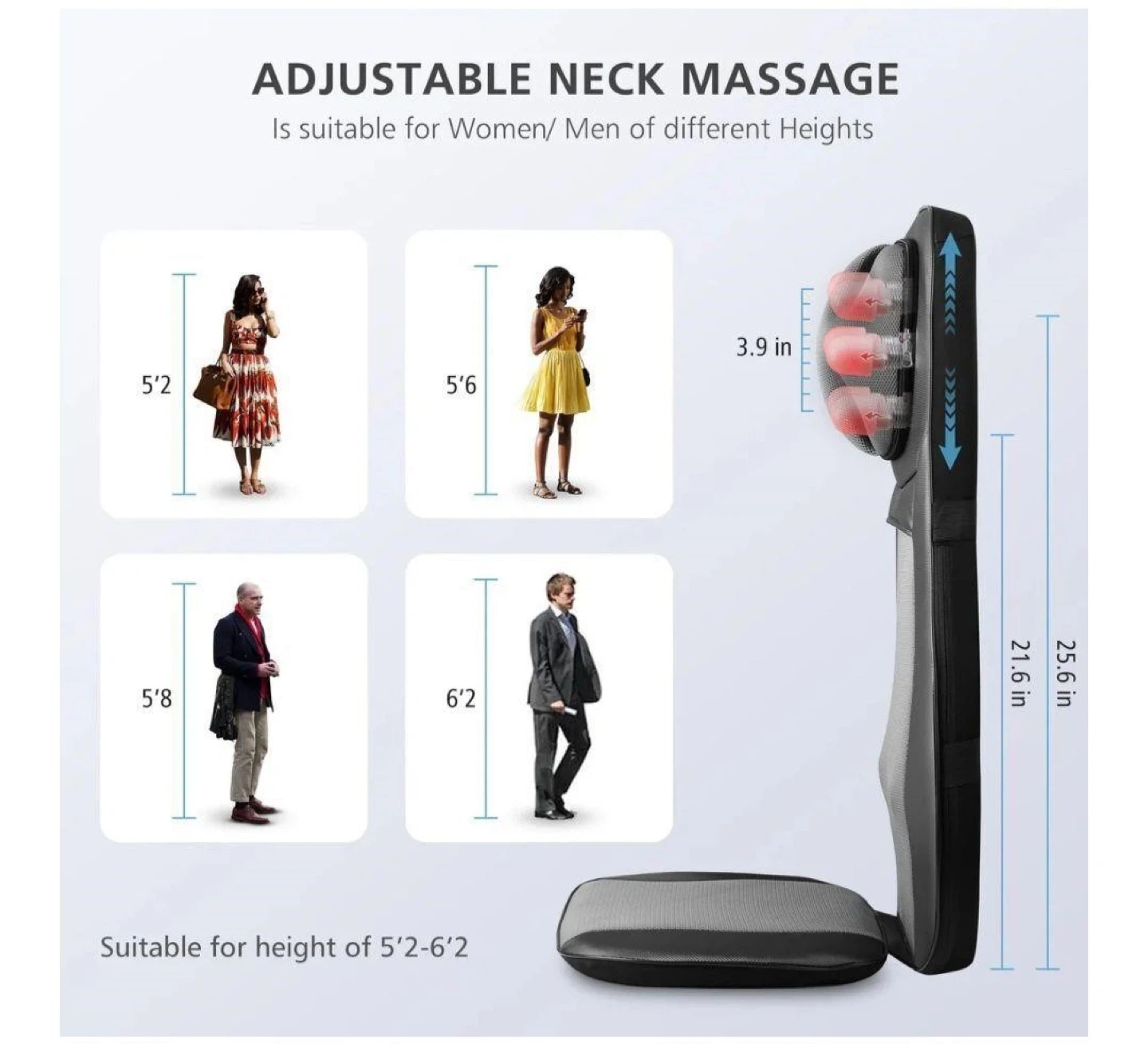 - Adjustable neck massage with up/down height control and optional heat, designed to fit a range of user heights and relieve neck and shoulder tension.