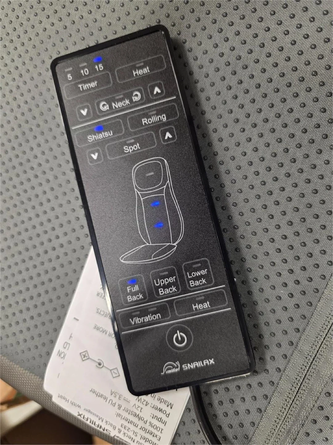 - Seat vibration and soothing back heat, all controlled from the wired remote with 5/10/15‑minute timer, intensity selections, and dedicated buttons for neck, back zones, vibration, and heat