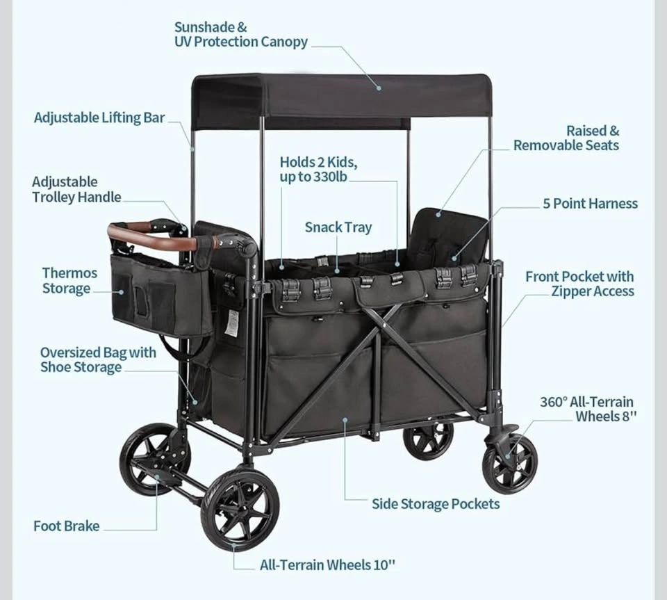 Cochecito para niños, cochecito de 2 plazas, carrito de bebé todo terreno al aire libre con toldo, organizador para padres, asa ajustable y barra de tracción para bebés y niños pequeños