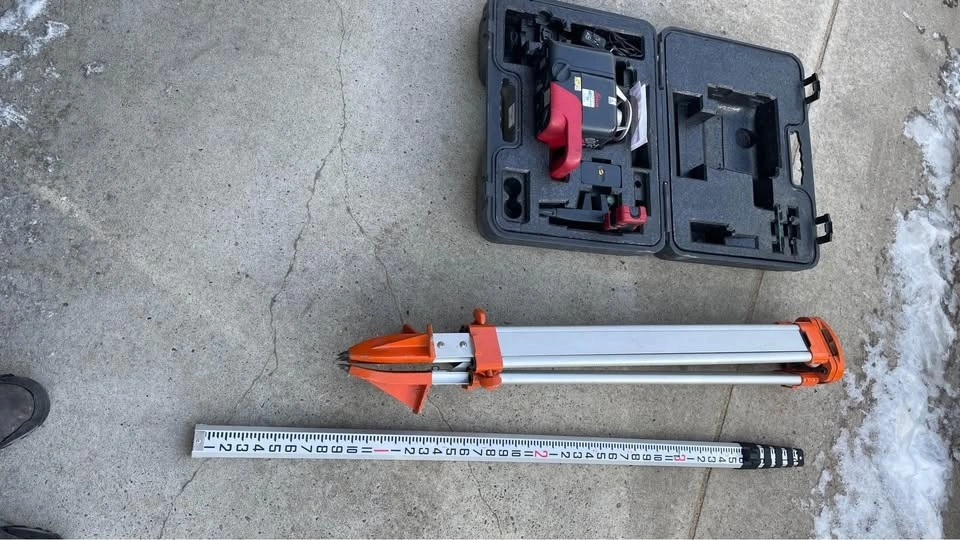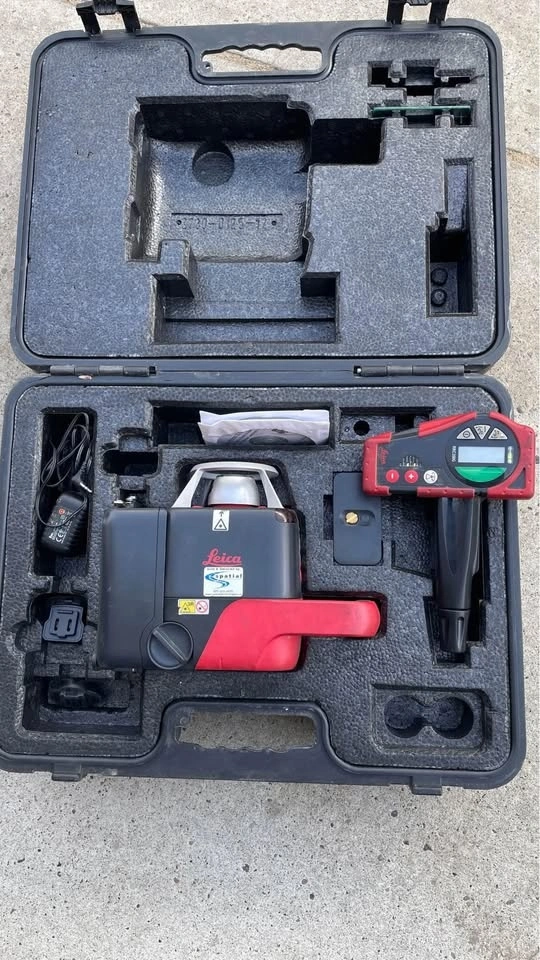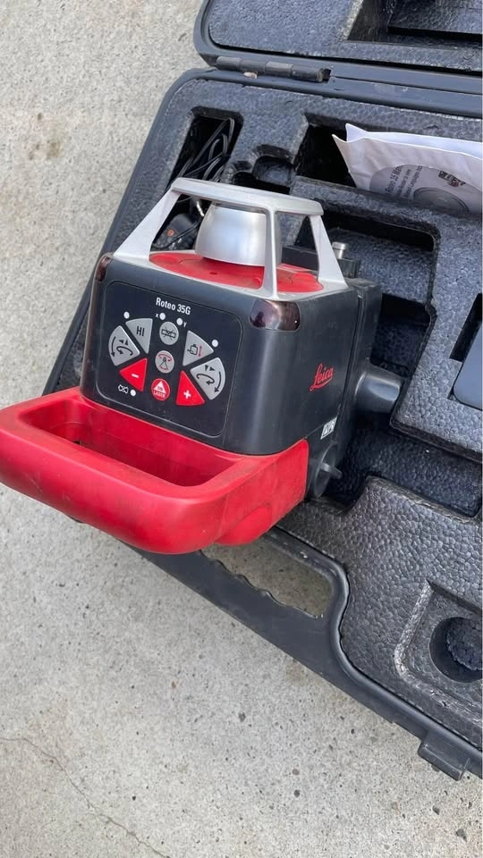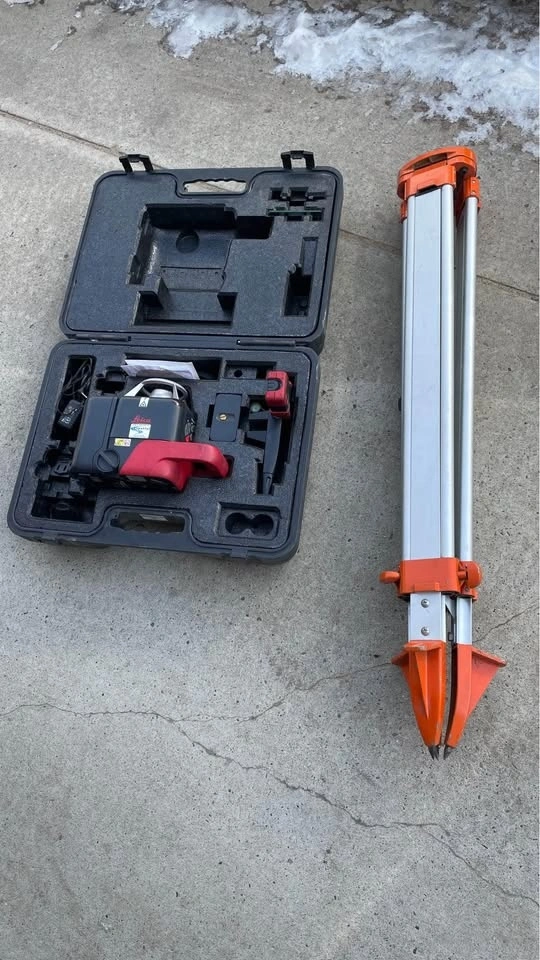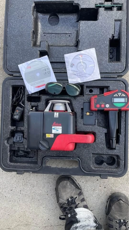 Gently used (and not needed anymore). Leica Roteo 35g green laser, wall plug, glasses, receiver, tripod, and stick.