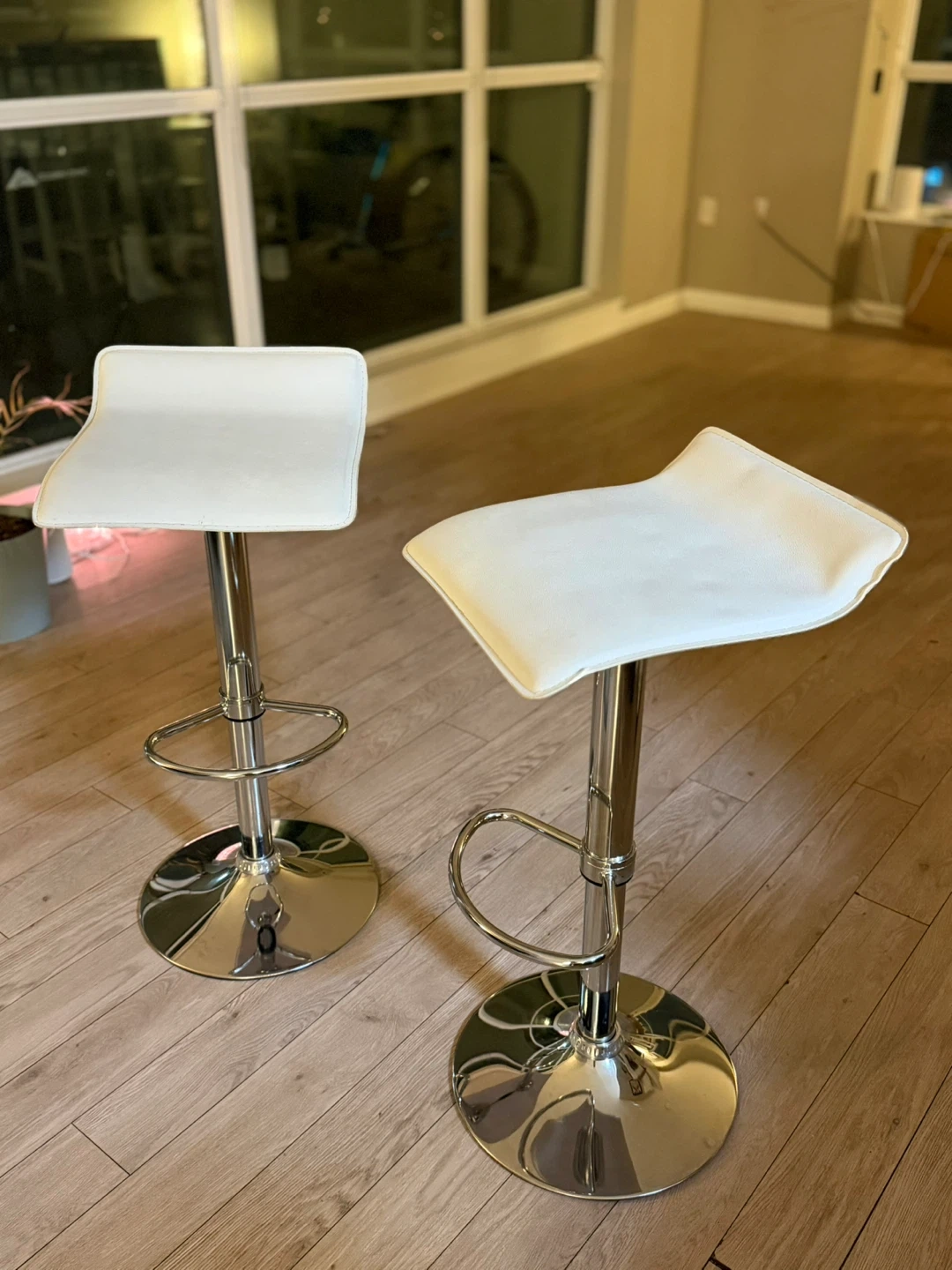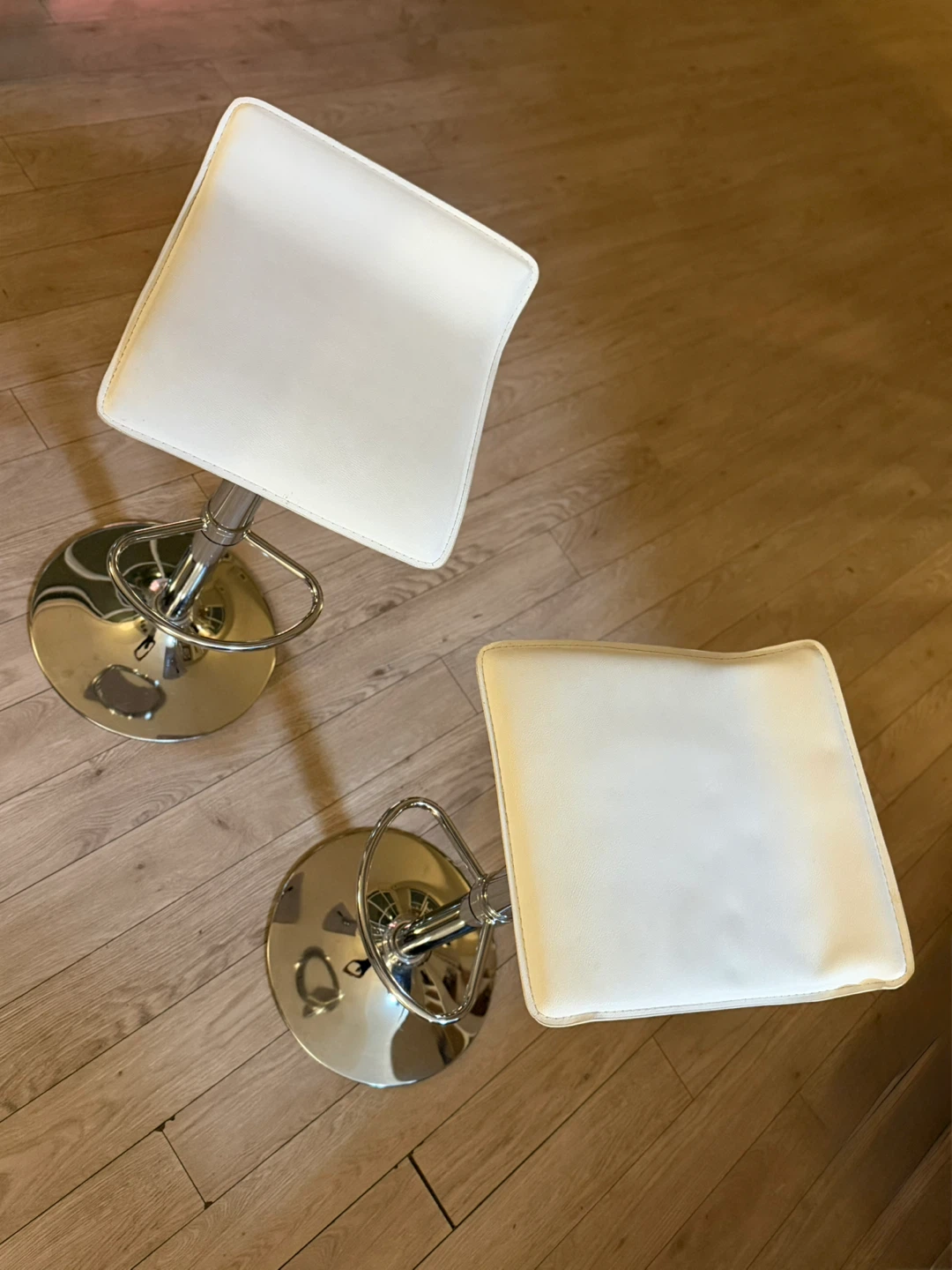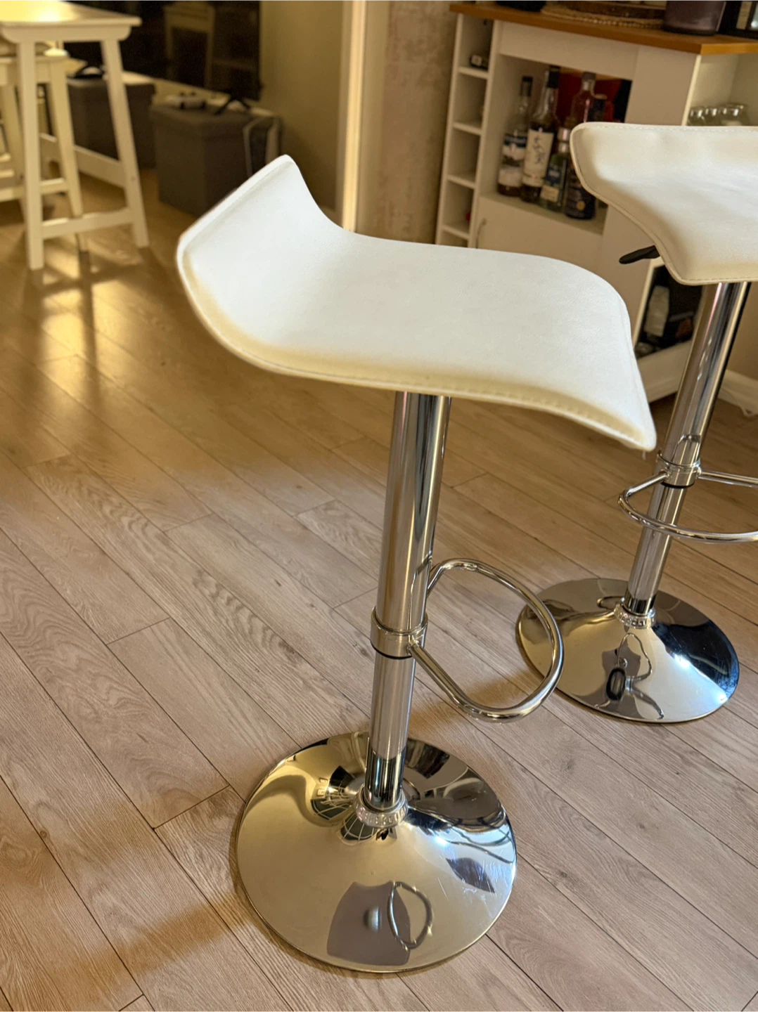 Selling a set of two bar stools. They feature a sleek, modern design with a white seat and chrome base. Perfect for adding a touch of style to your kitchen or bar area!