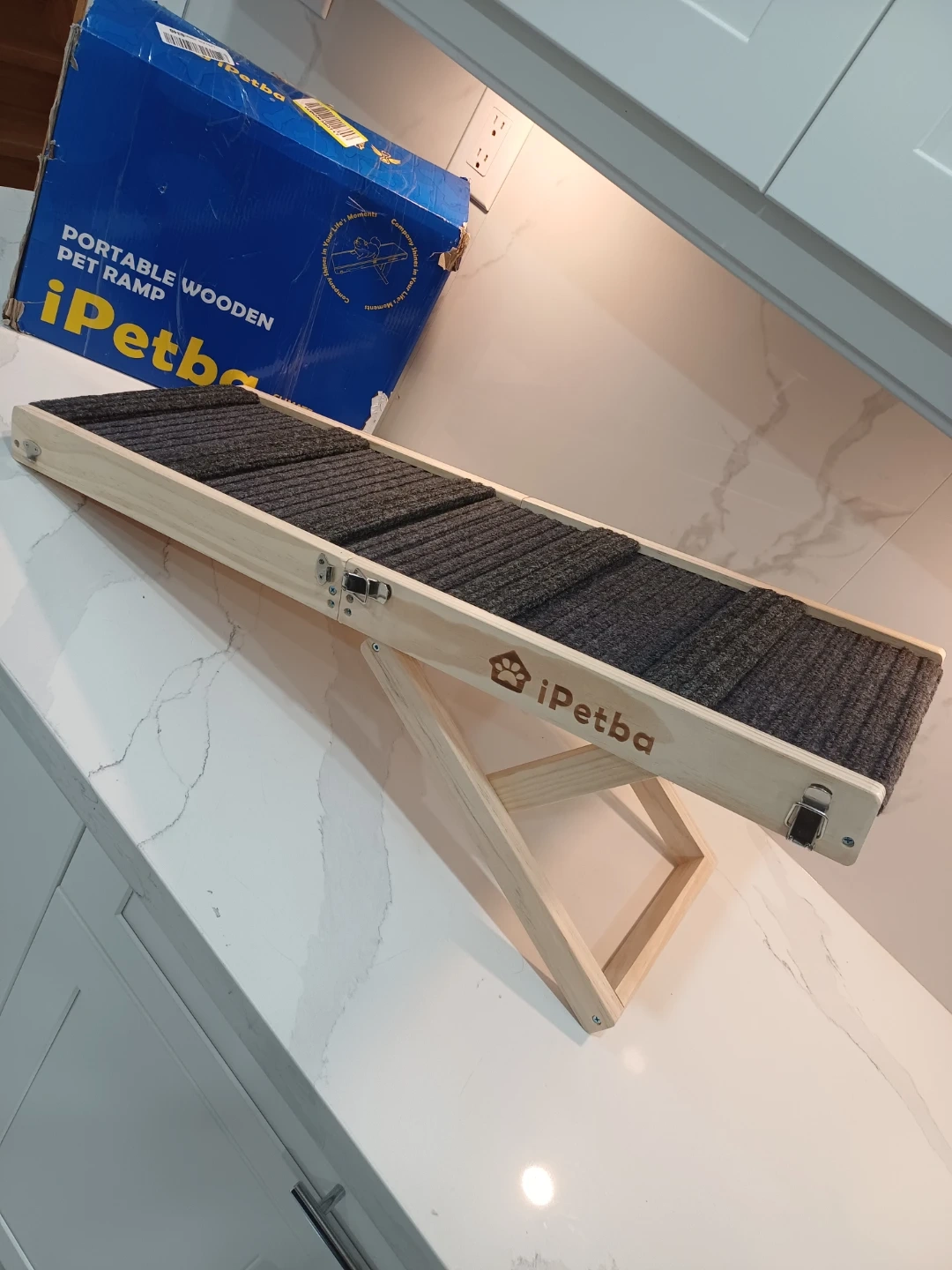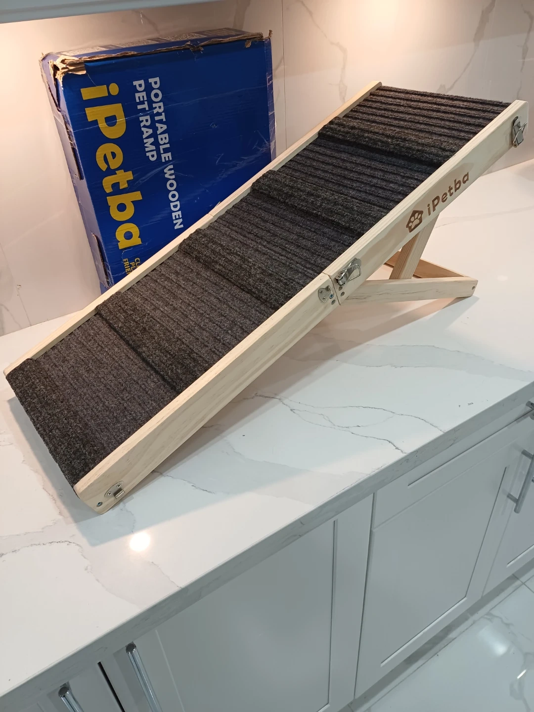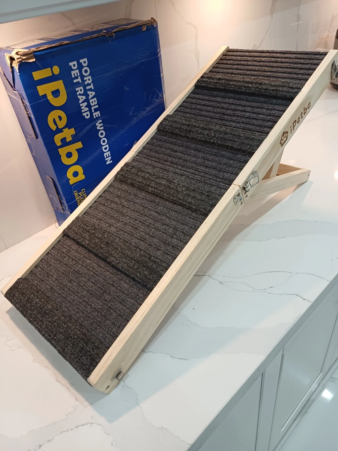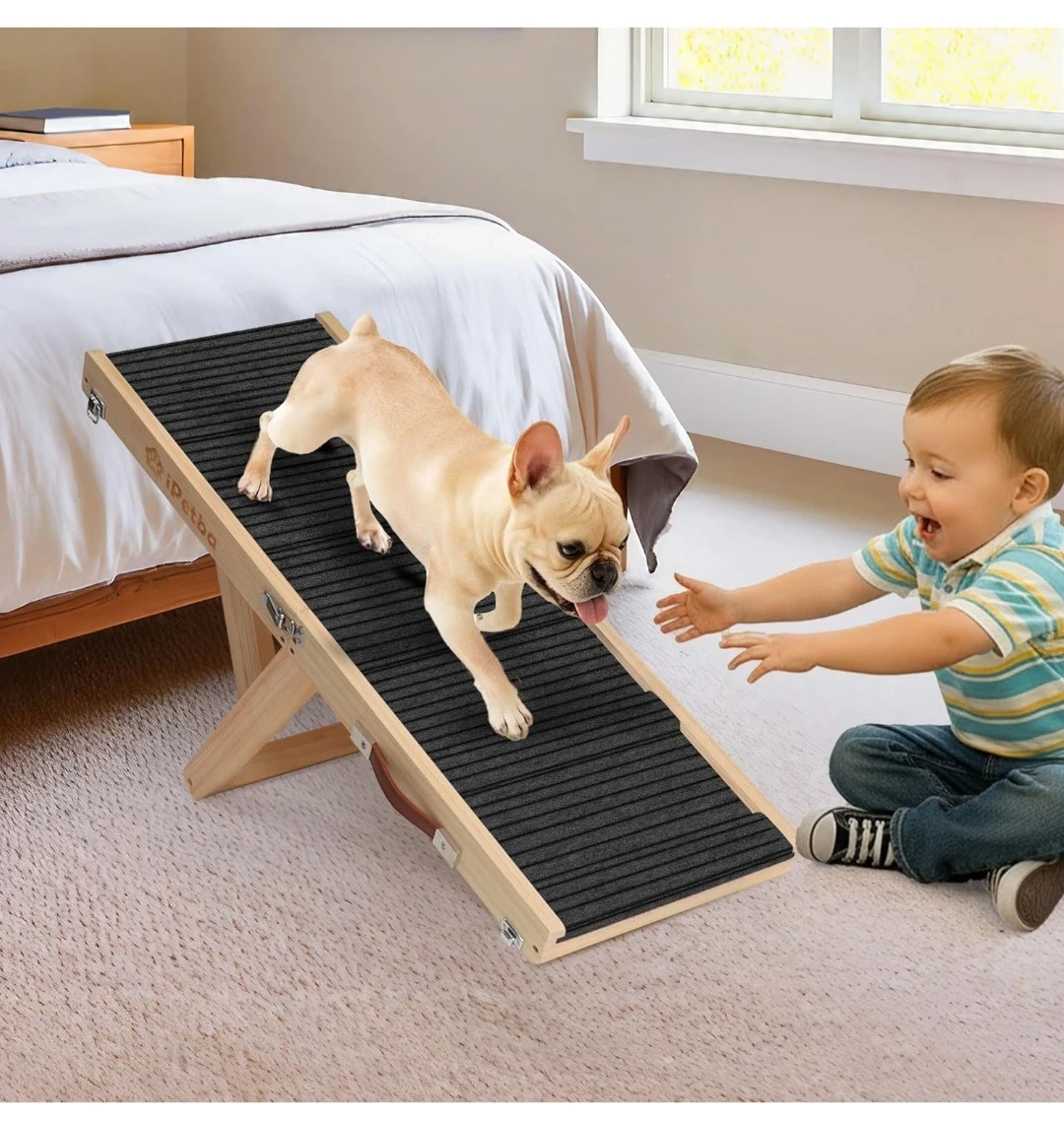 Selling an iPetba portable wooden pet ramp. It's perfect for helping your furry friend reach higher places! The ramp has kid-safe edges, a non-slip surface, and anti-slip mats to keep your pet safe and secure.