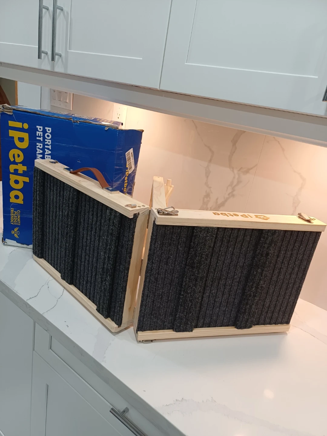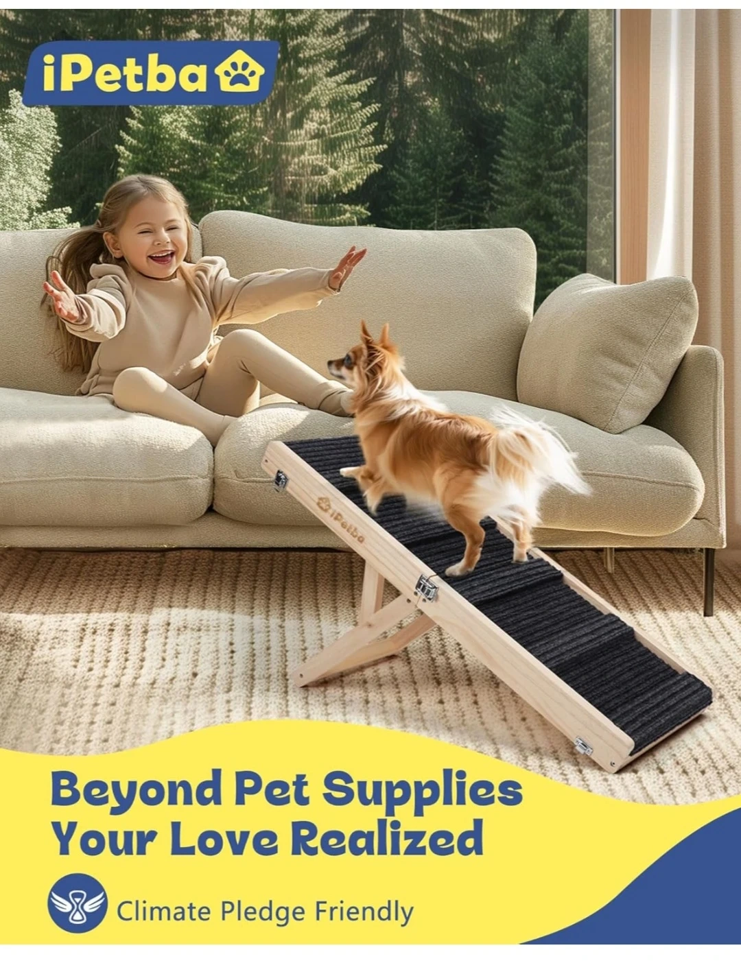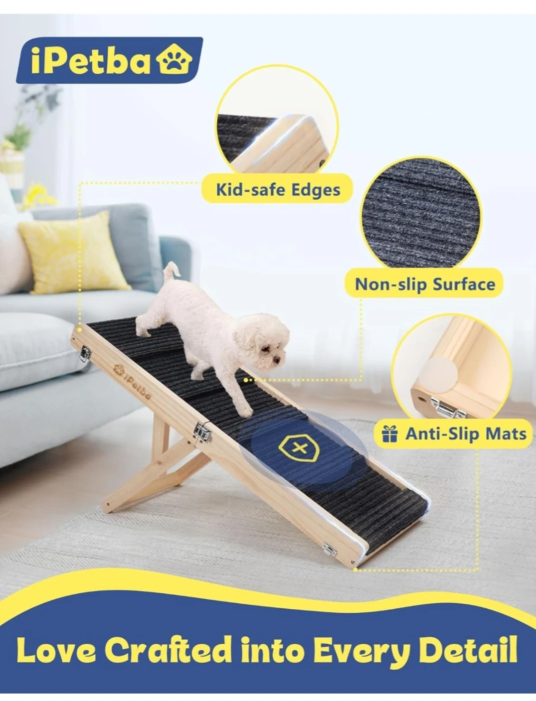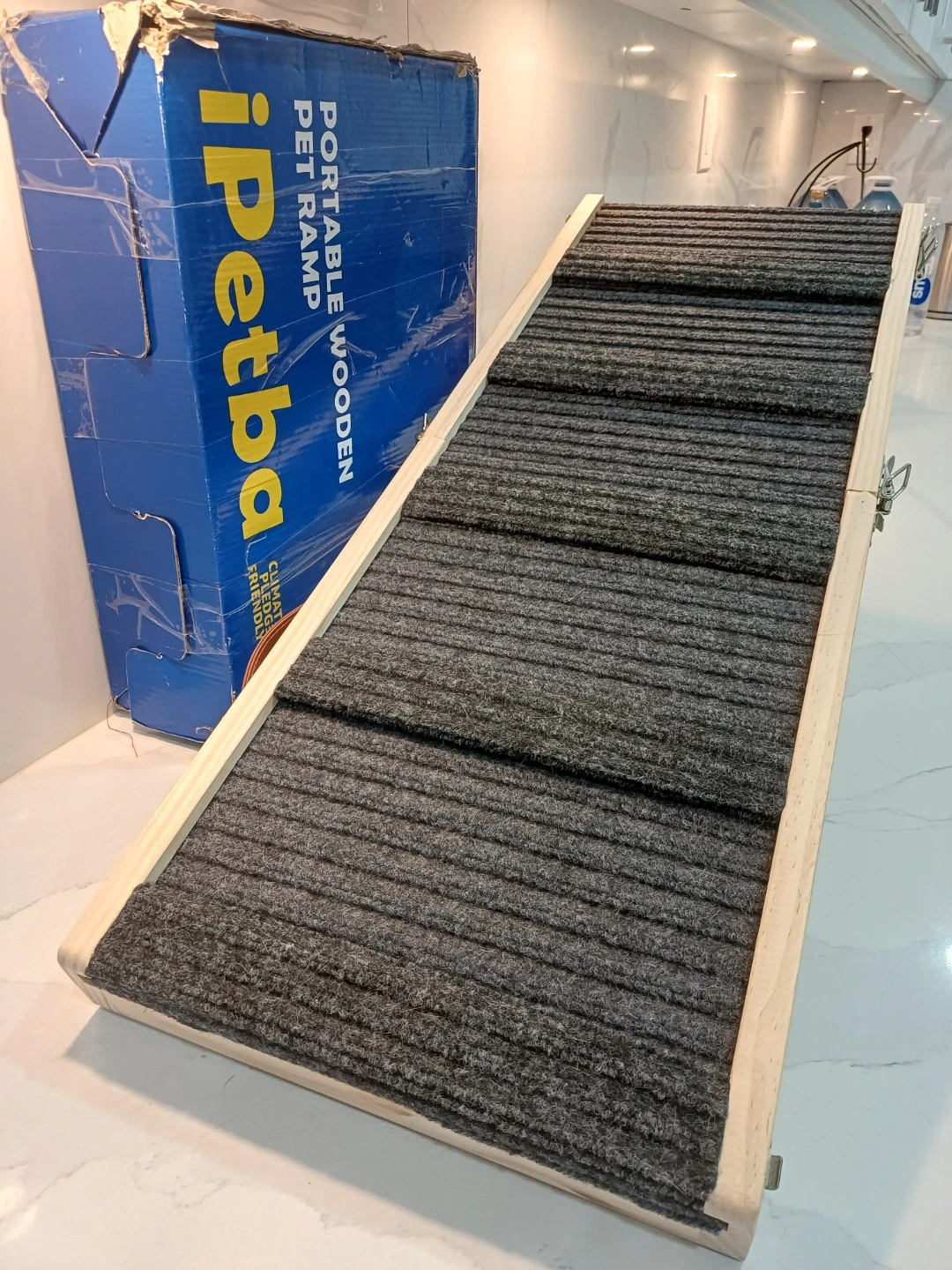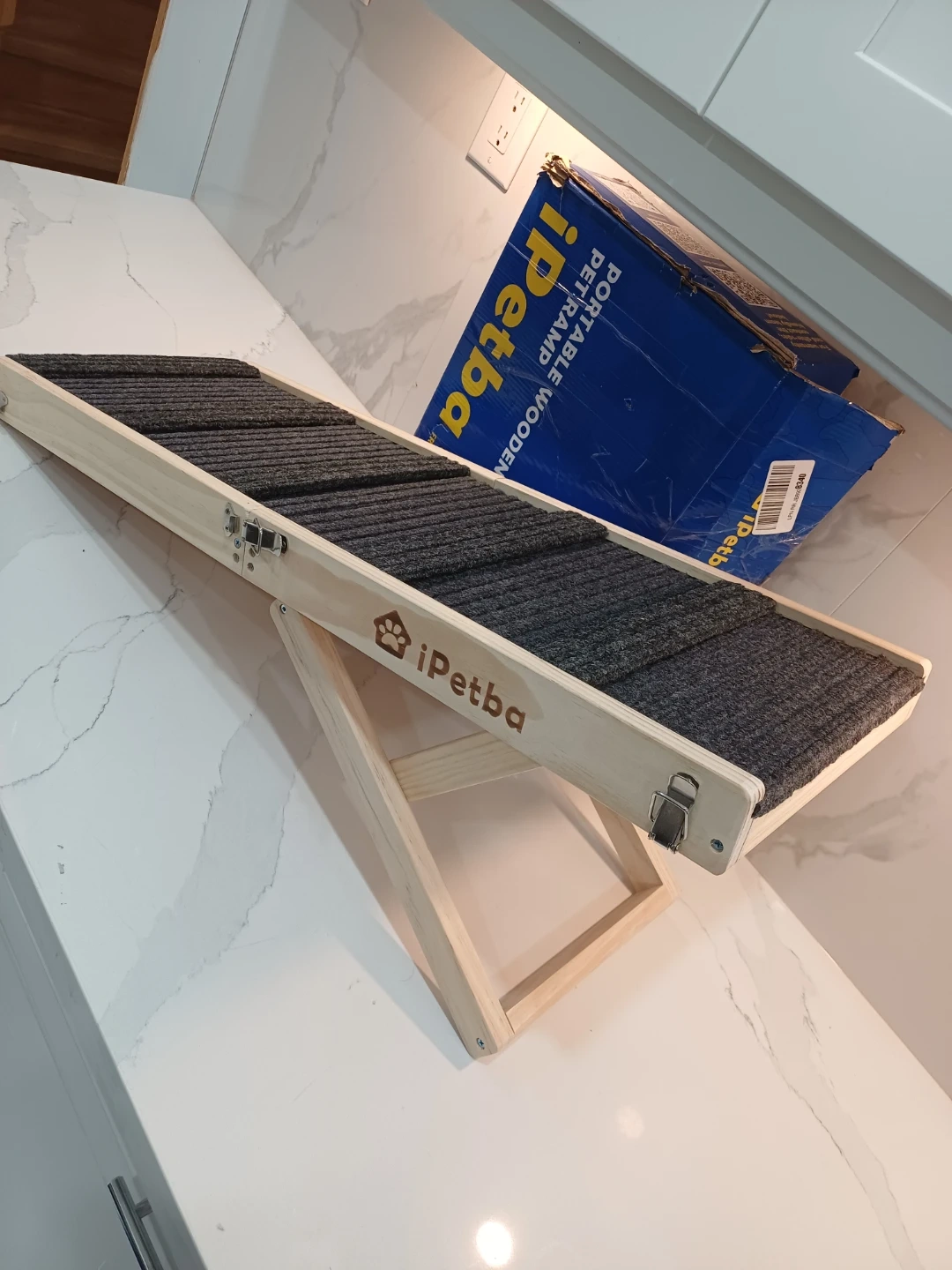 Selling an iPetba portable wooden pet ramp. It's perfect for helping your furry friend reach higher places! The ramp has kid-safe edges, a non-slip surface, and anti-slip mats to keep your pet safe and secure.