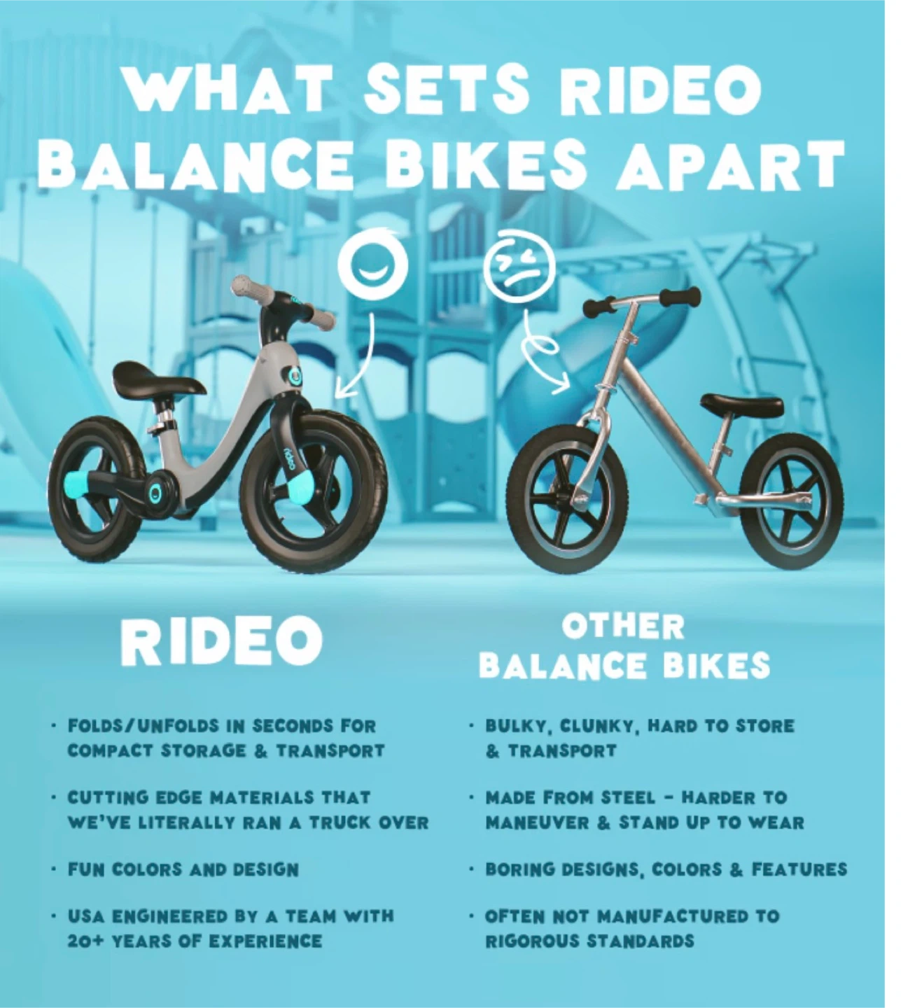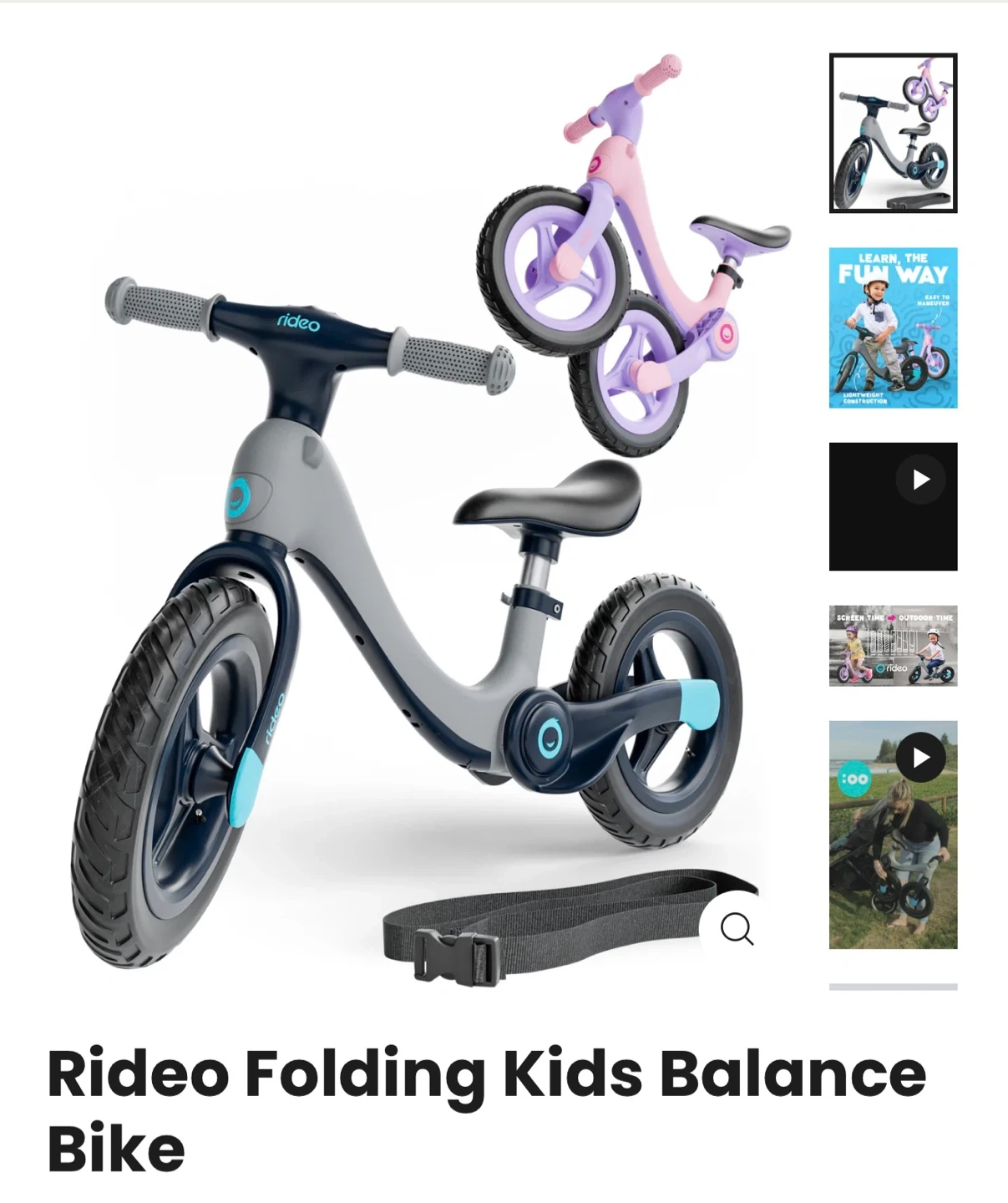 Selling a Rideo Folding Kids Balance Bike in excellent condition! It's designed for compact storage and easy transport, folding and unfolding in seconds. The bike features cutting-edge materials and fun colors. It comes with the original box and assembly components!