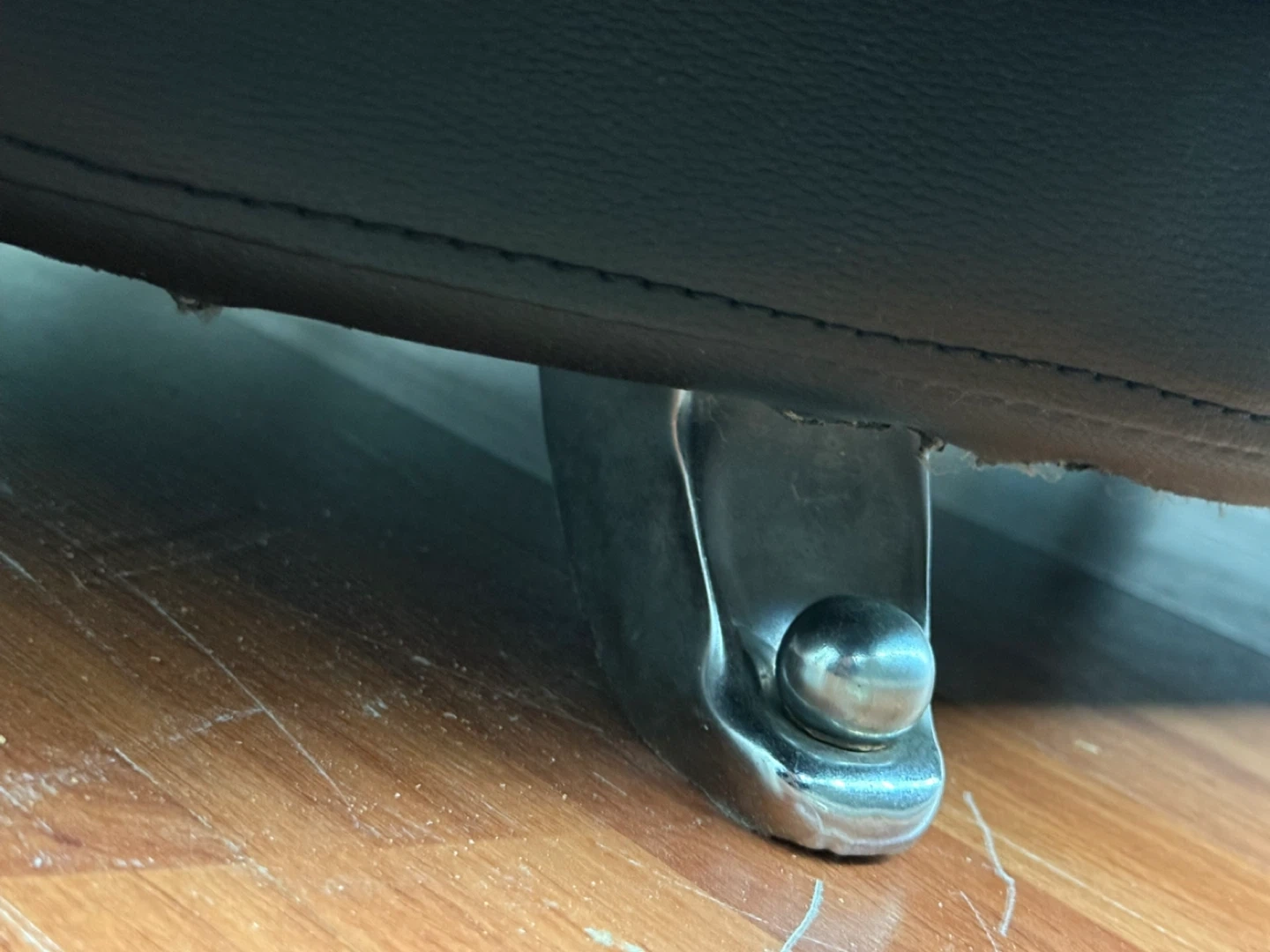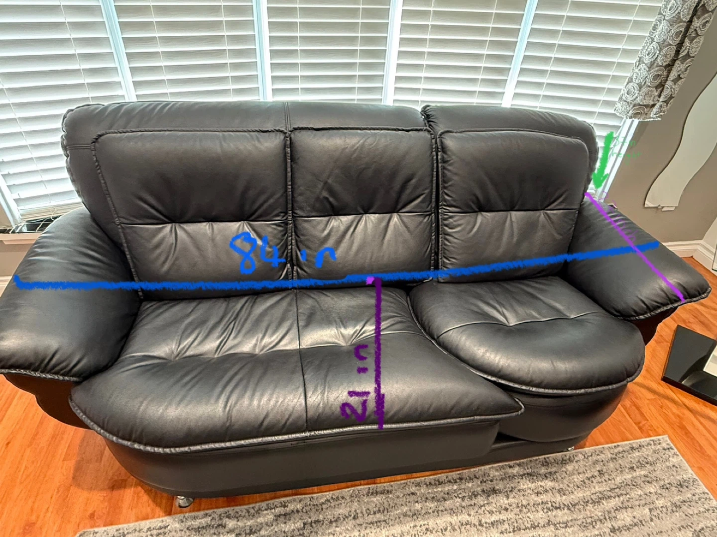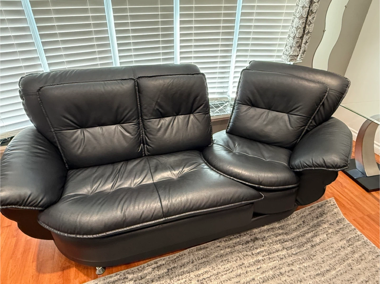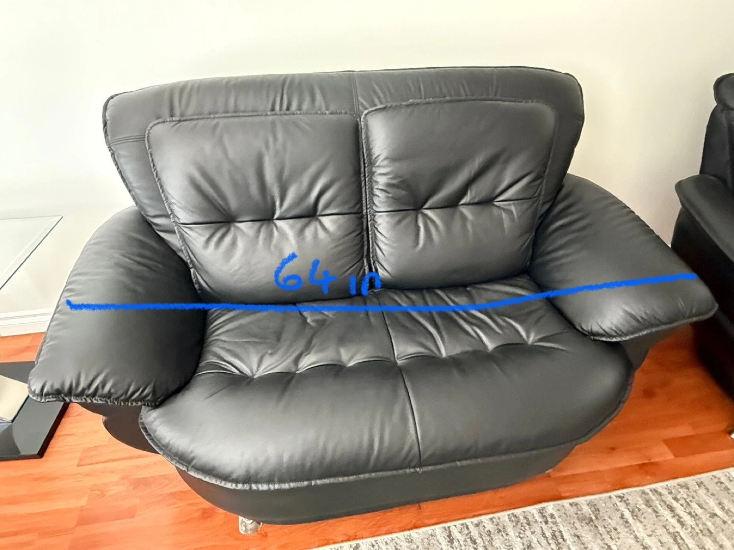 Three-piece black leather furniture set. Includes a loveseat, sofa, and armchair. Modern design. Good condition. Dimensions shown in images. Please look at the images. Some legs might need to be changed. The 2 seater has a rib as seen in pictures. Can send more pictures if needed. Overall it’s a good set. Not real leather. Pickup Finch & McCowan.