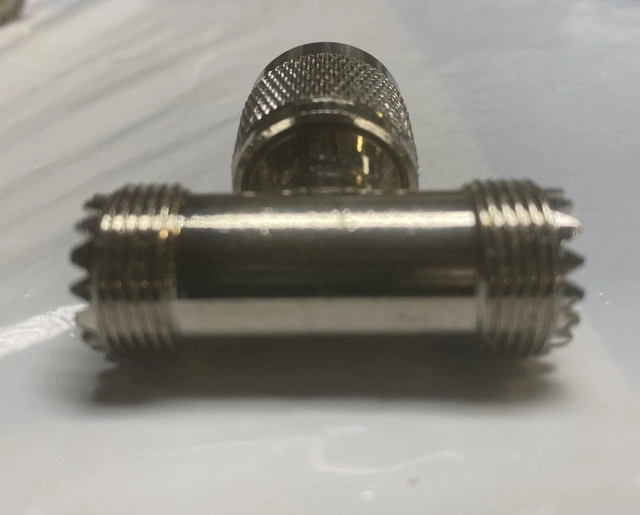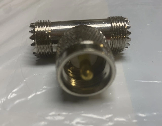 T shape 3 way UHF male to UHF female coaxial connector Connector material: Pure Copper with Great connectivity (Not Alloy). Surface treatment: Nickel plated and Gold-plated. Impedance: 50 ohm, Low-loss Using to connact a UHF female SO-239 connector or a UHF male PL-259 connector. Commonly used in RF Applications, Antennas, Wireless LAN Devices , RF Coaxial Connector, RF Coaxial cable, Wi-Fi, Radios, External Antenna, >1000 Times Mating Life Time