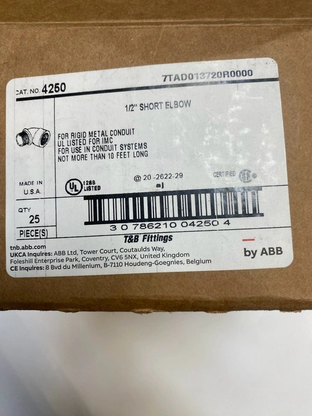 Box of 25 Thomas & Betts 4250 Conduit Elbows, Non-Insulated, Short Radius, 90° Angle, 1/2 inch, Designed for Use with Rigid/IMC Conduits, Made of Malleable Iron, Dimensions: 1-5/16 inch Diameter x 1-1/4 inch Width.