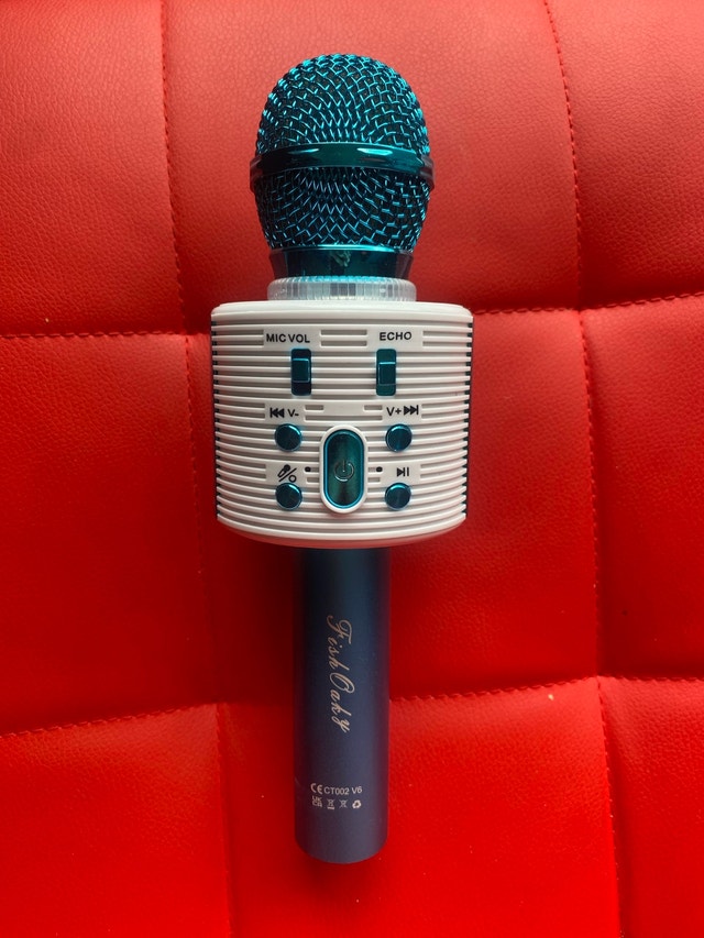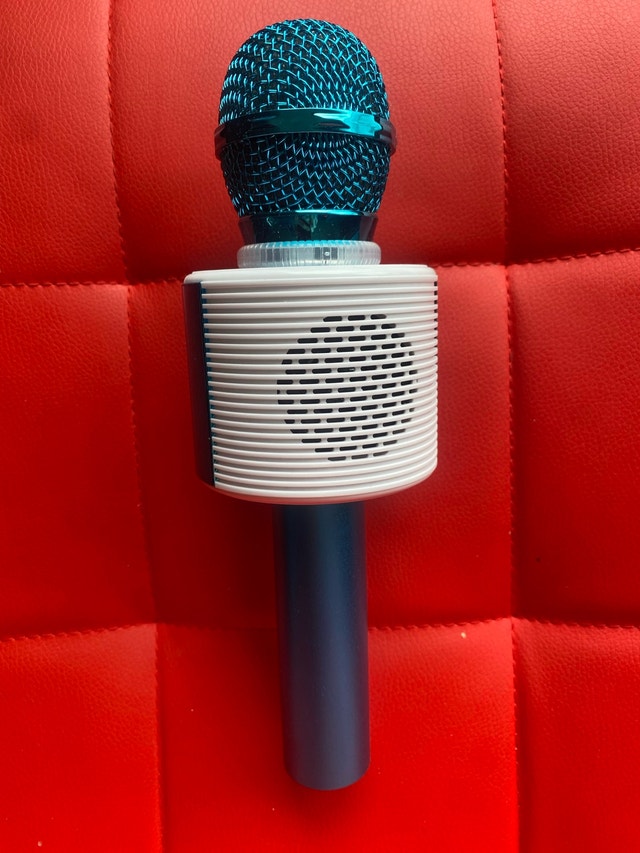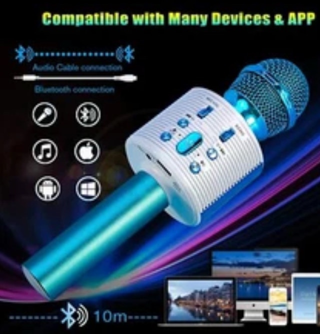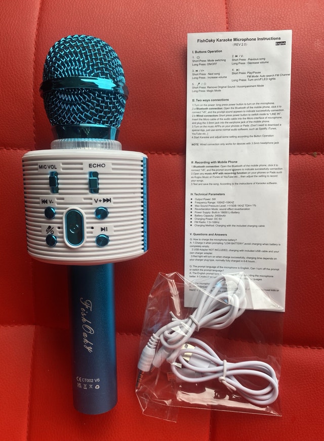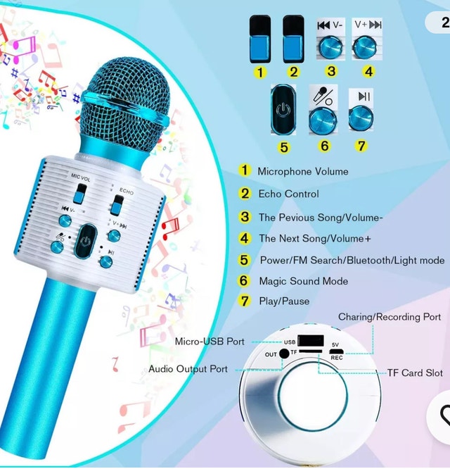 Portable karaoke microphone. Bluetooth and audio cable connection. Multiple functions: volume control, echo, song selection, recording. Includes USB charging cable. Great for singing and recording.