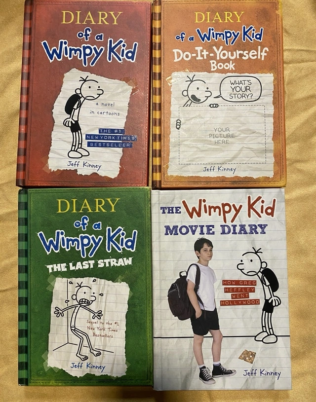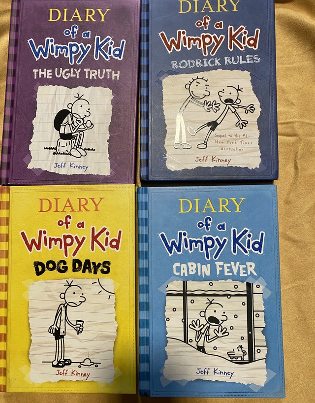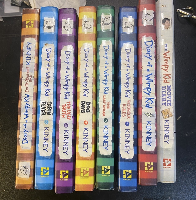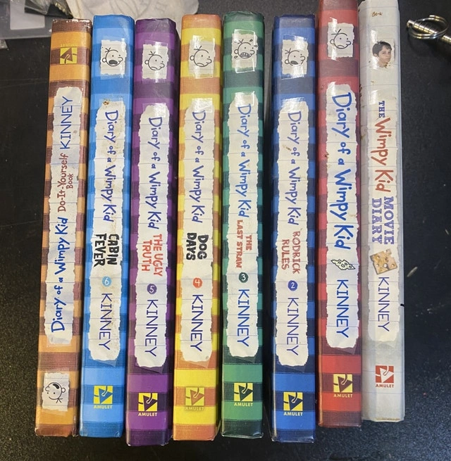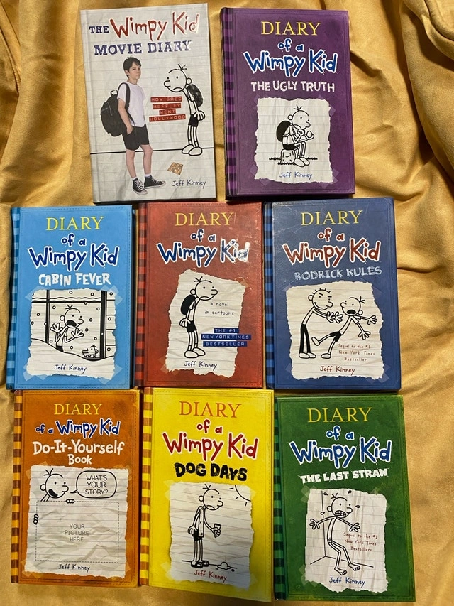 Selling a set of Diary of a Wimpy Kid books by Jeff Kinney! Titles include: - Diary of a Wimpy Kid - Diary of a Wimpy Kid: Do-It-Yourself Book - Diary of a Wimpy Kid: The Last Straw - The Wimpy Kid Movie Diary - Diary of a Wimpy Kid: The Ugly Truth - Diary of a Wimpy Kid: Dog Days - Diary of a Wimpy Kid: Cabin Fever - Diary of a Wimpy Kid: Rodrick Rules