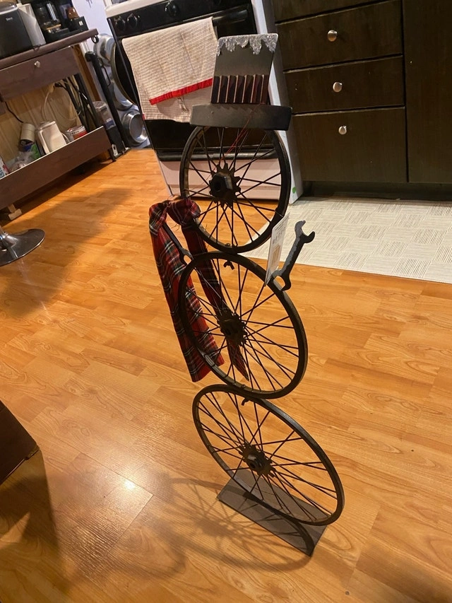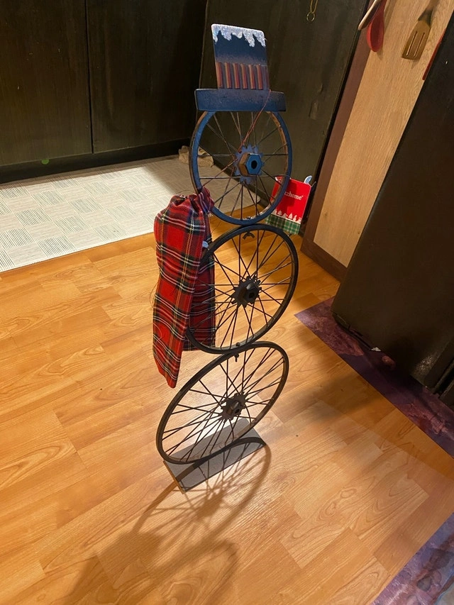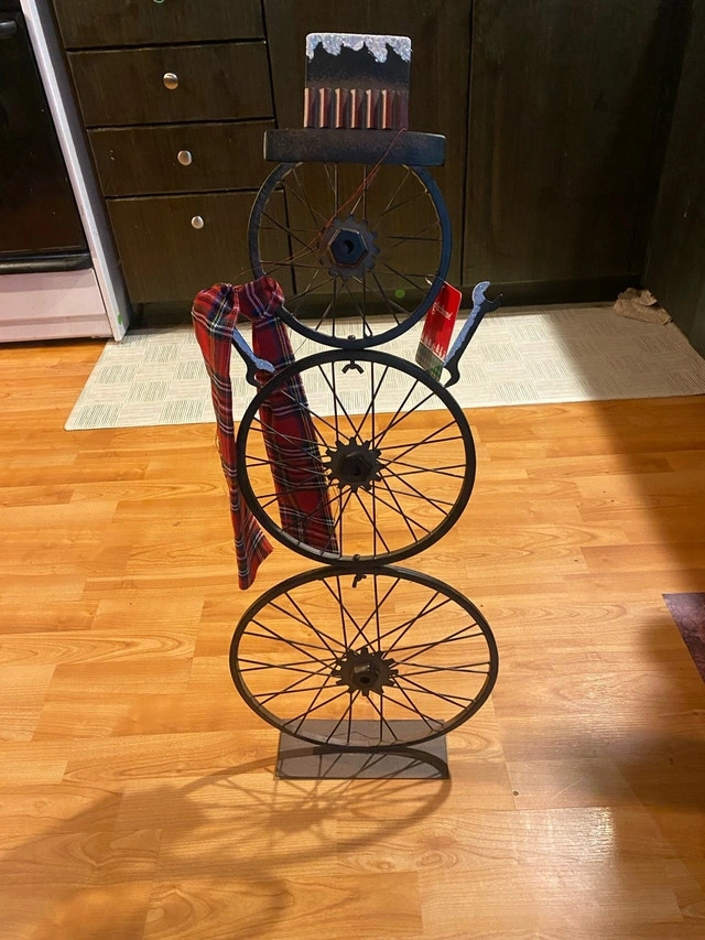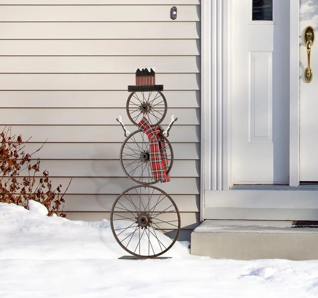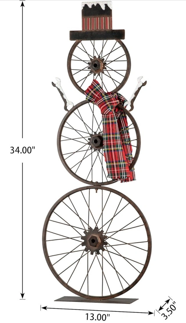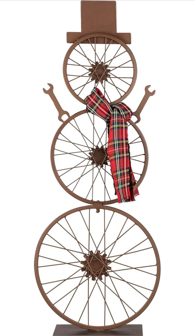 This Metal Bicycle Wheel Snowman porch sign wears a red scarf. The snowman is made up of 3 bike wheels and metal base. It's a creative and eye-catching Christmas decoration for your home . Display this decoration in indoor or outdoor locations. Freestanding Distressing finished Feature as a metal Santa, rustic decor for your home Perfect Christmas accent piece