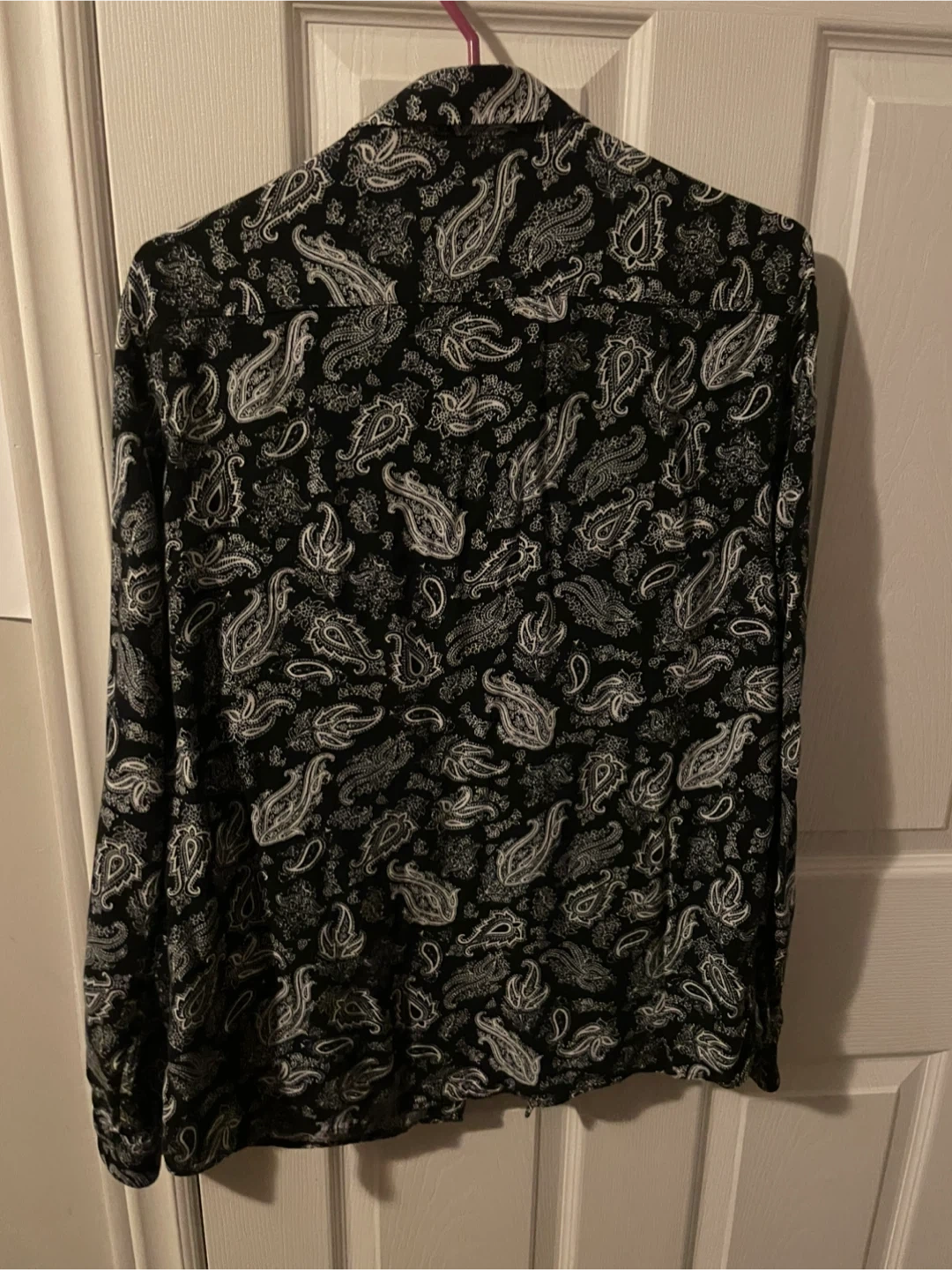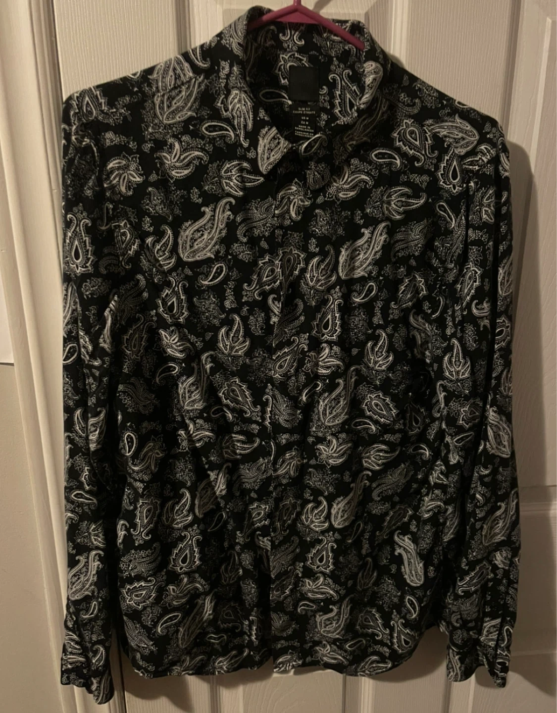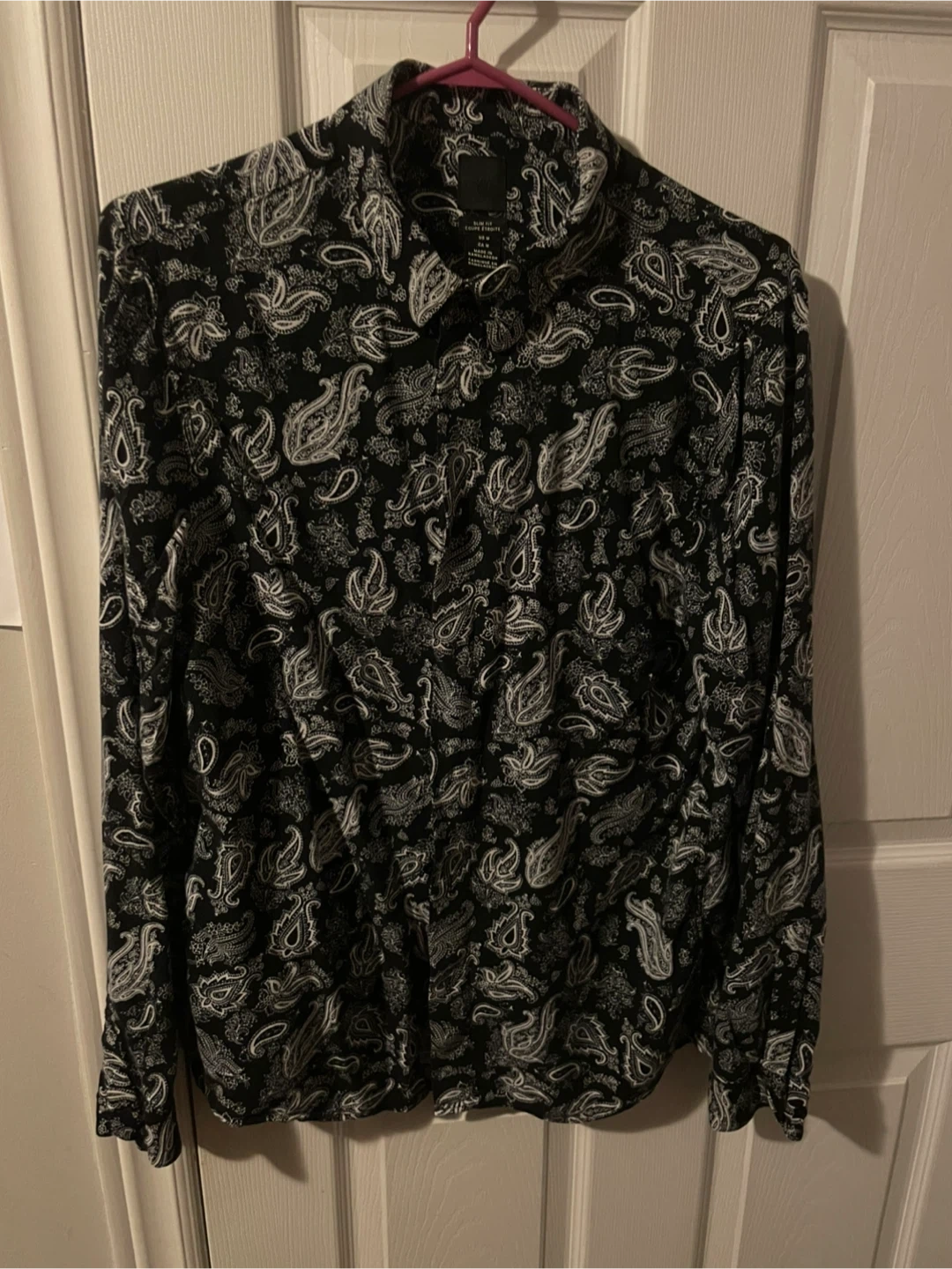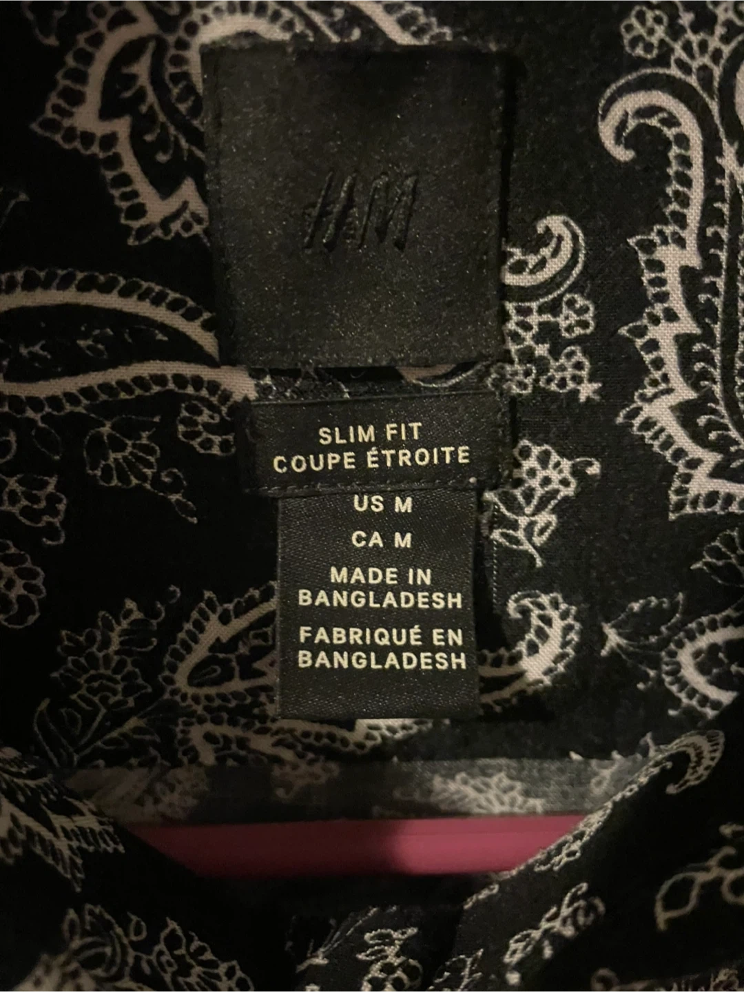 Selling a stylish H&M slim fit shirt in size medium. The shirt features a black and white paisley-like pattern. It's in great condition and ready for a new wardrobe!