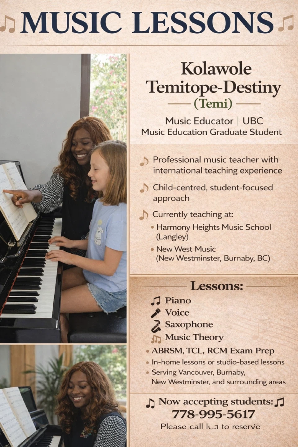 My name is Kolawole Temitope-Destiny (Temi), and I’m a professionally trained music educator and performer with many years of experience teaching piano, voice, and saxophone to children, teens, and adults.