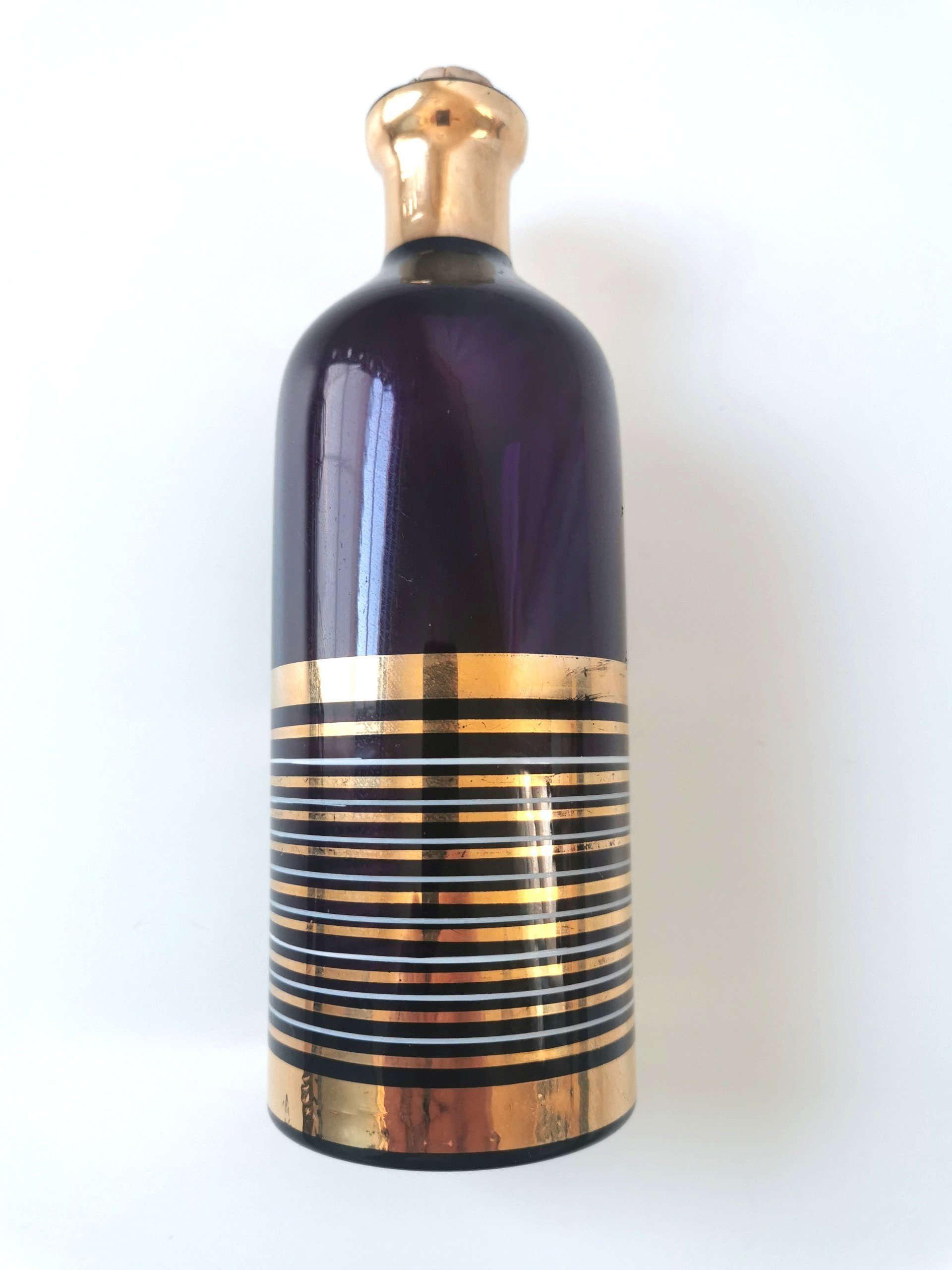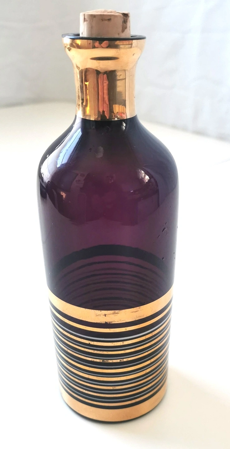 This is an authentic Mid-Century Modern (MCM) amethyst glass decanter, manufactured in Czechoslovakia (Bohemia region) circa 1962. This piece represents the "Brussels Style" of the early 60s, featuring a deep royal purple glass body accented by elegant, horizontal gold-gilt banding.