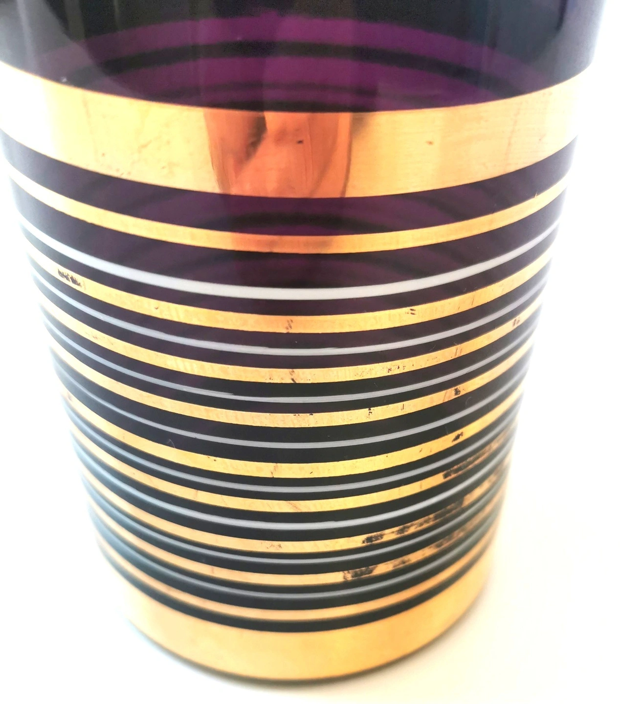 Gold Banding: There is slight, age-appropriate wear/fading on the gold-gilt bands (primarily on the mid-section), which is common for barware of this era and confirms its vintage authenticity.