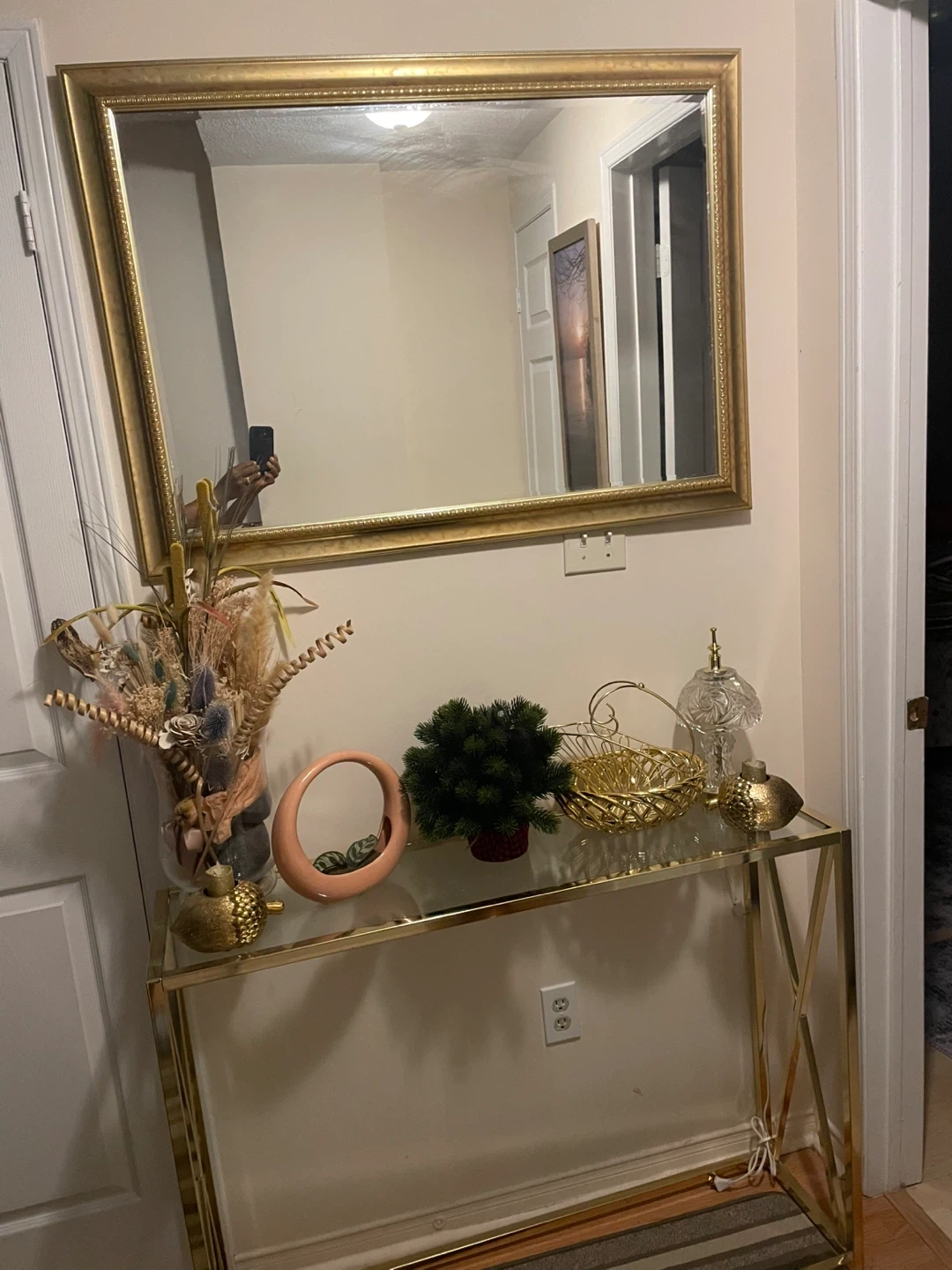Selling a gold framed wall mirror and table console. It's in great condition and would look lovely in an entryway or living room! The gold frame adds a touch of elegance to any space.