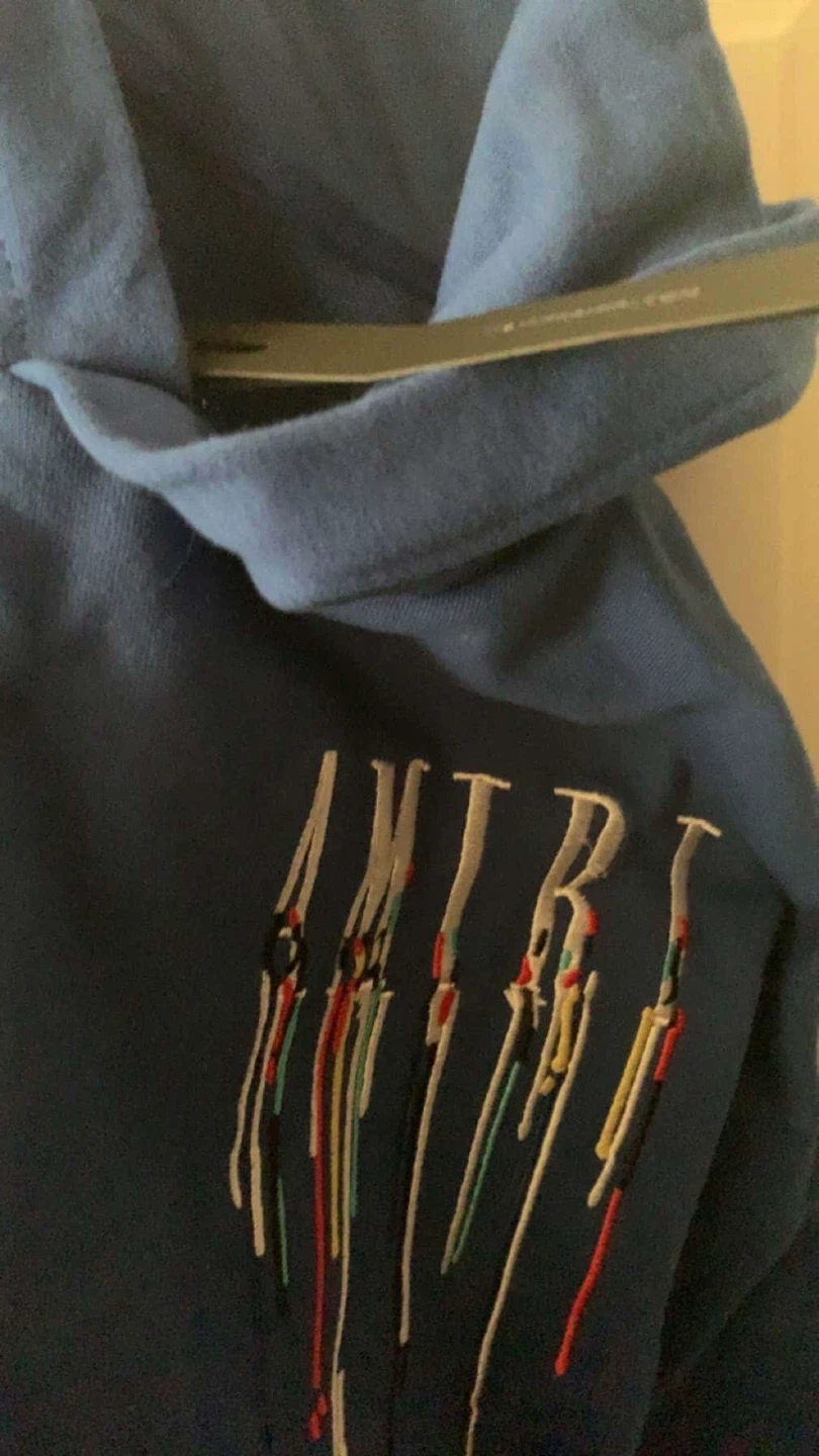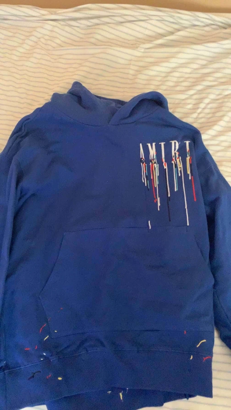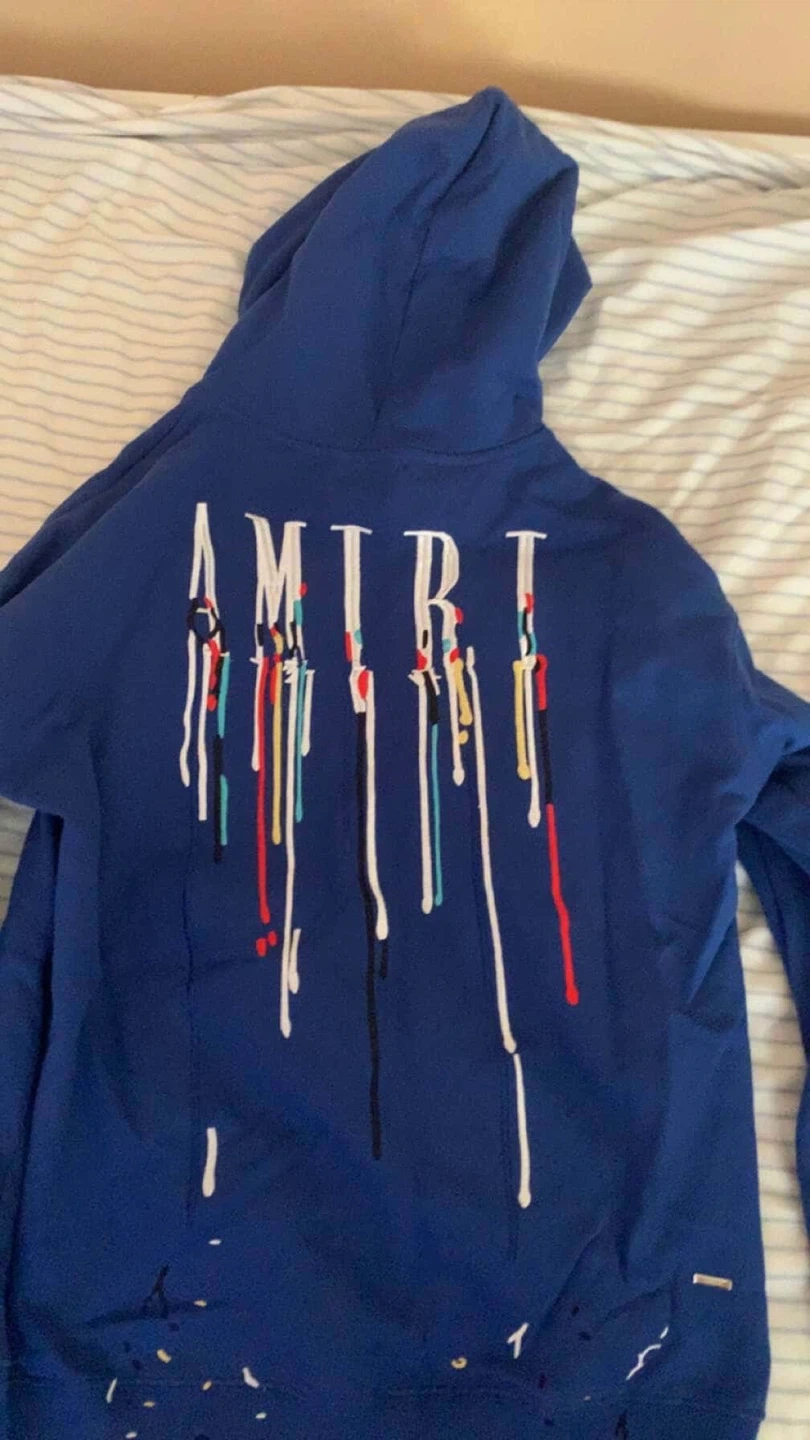 Selling a blue AMIRI hoodie. It has a unique design on the front and back with colourful accents. It's in good condition and ready for a new owner!