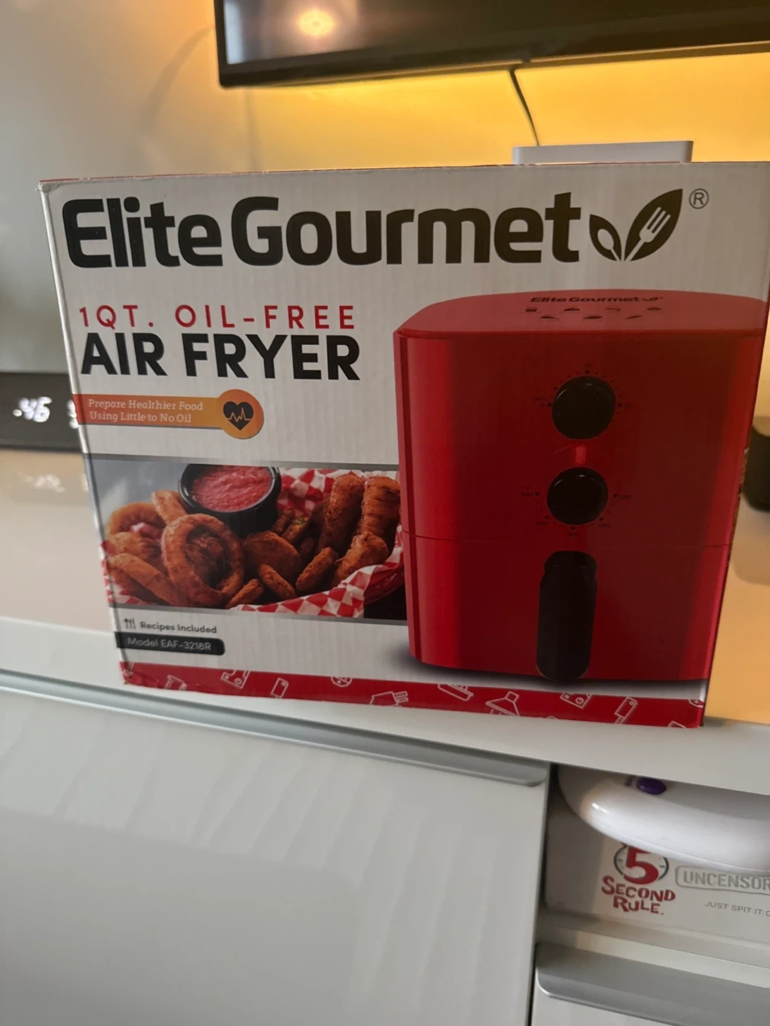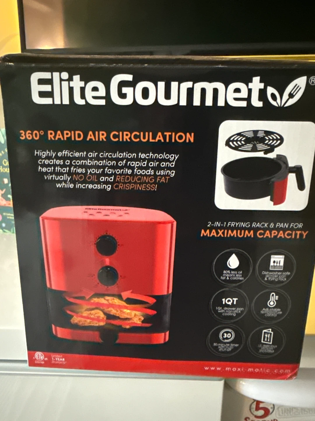 I'm selling a brand new Elite Gourmet 1QT Oil-Free Air Fryer! It comes in its original box. It features 360° rapid air circulation technology. This air fryer creates a combination of air and heat that fries your favorite foods using virtually no oil while increasing crispiness!