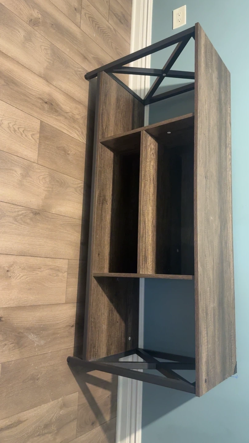 This is a wood bookshelf with a metal frame. It is in good condition and measures approximately 58 inches tall and 26 inches wide. Perfect for storing books or displaying decor