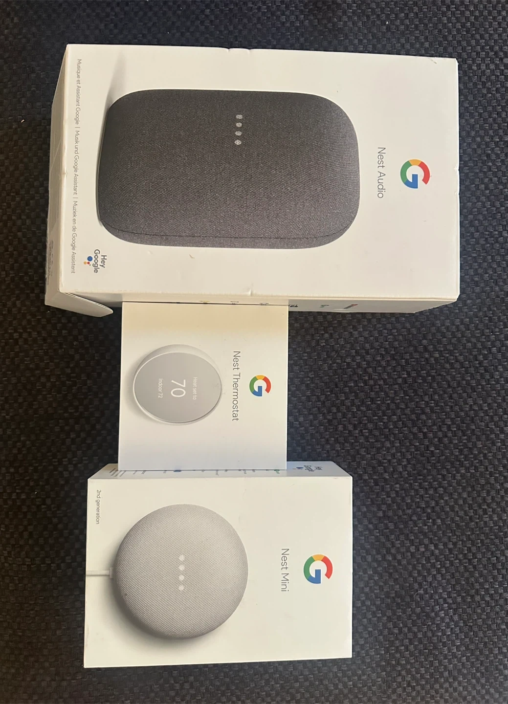 Selling a bundle of Google Nest devices, all in excellent condition! Includes a Nest Audio, Nest Thermostat, and a 2nd generation Nest Mini. Perfect for setting up a smart home system!