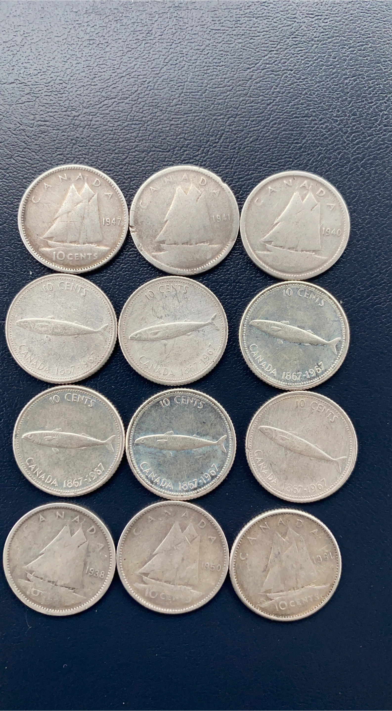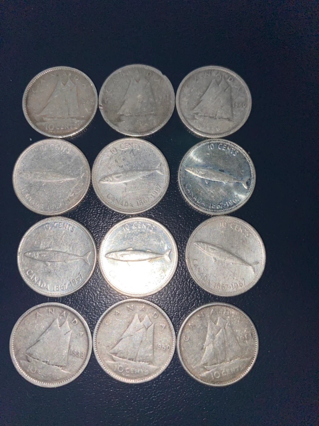 Selling a collection of vintage Canadian 10 cent silver coins. These coins feature different designs and years, including the Bluenose schooner and the mackerel design. They range from the 1930s to the 1960s. A great addition to any coin collection!