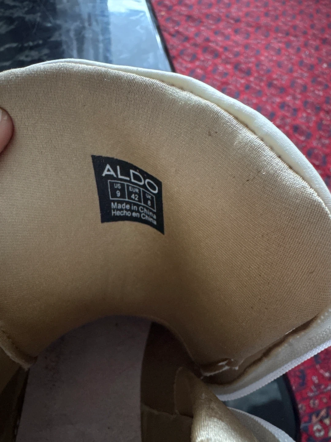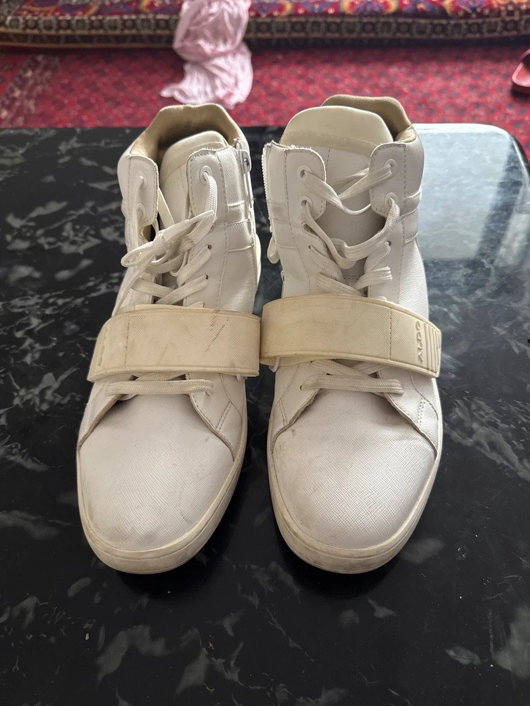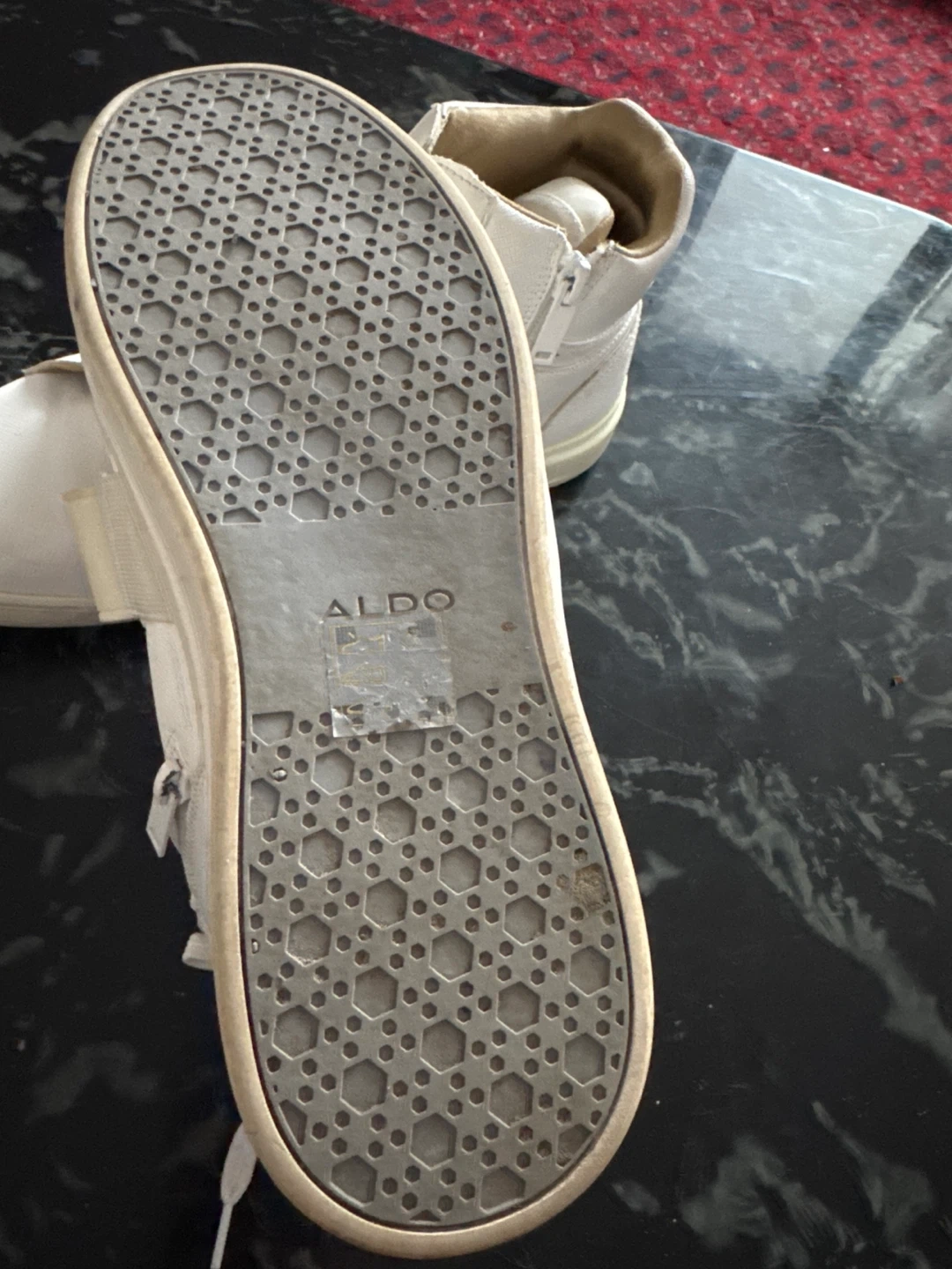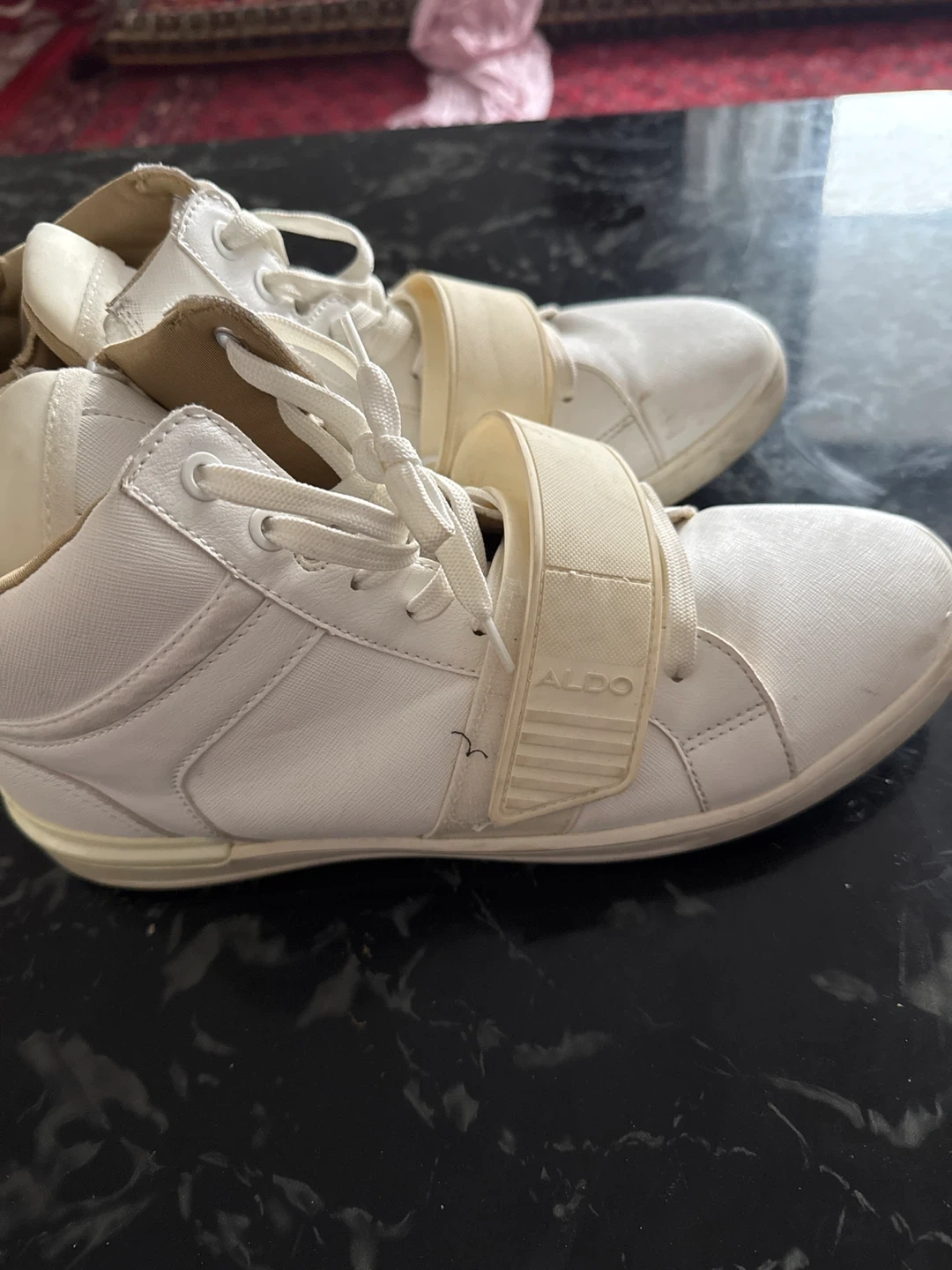 Selling a pair of Aldo sneakers in a size 9. They are white and have some wear, but still have lots of life left!