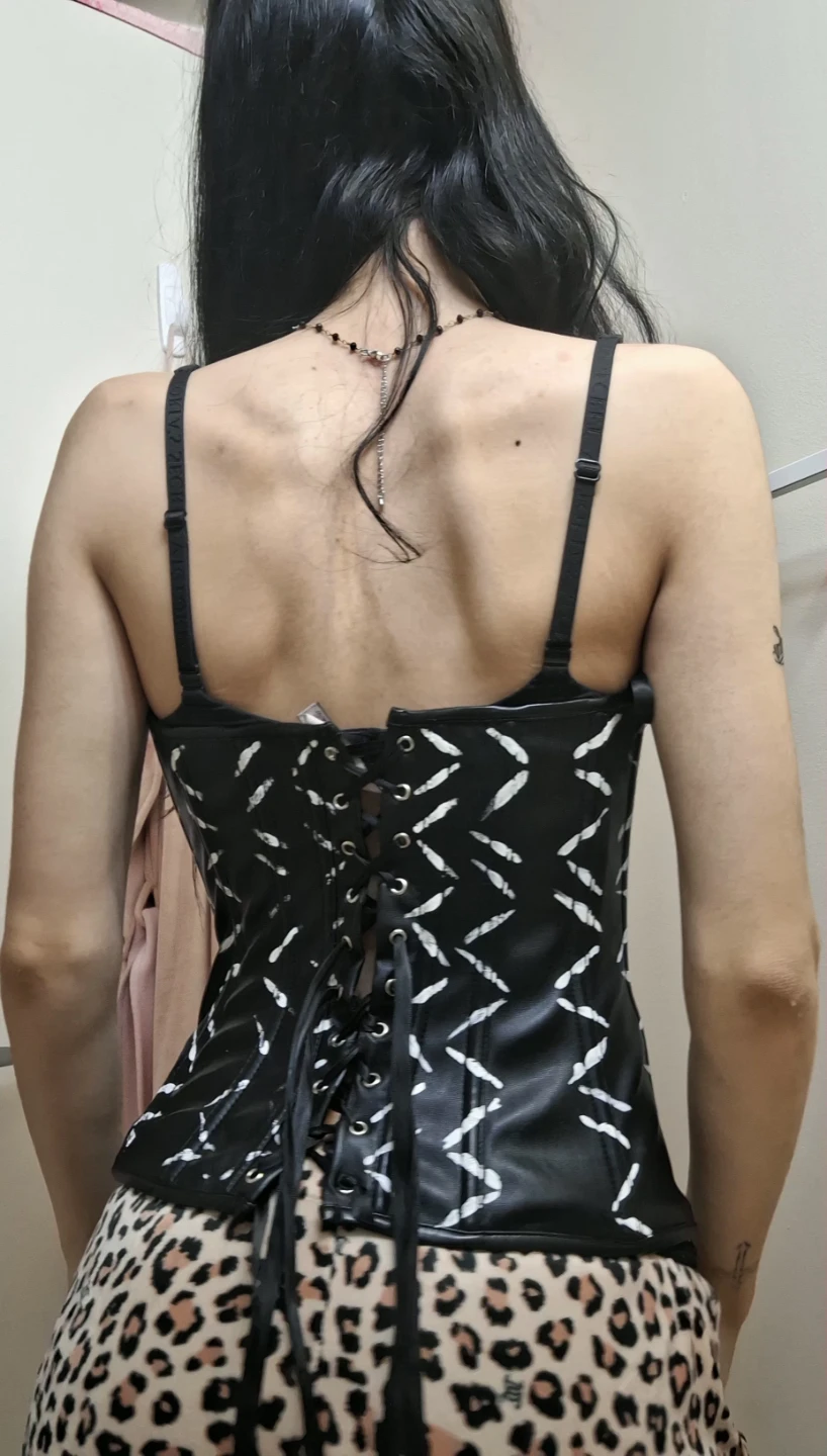 Selling a black corset top with a front zipper and lace-up back. It has white detailing and is in great condition!