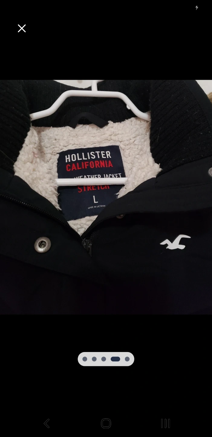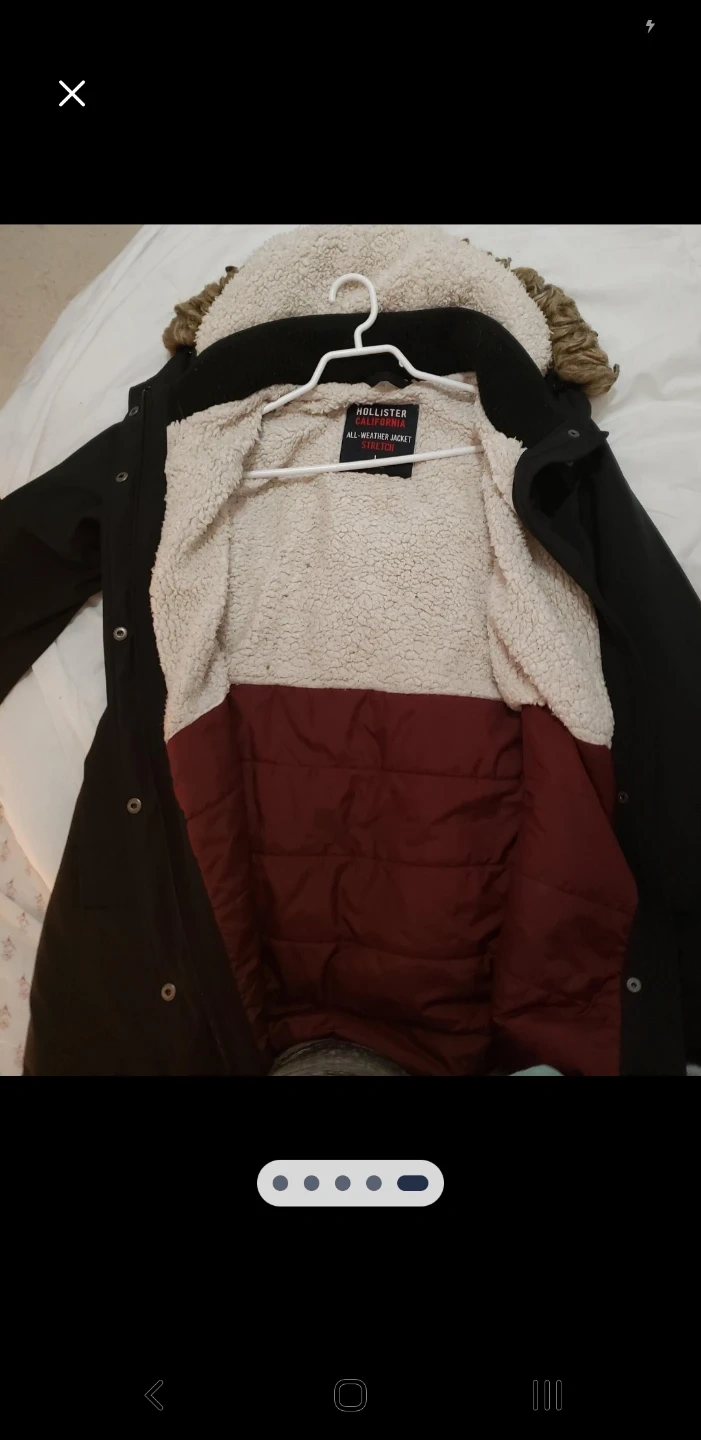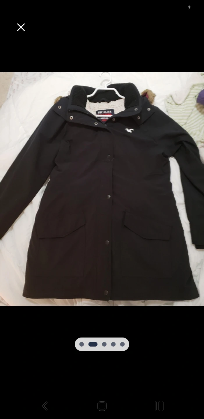 Selling a Hollister California all-weather jacket in size L. It features a cozy, warm lining and a hood with fur trim. Perfect for staying warm and dry during the colder months!