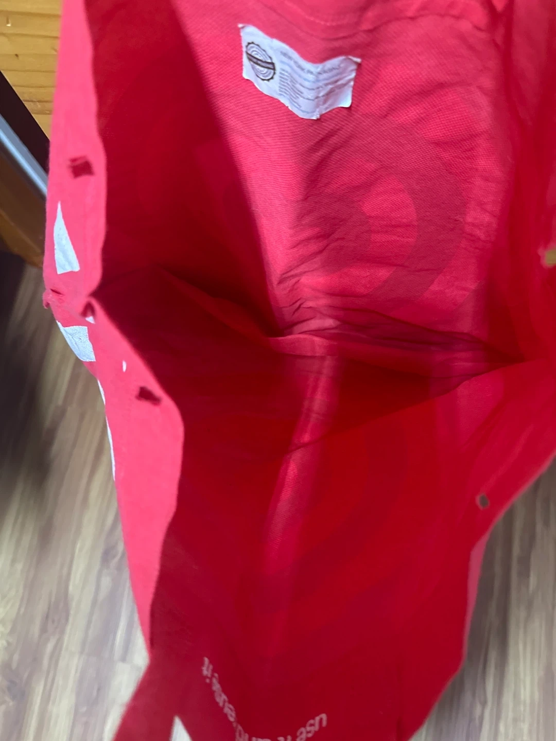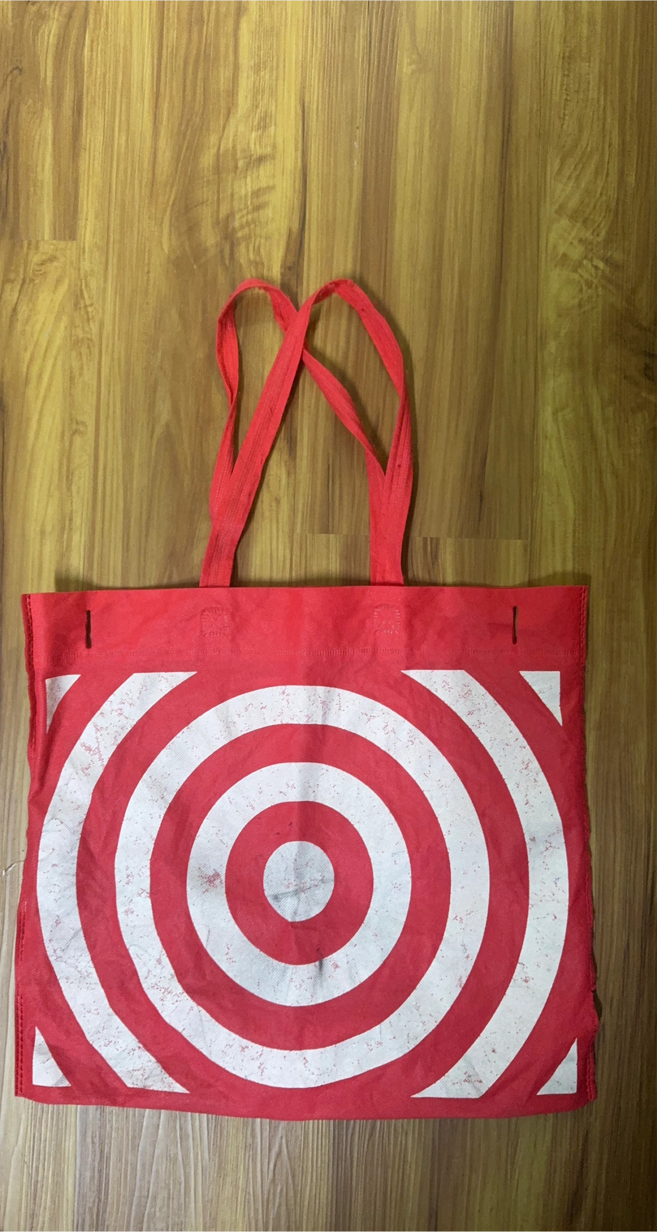 I'm selling a red tote bag from Target! It features a white target logo on the front. Perfect for shopping or carrying everyday essentials