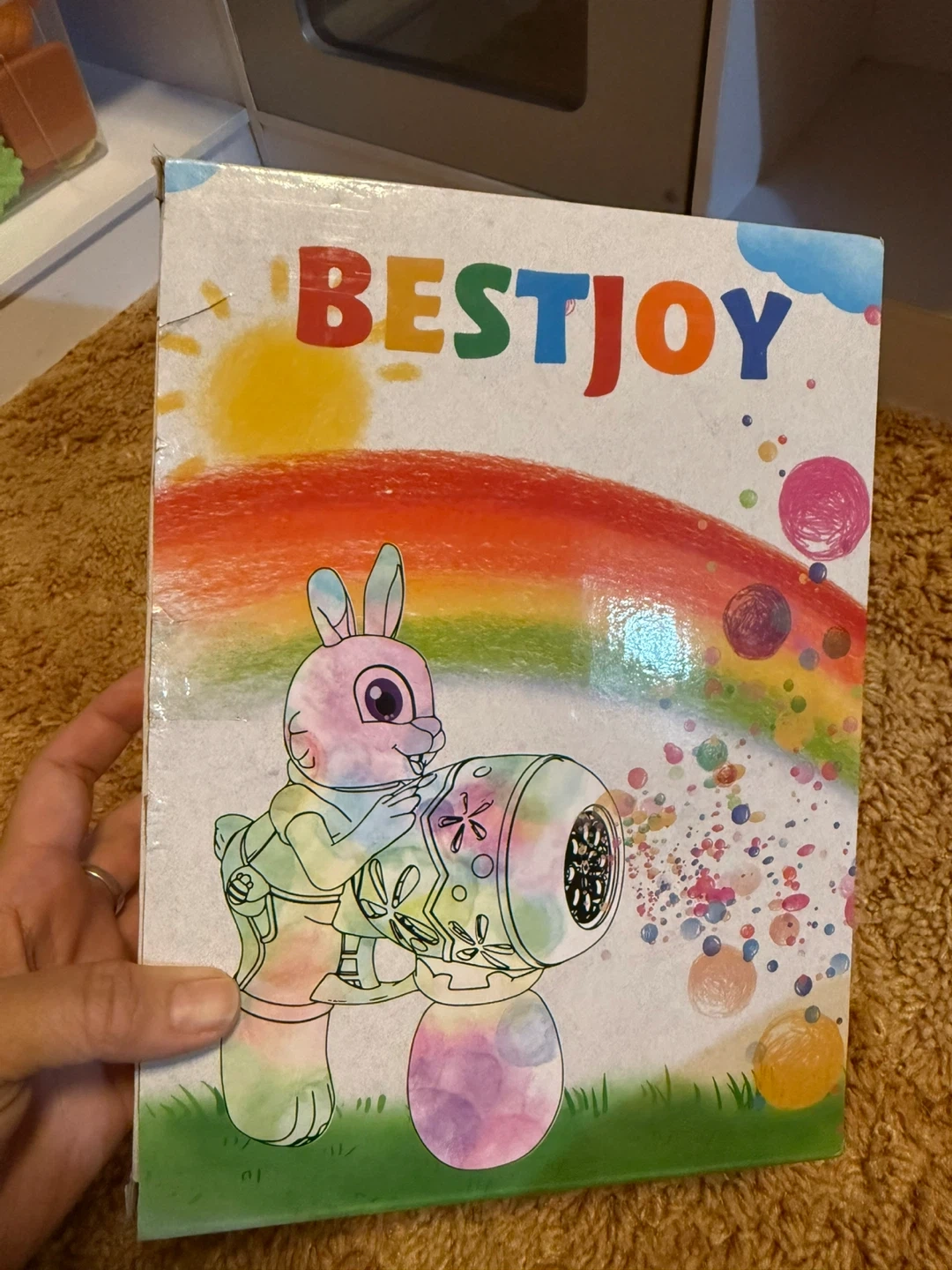 Selling a BESTJOY bubble gun toy. The box features a colorful design with a bunny character shooting bubbles, perfect for kids' outdoor fun!