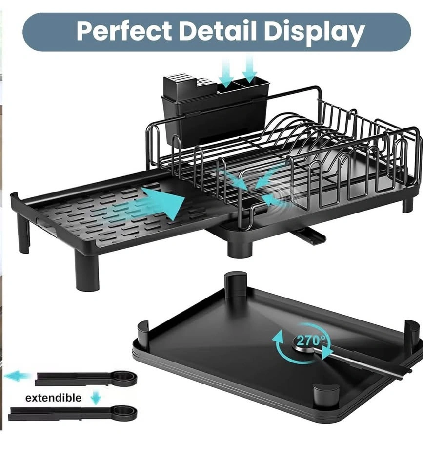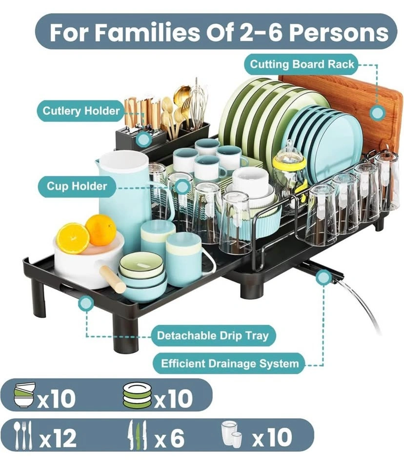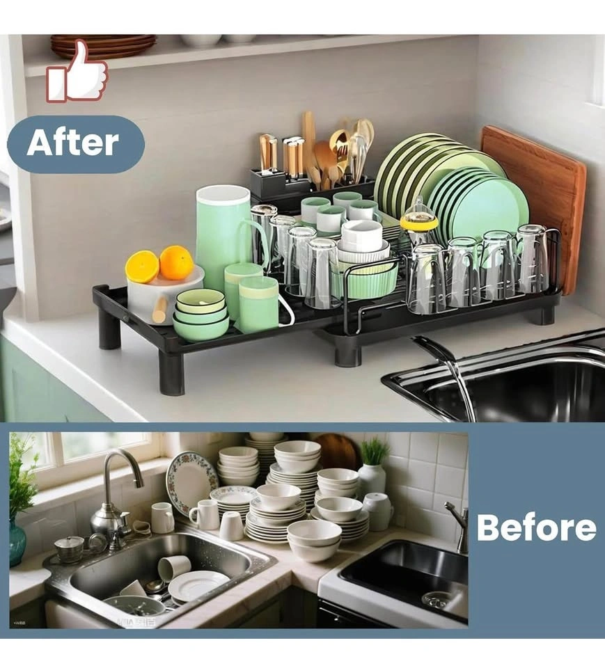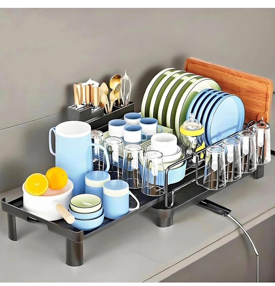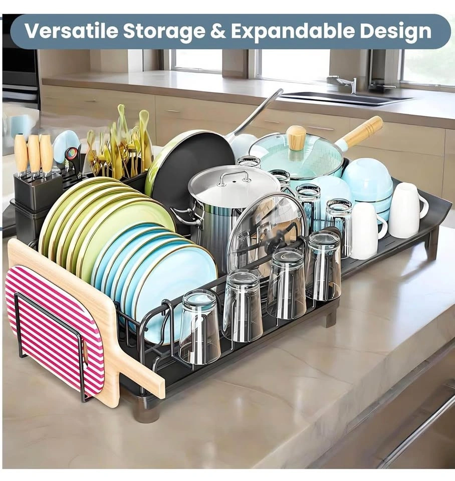This dish drying rack is definitely an upgrade from your old dish rack. The expandable black design frees up counter space and creates a neat and clean kitchen. It features designated areas for plates, cups, bowls, pans & pots, wine glasses, utensils, and even dishwashing tools, keeping your kitchen essentials neatly organized.