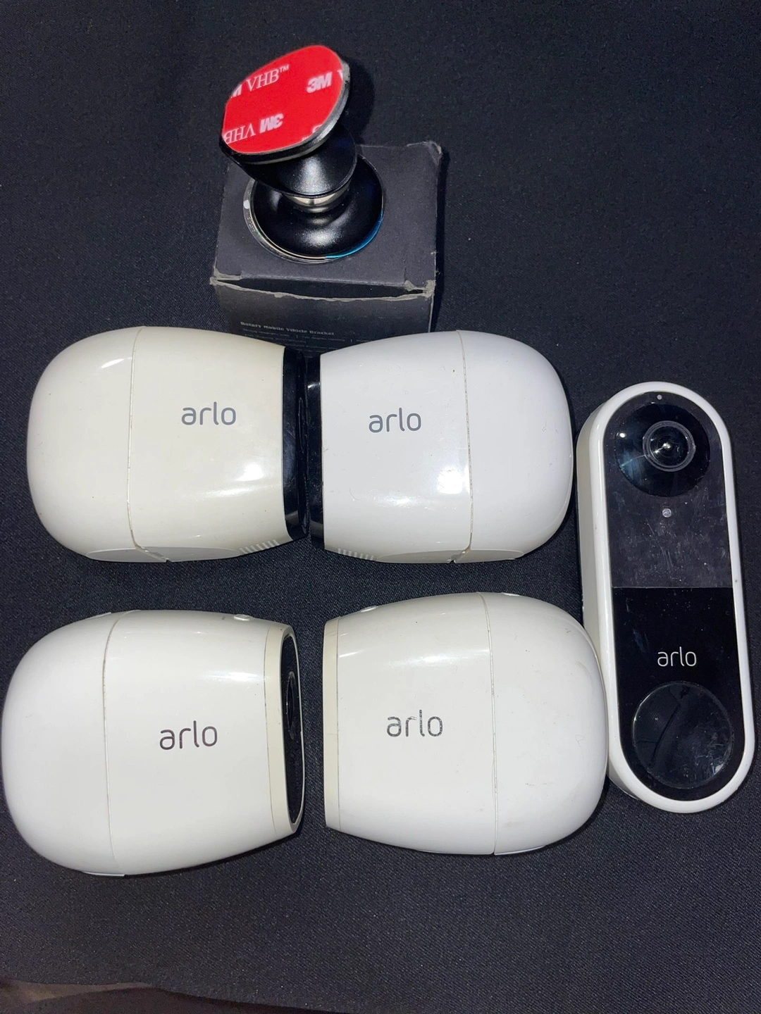 There are 4 Arlo pro/2 cameras, 1 doorbell camera face (there is no back), and 1 new magnetic mount. These are listed all for $40 but will accept $30 if you can pick them up by tomorrow 24Dec. You must mention discount price in any communication. Cash Only