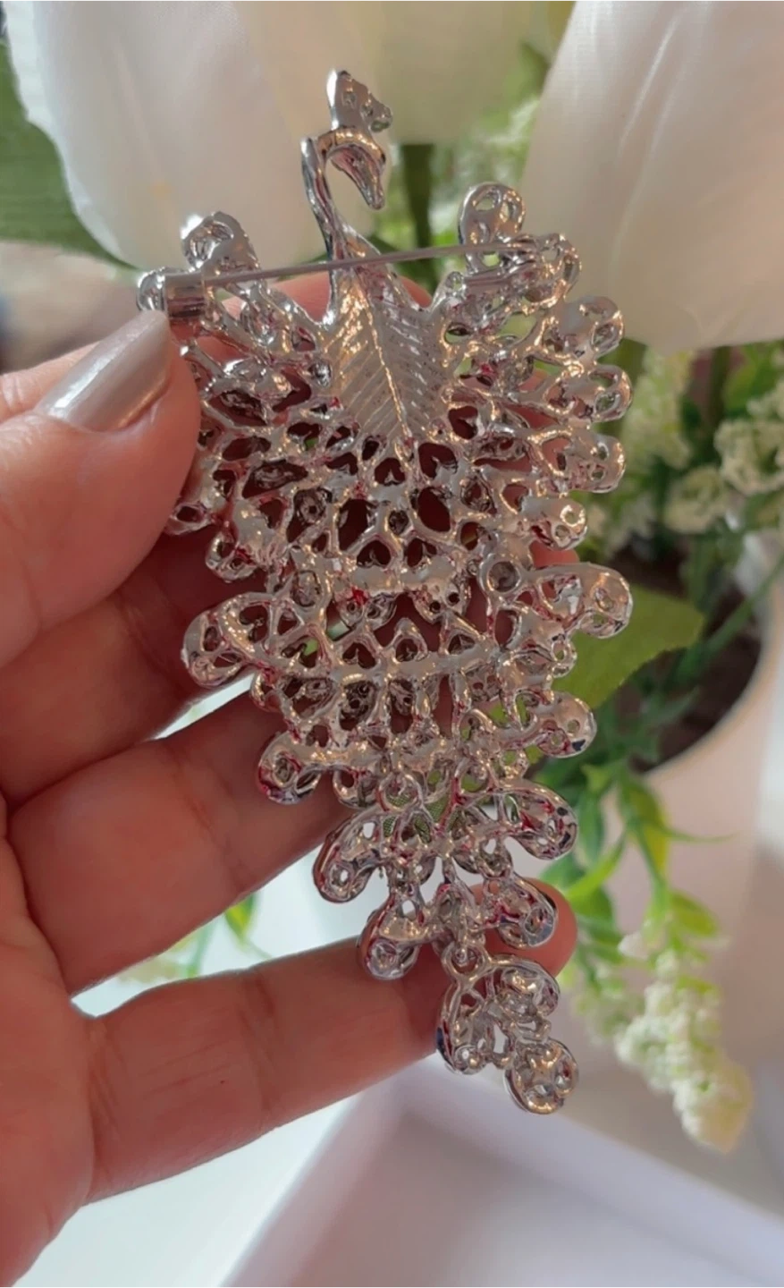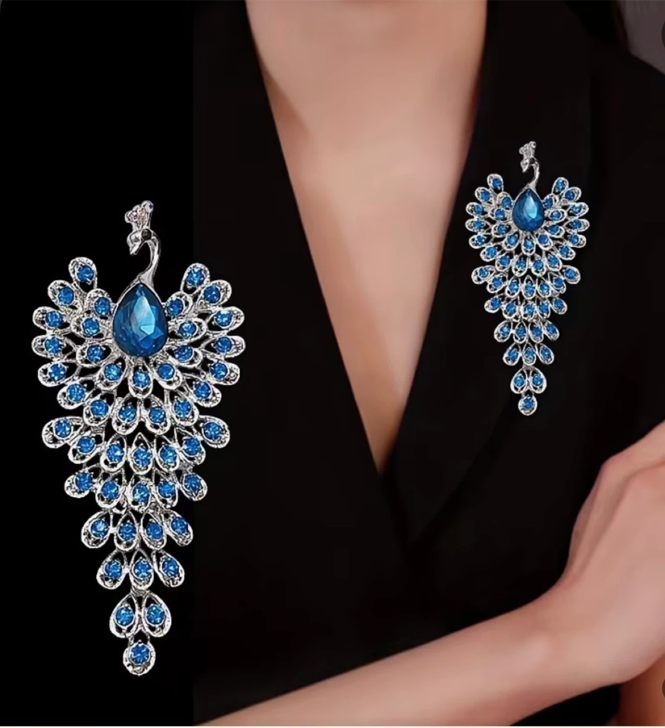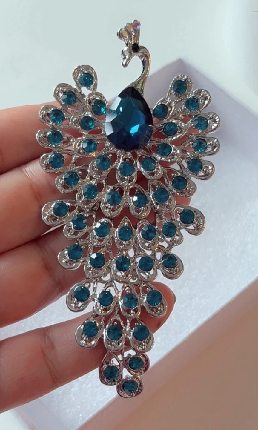 Beautiful peacock brooch featuring silver detailing and blue accents! It's a unique piece and would make a lovely addition to any outfit or collection!