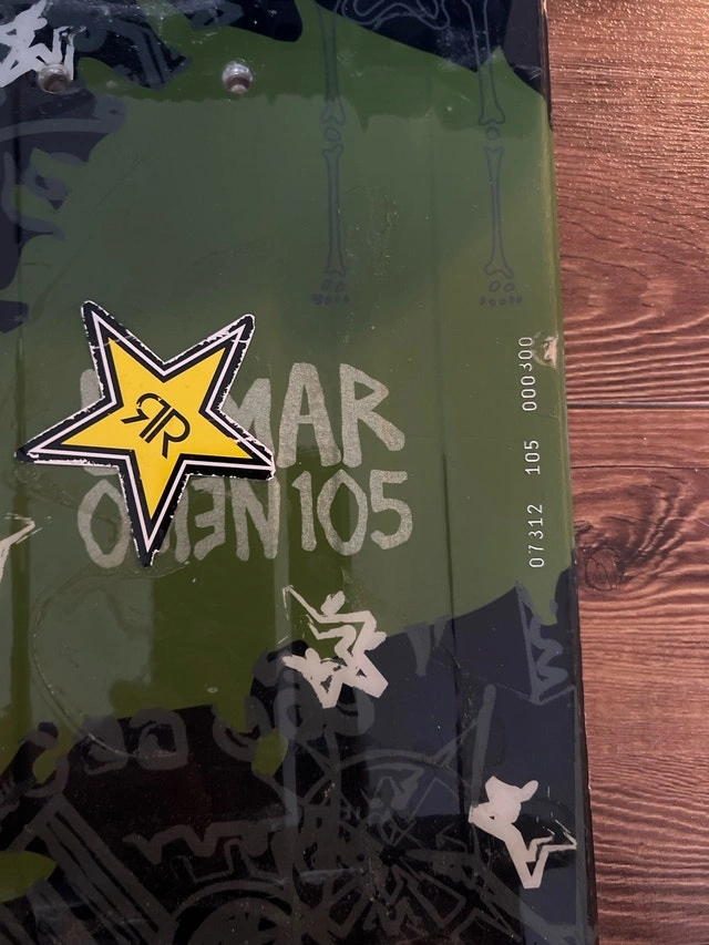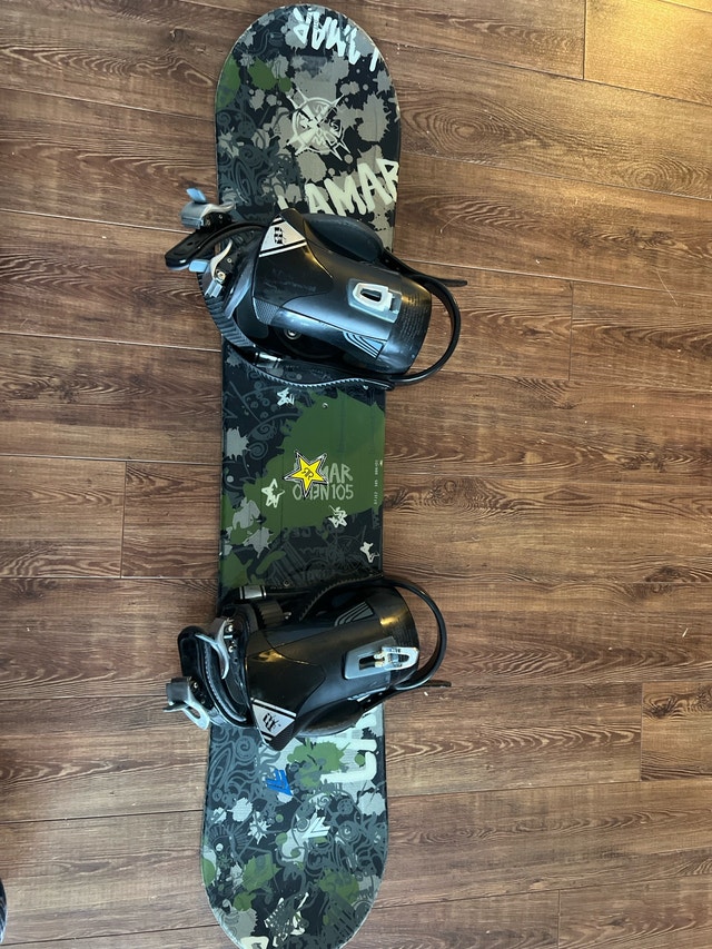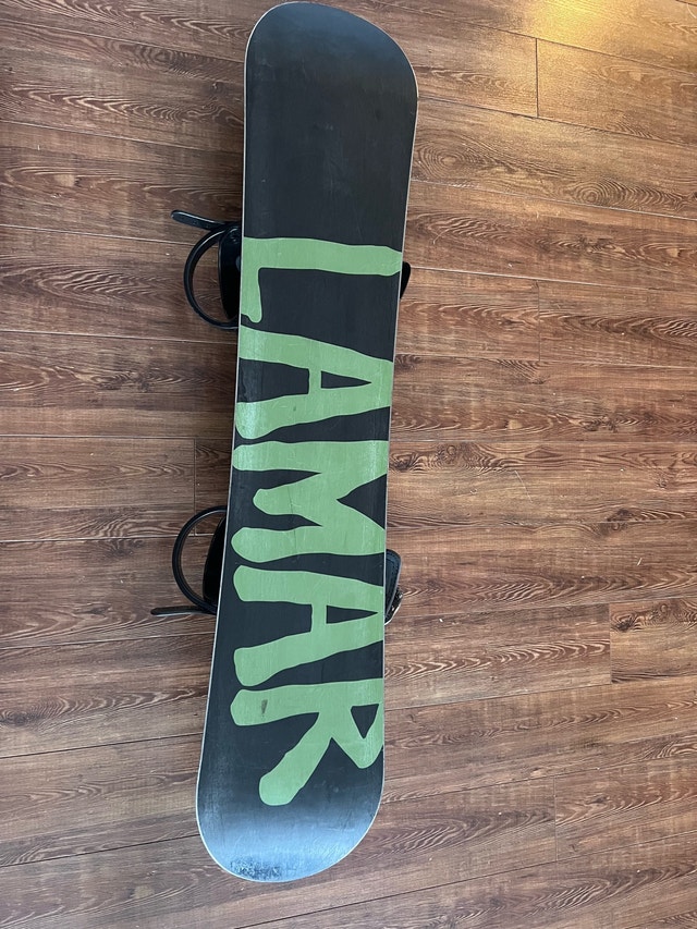 This is a Lamar snowboard with a length of 105cm, perfect for young riders. It's a used board but still has plenty of life left for hitting the slopes. The snowboard comes with bindings, making it ready to ride!