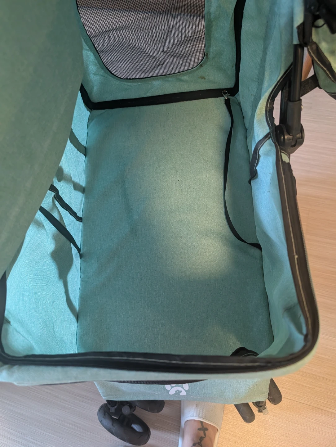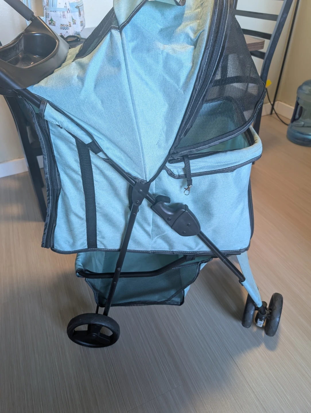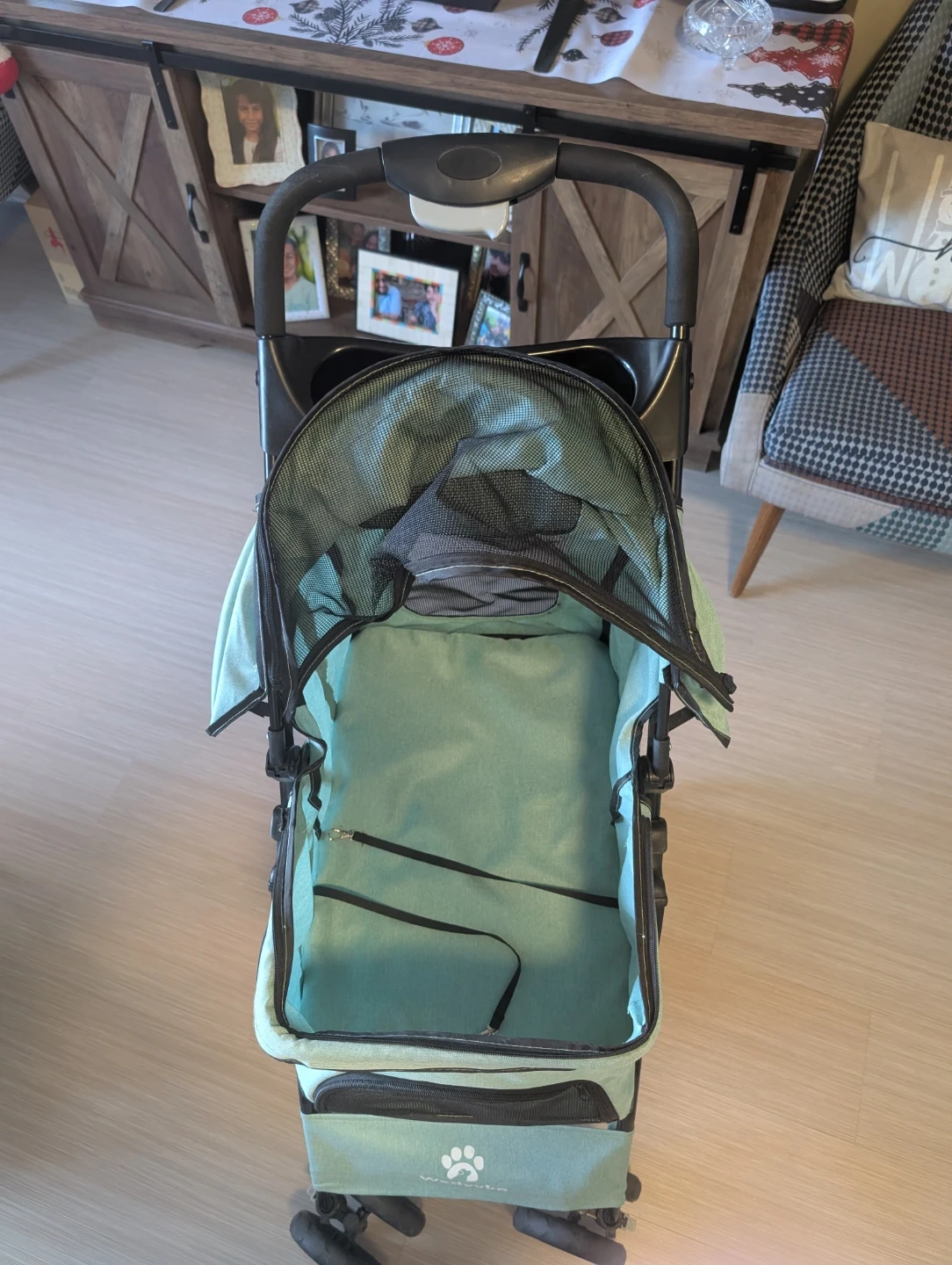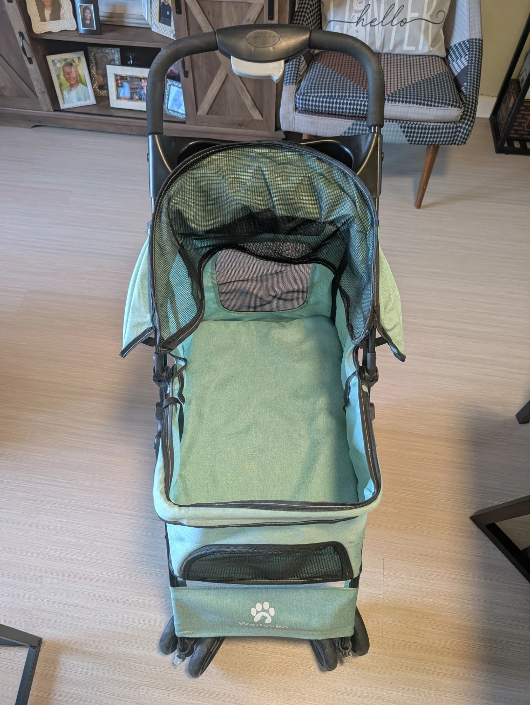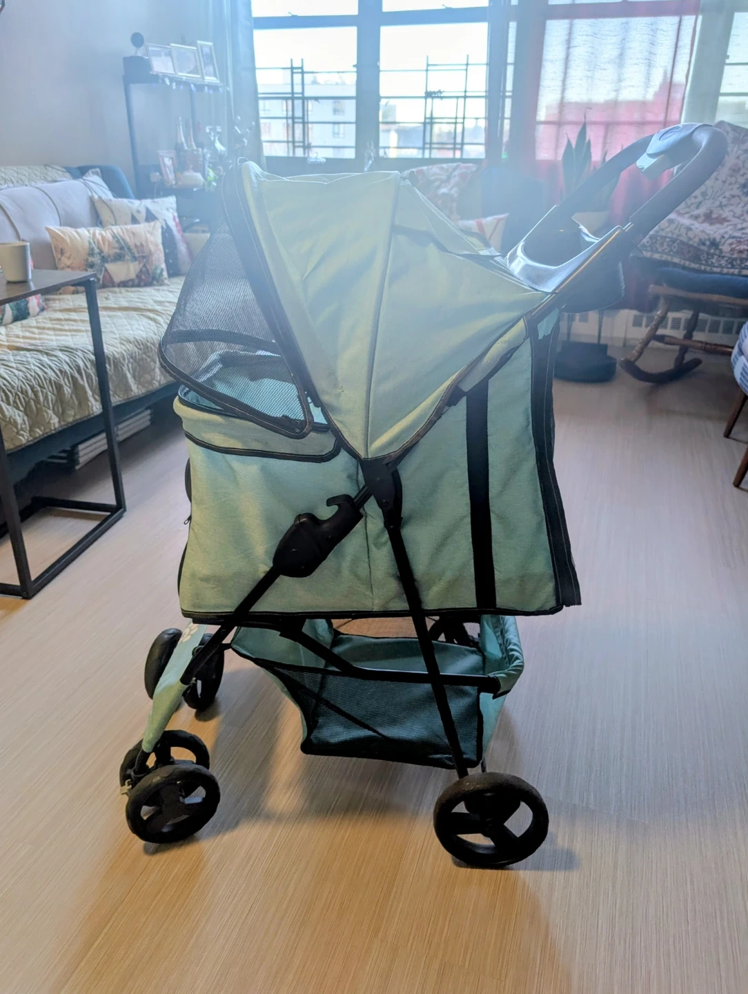 Selling a pet stroller in great condition! It's a lovely mint green color and looks like it's ready for some walks in the park. Perfect for your furry friend! For a small pet up to 30 lbs.